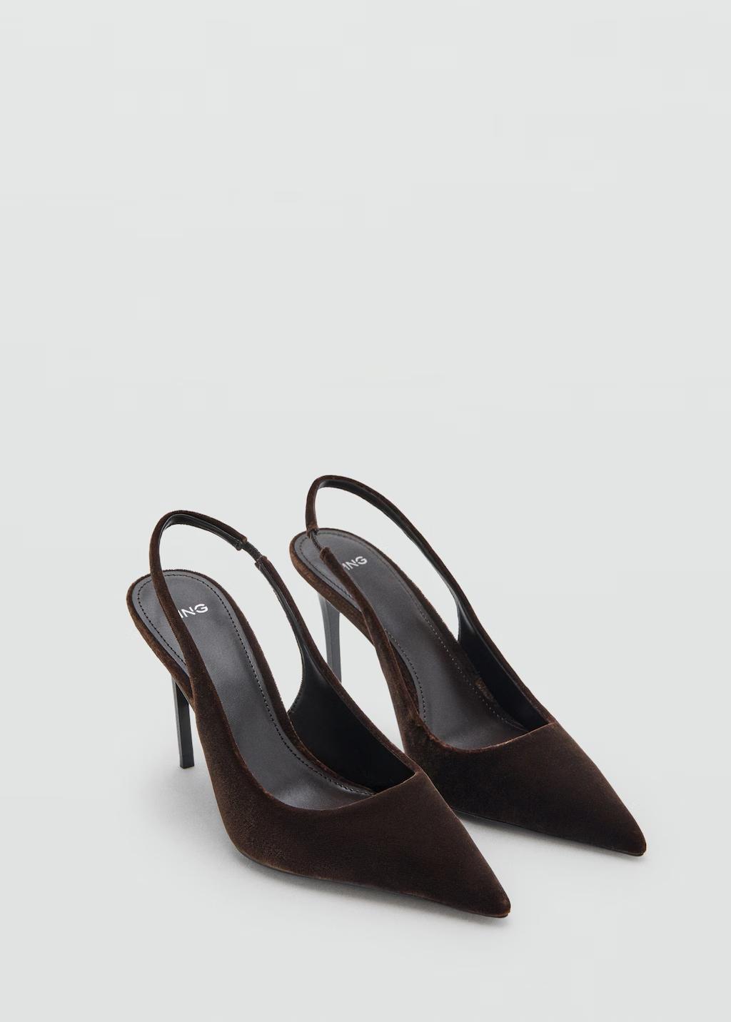 Tejido de terciopelo. Diseño destalonado. Con punta. Tacón de aguja. Sin cierre. El tacón mide 10 cm