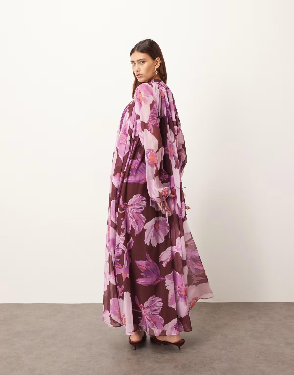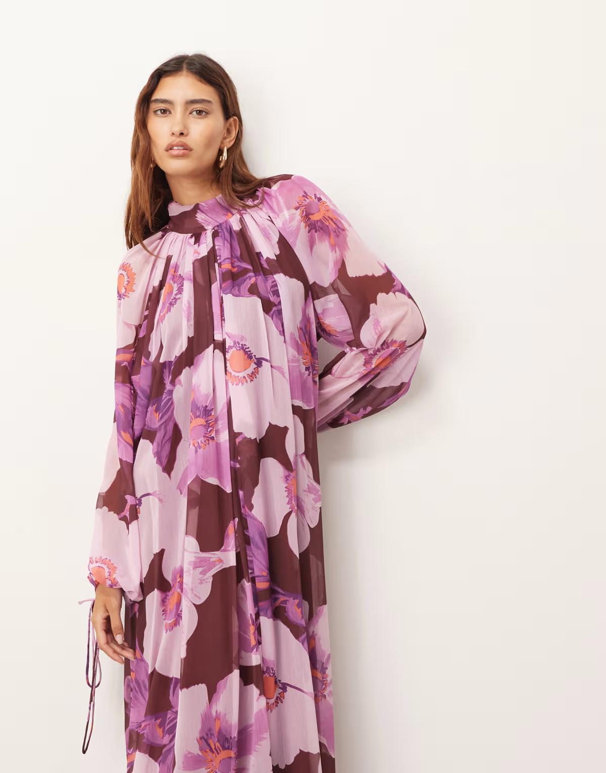 ARRANGE chiffon trapeze maxi dress with balloon sleeves in burgundy floral