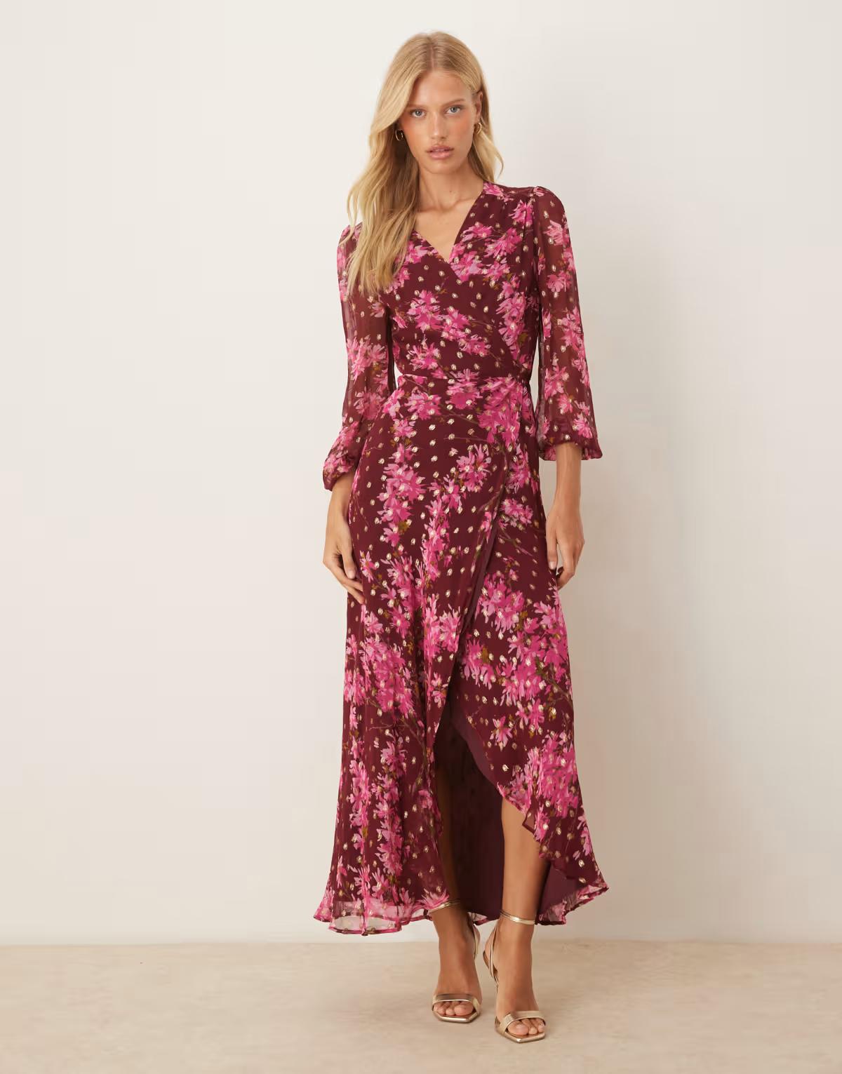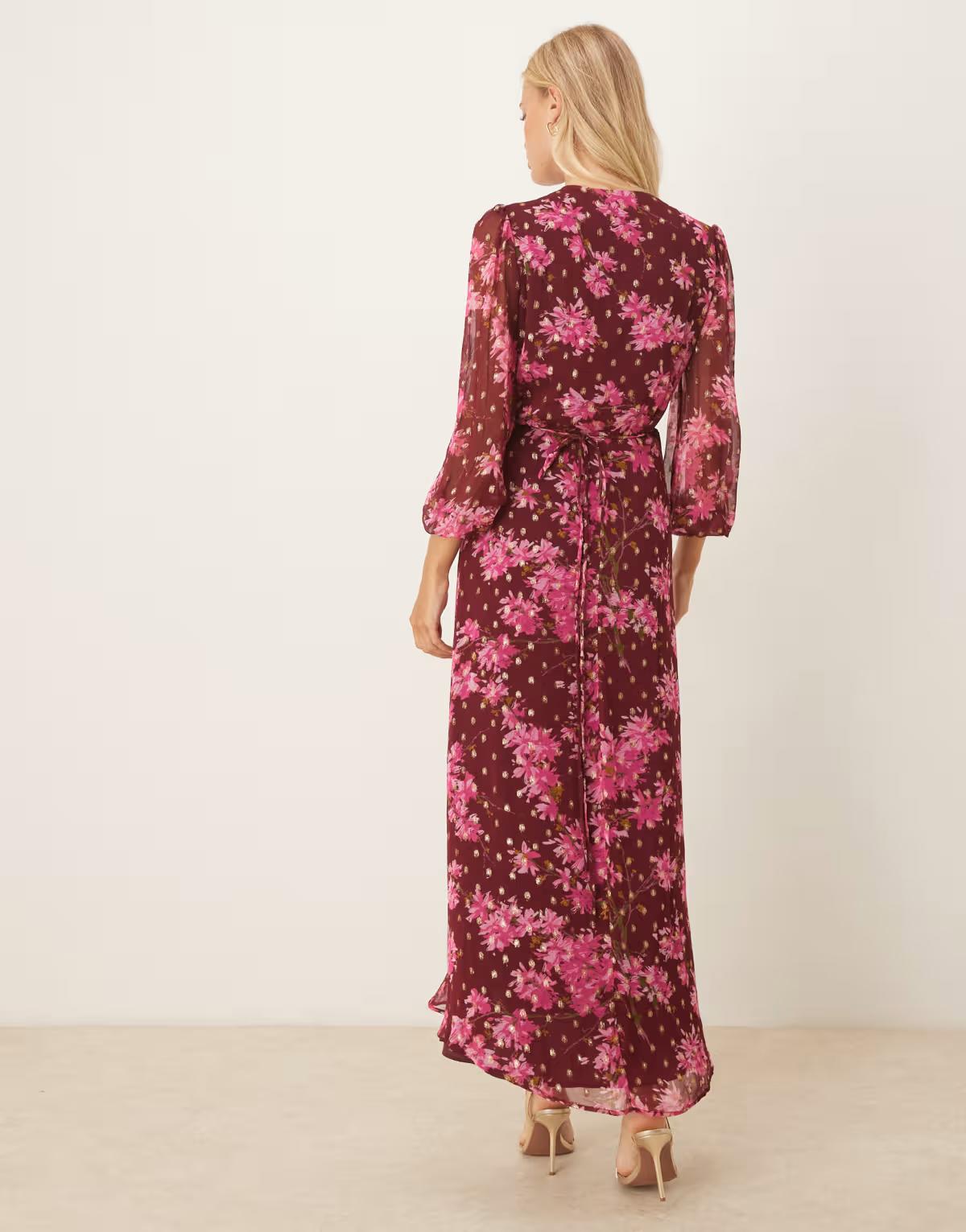 Hope & Ivy wrap front maxi dress in burgundy and pink floral