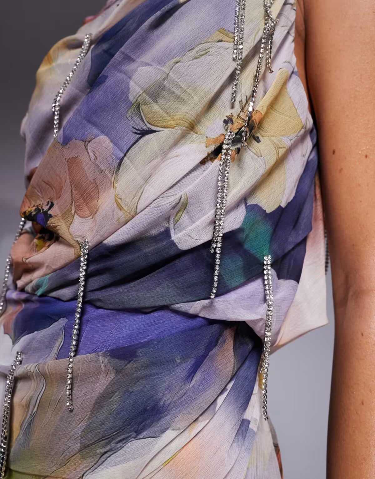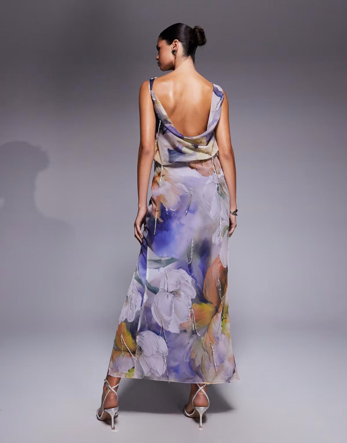 ASOS DESIGN slash neck chiffon midi dress with chain diamante embellishment in dark floral print
