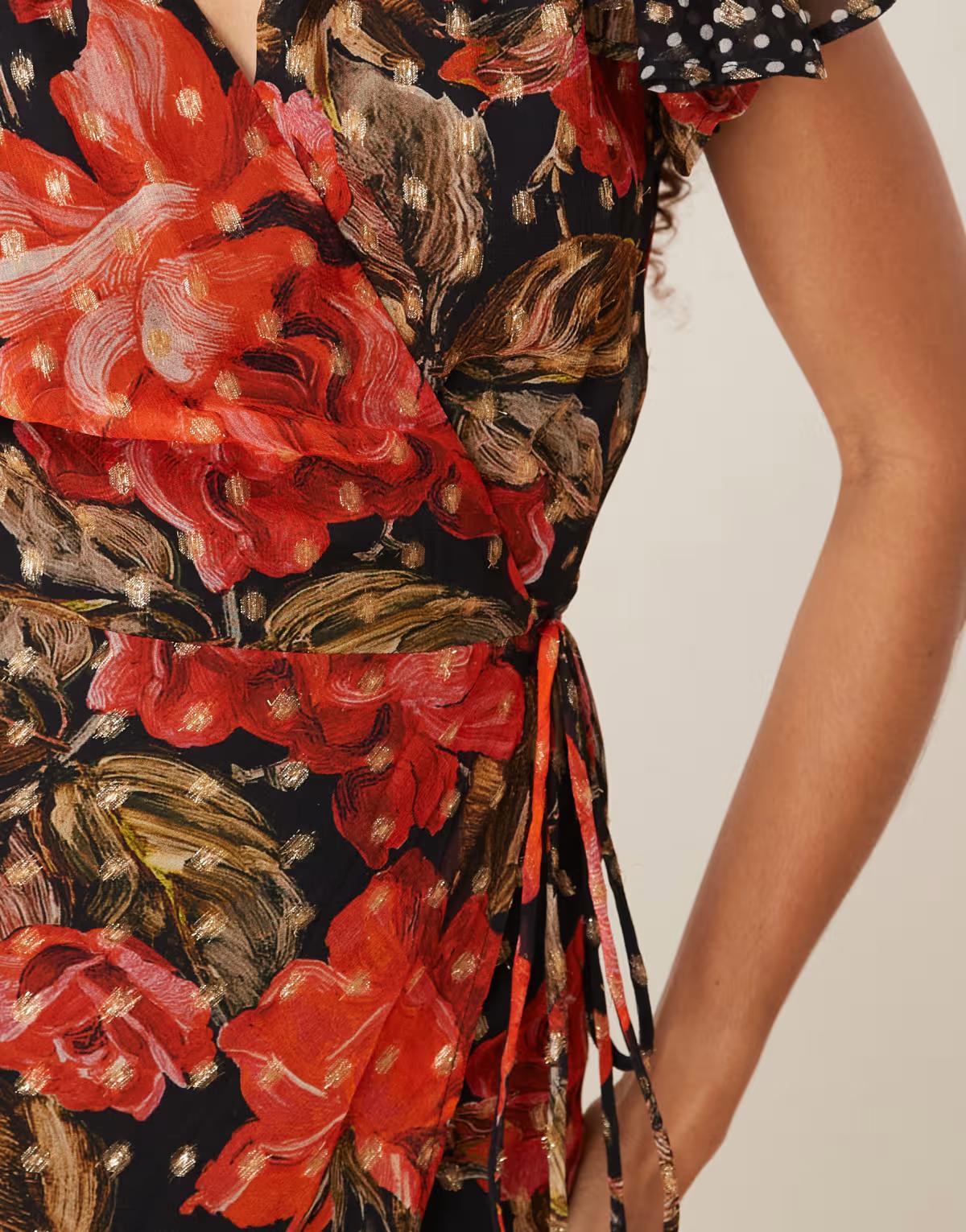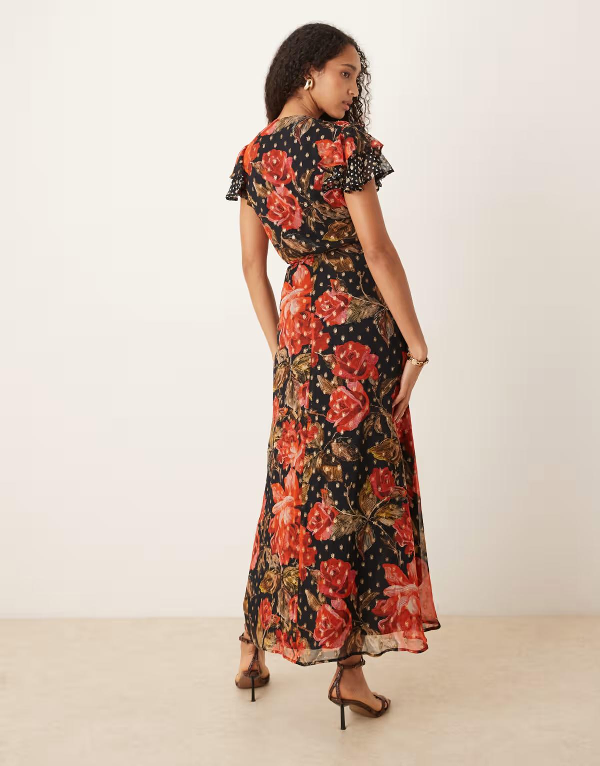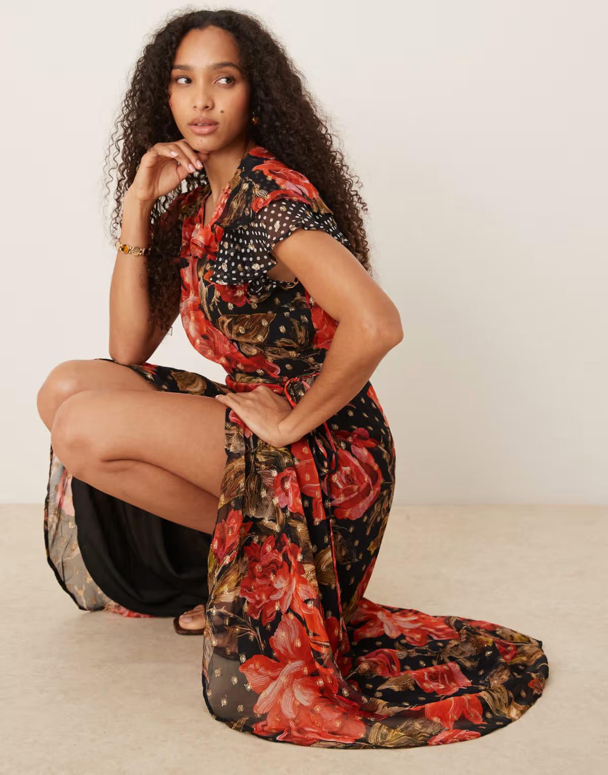 Hope & Ivy frill sleeve wrap front maxi dress in black and red floral