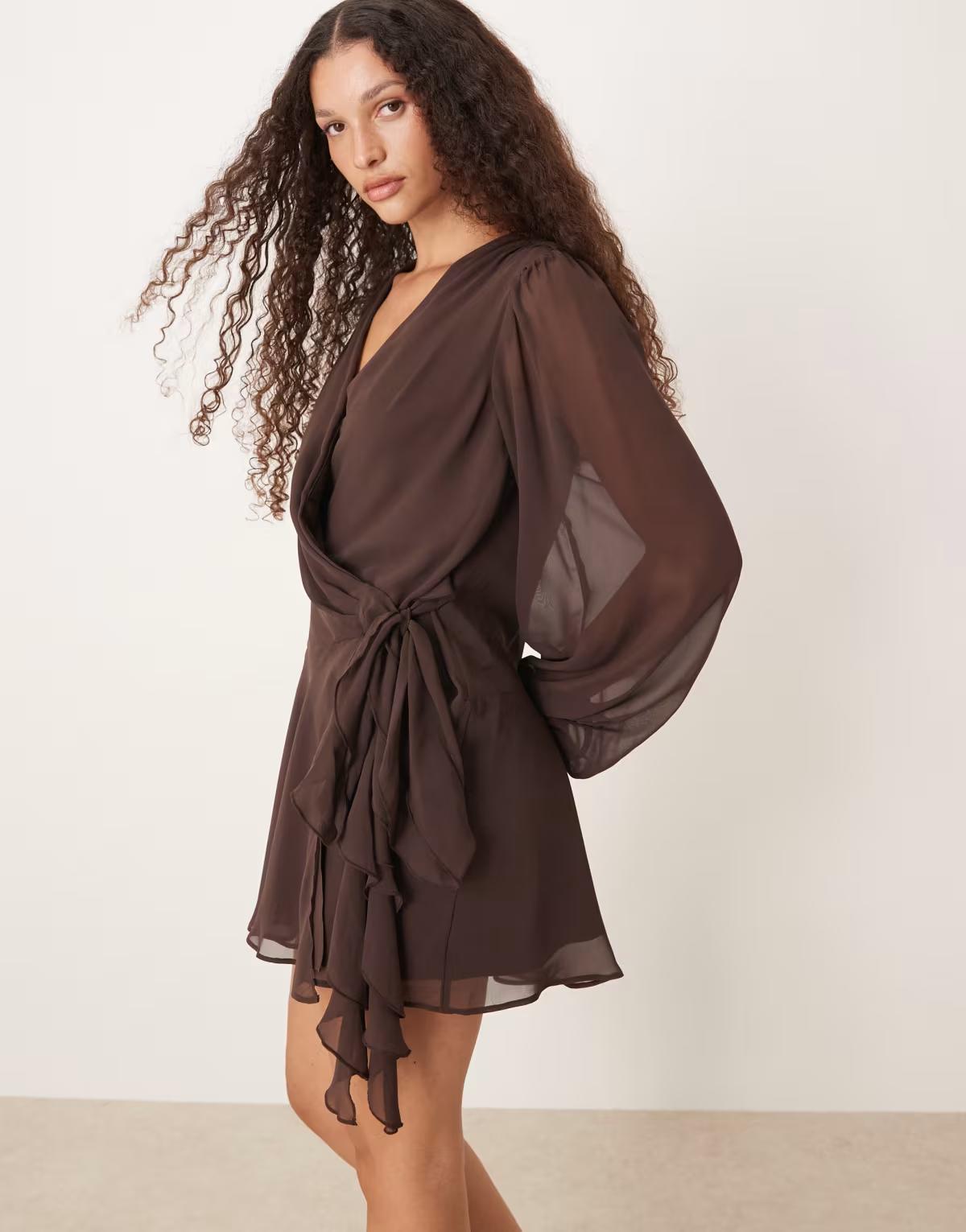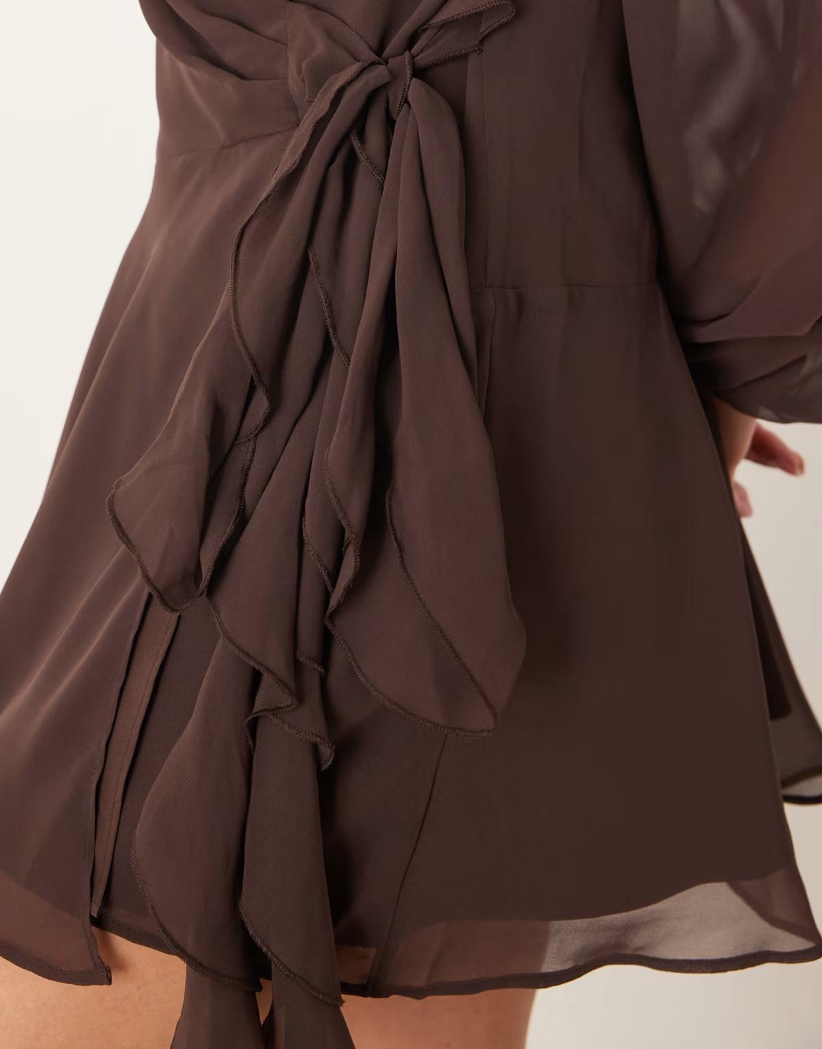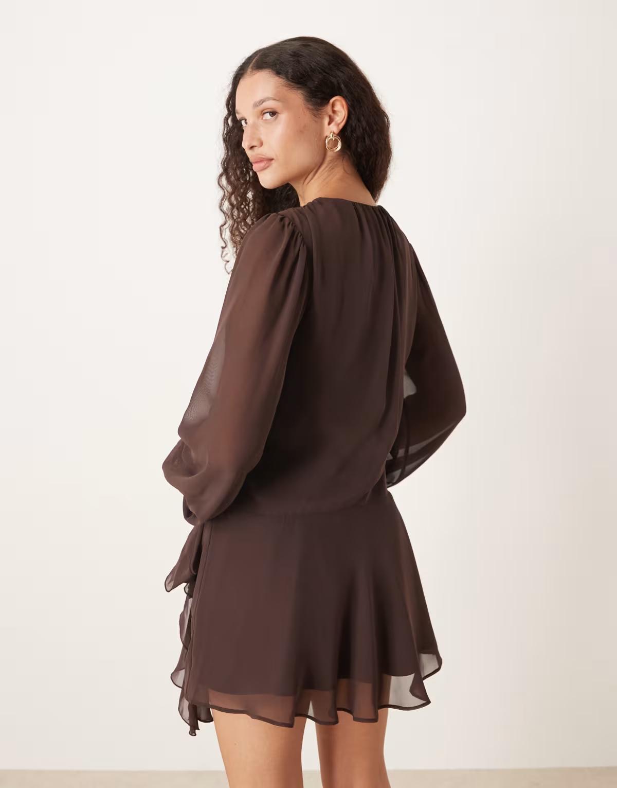 Abercrombie & Fitch long sleeve plunge neck wrap front mini dress in brown