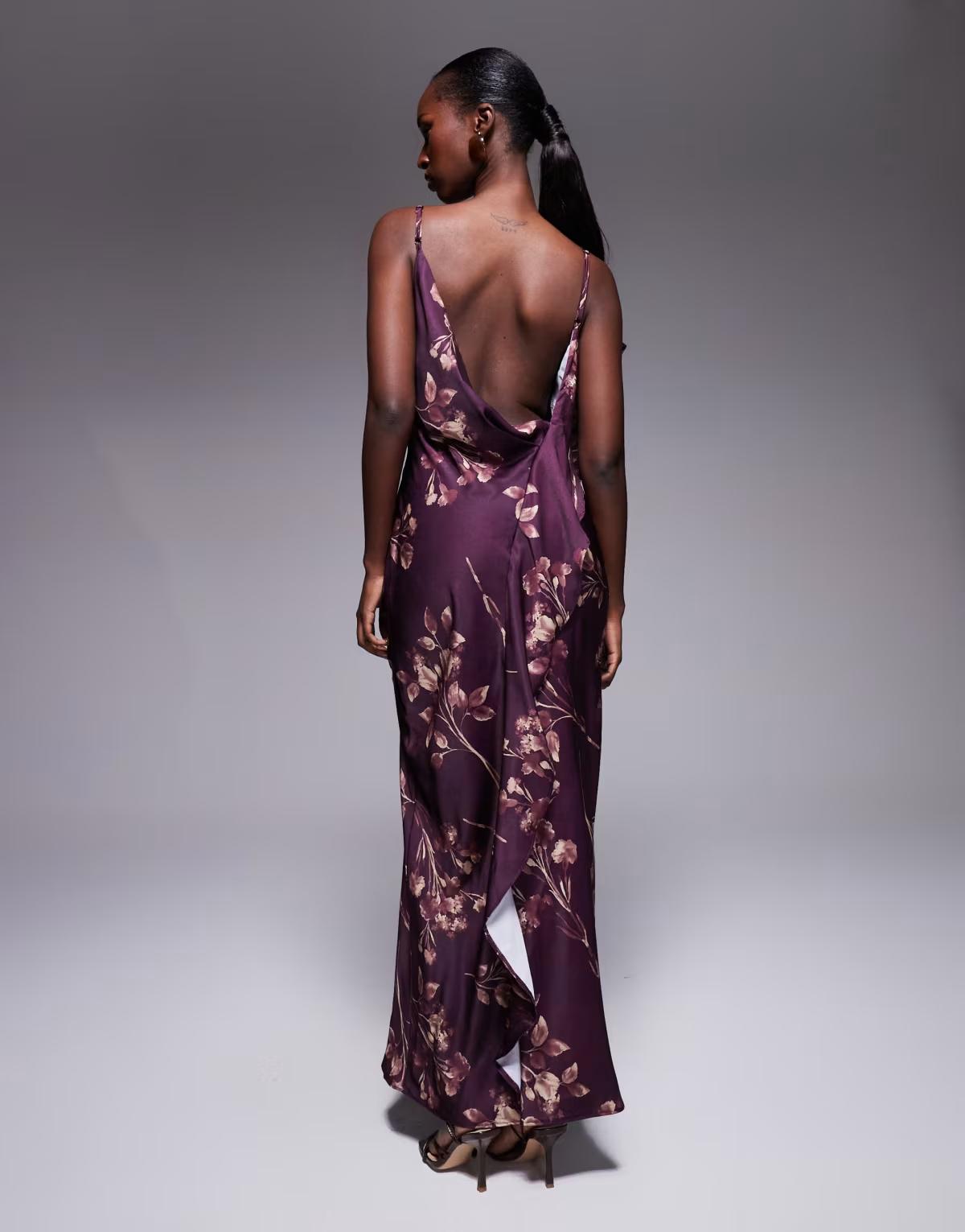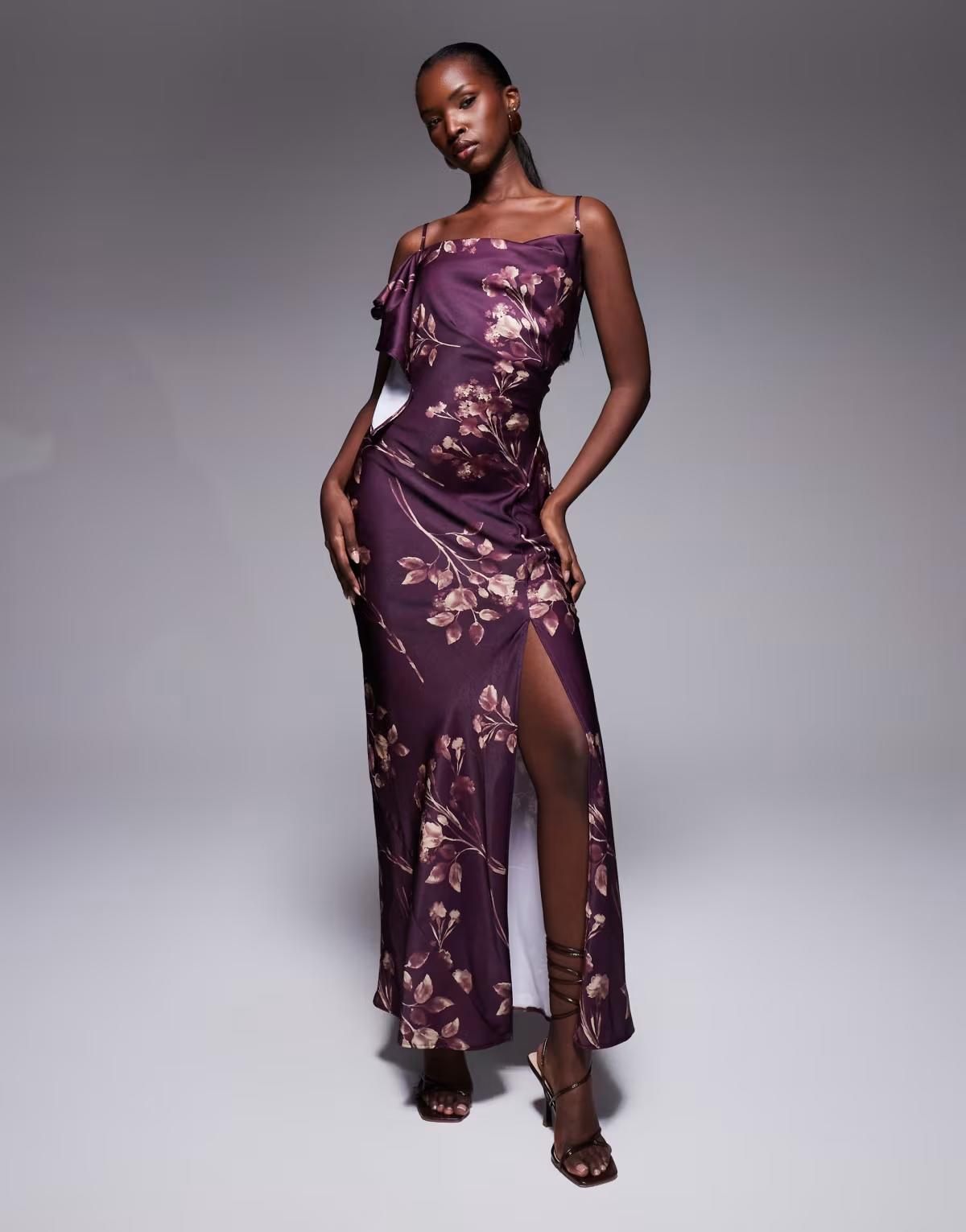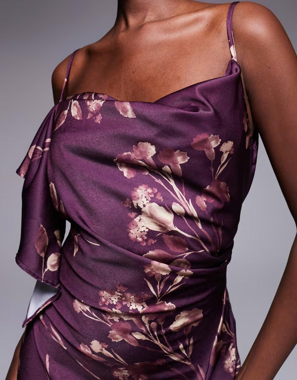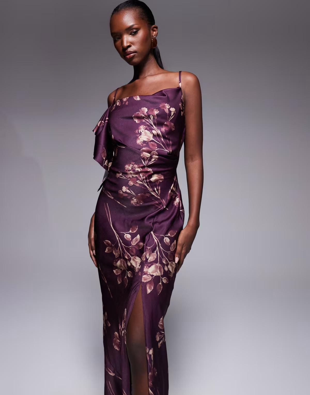 ASOS DESIGN satin drape ruffle detail midi dress with asymmetric back in burgundy floral print