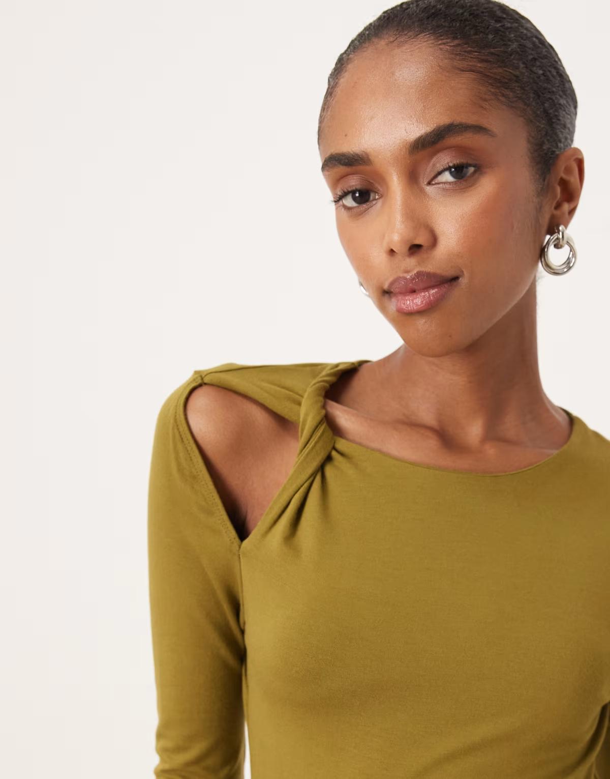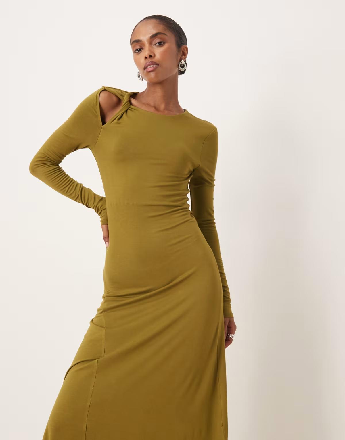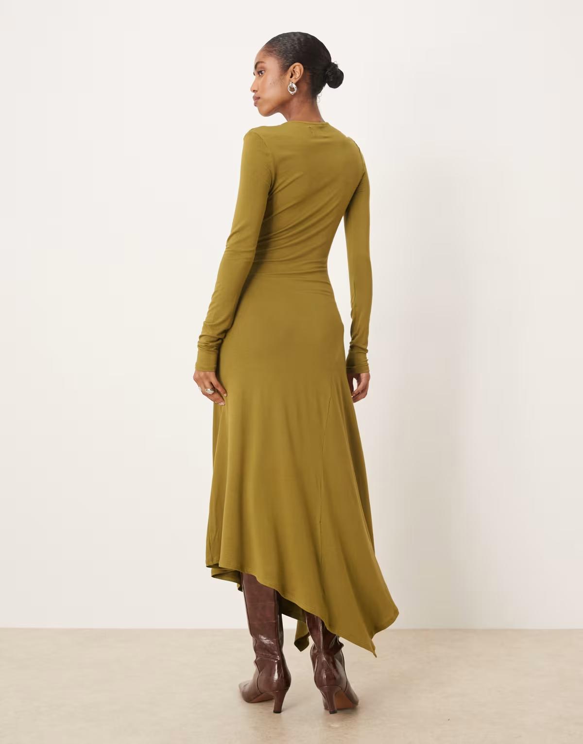 ASOS DESIGN twist neck asymmetric hem midi dress in khaki