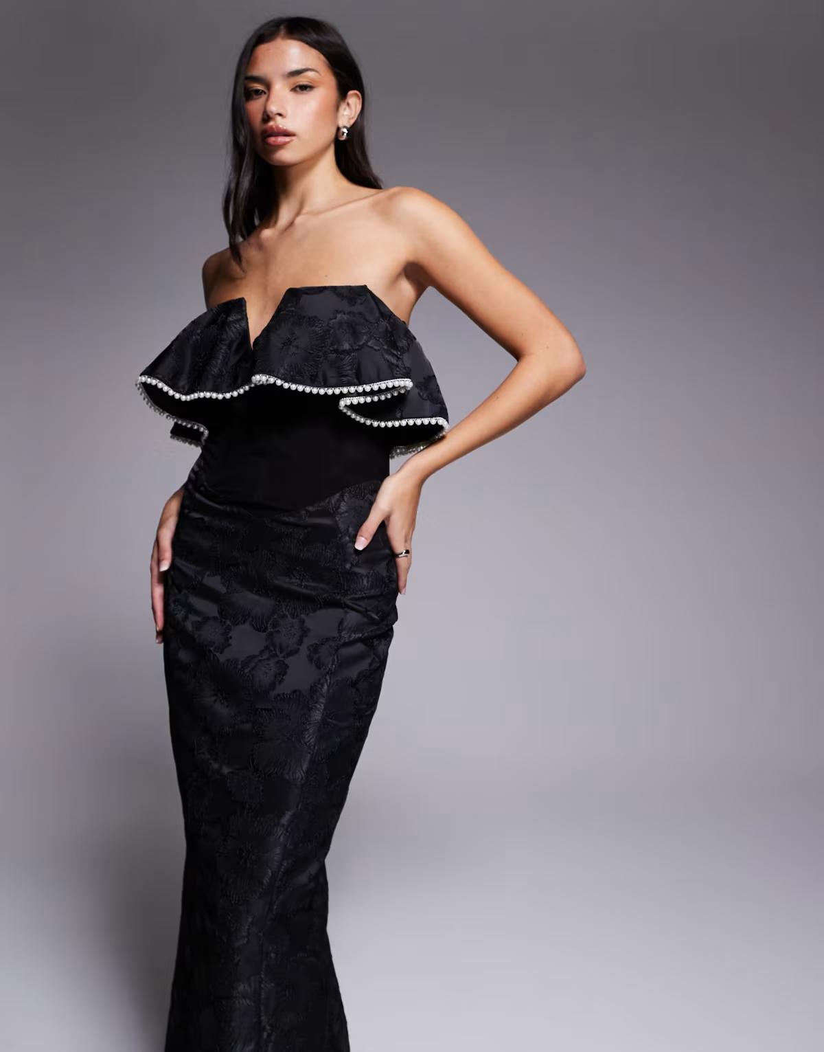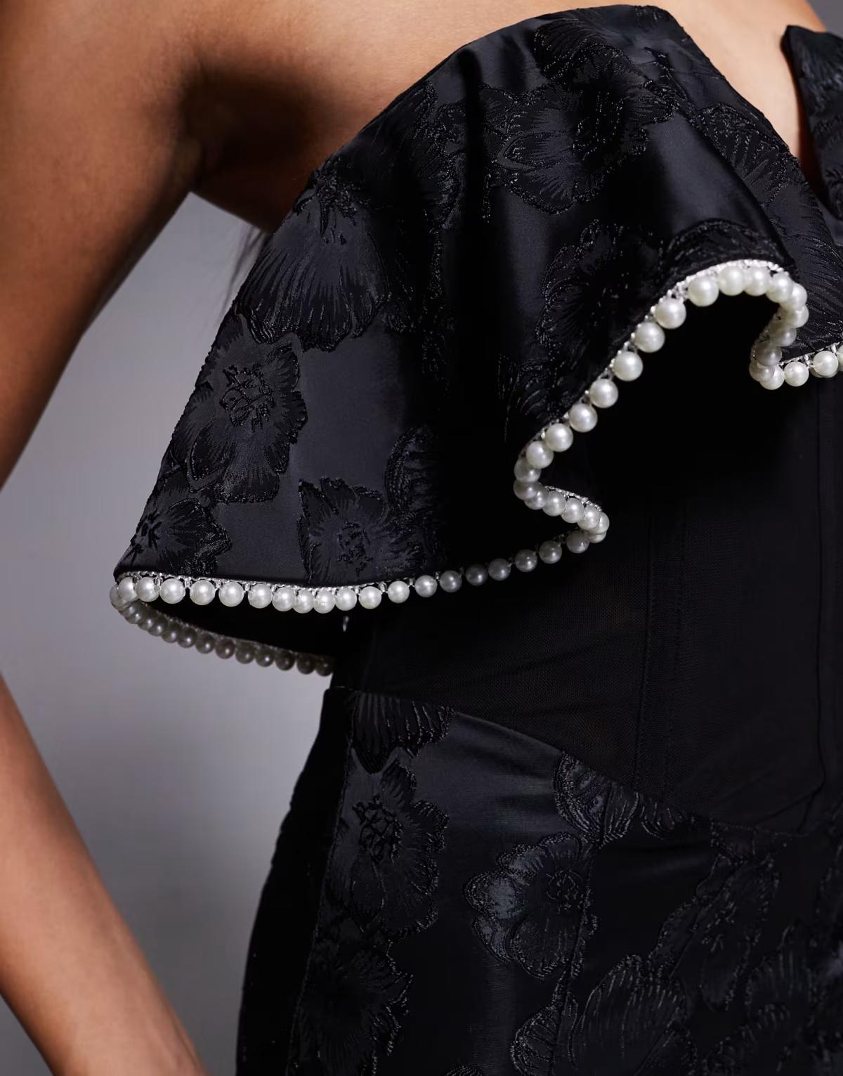 ASOS LUXE jacquard bardot midi dress with pearl trim in black