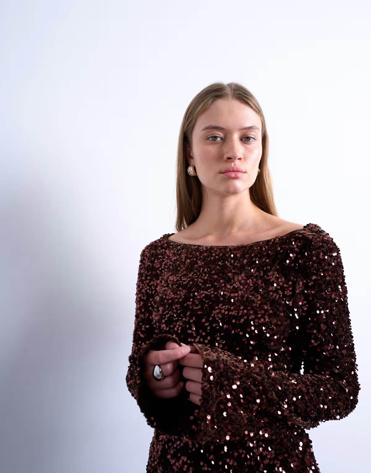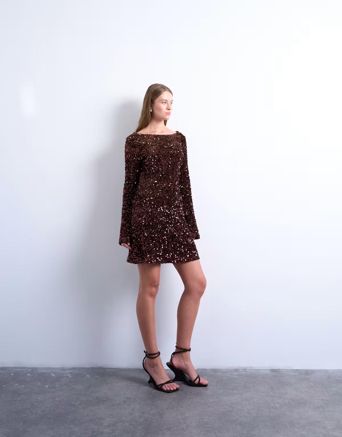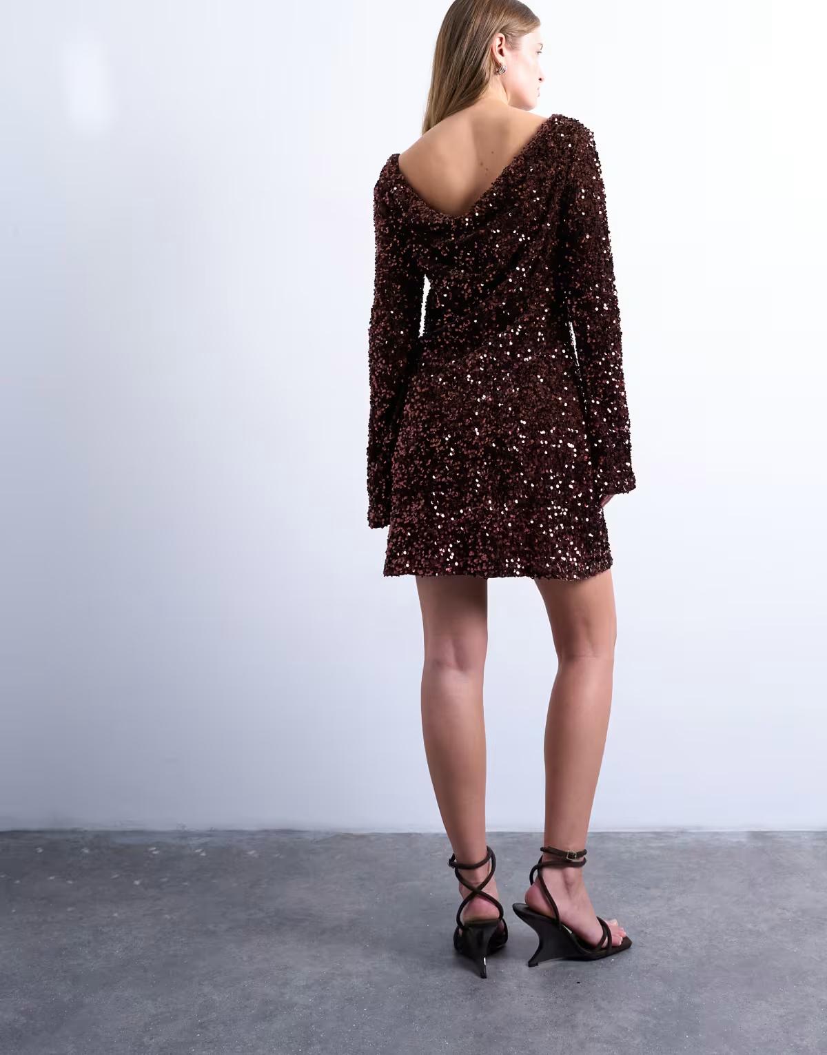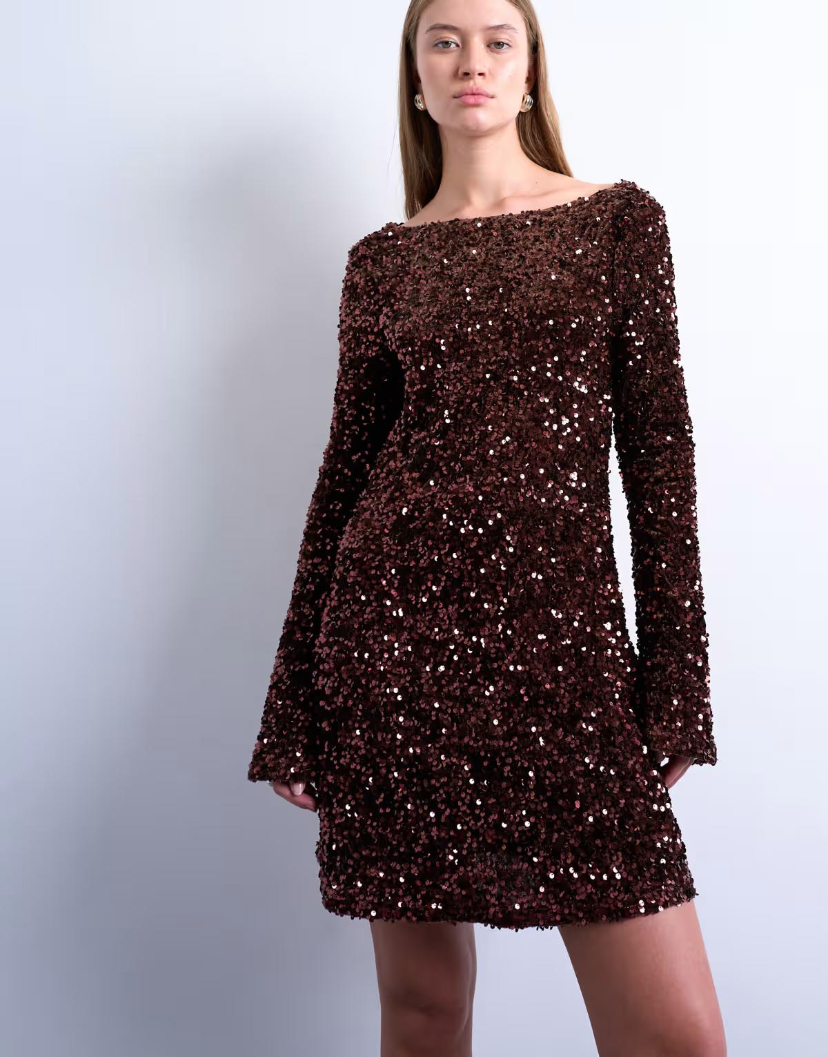 Topshop longsleeve cowl back mini sequin velvet dress in chocolate
