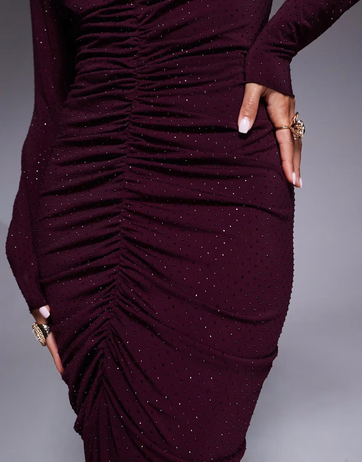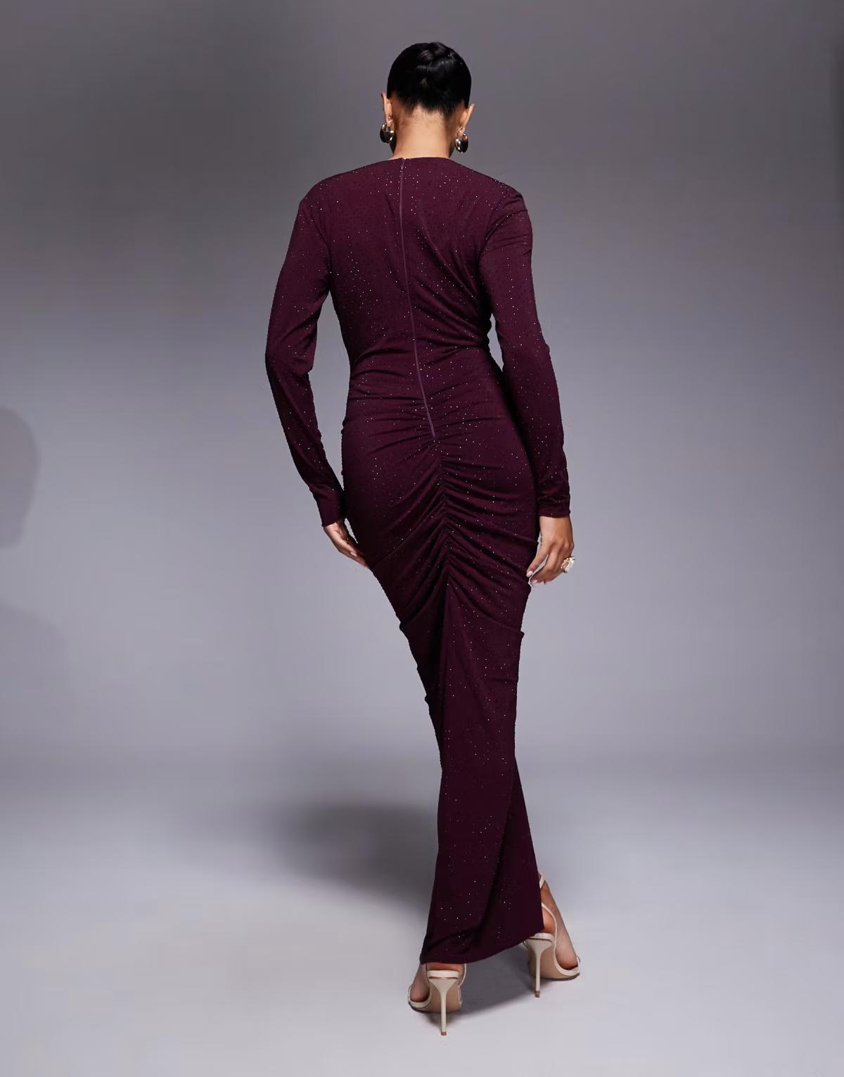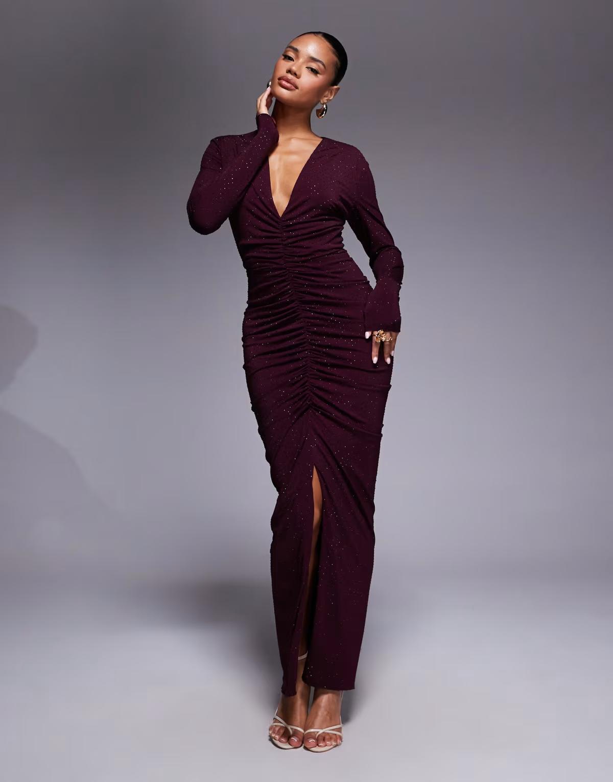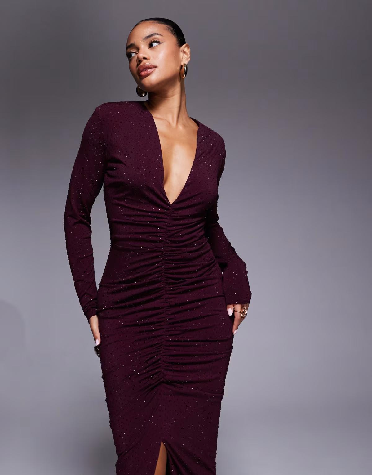 TFNC plunge neck embellished maxi dress with front split in cherry