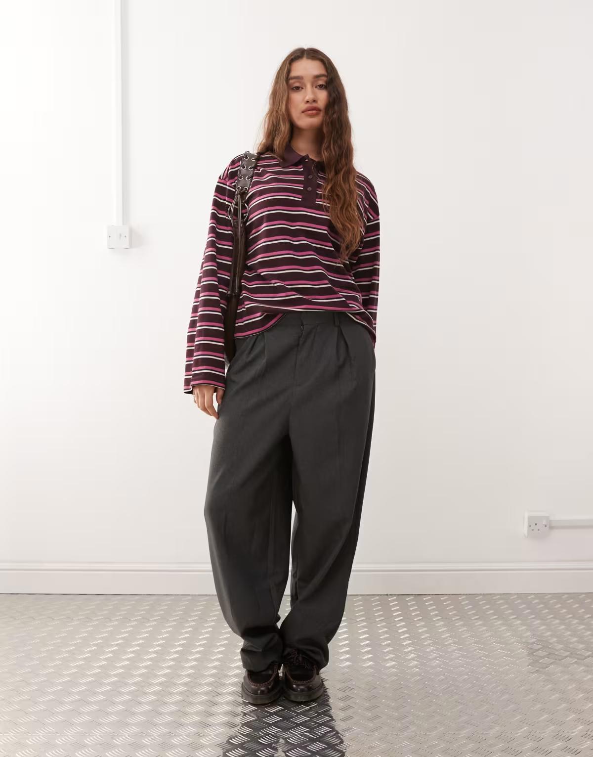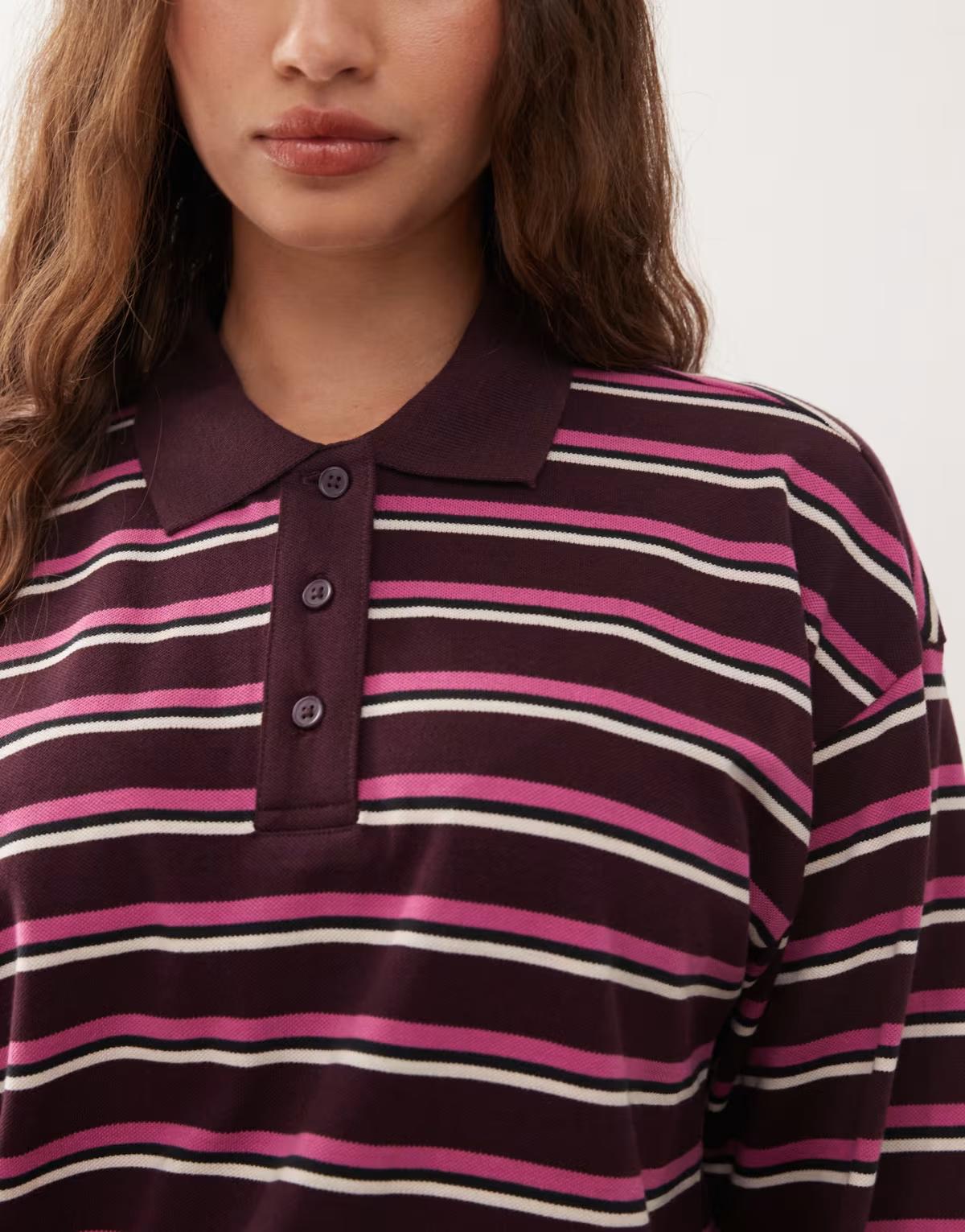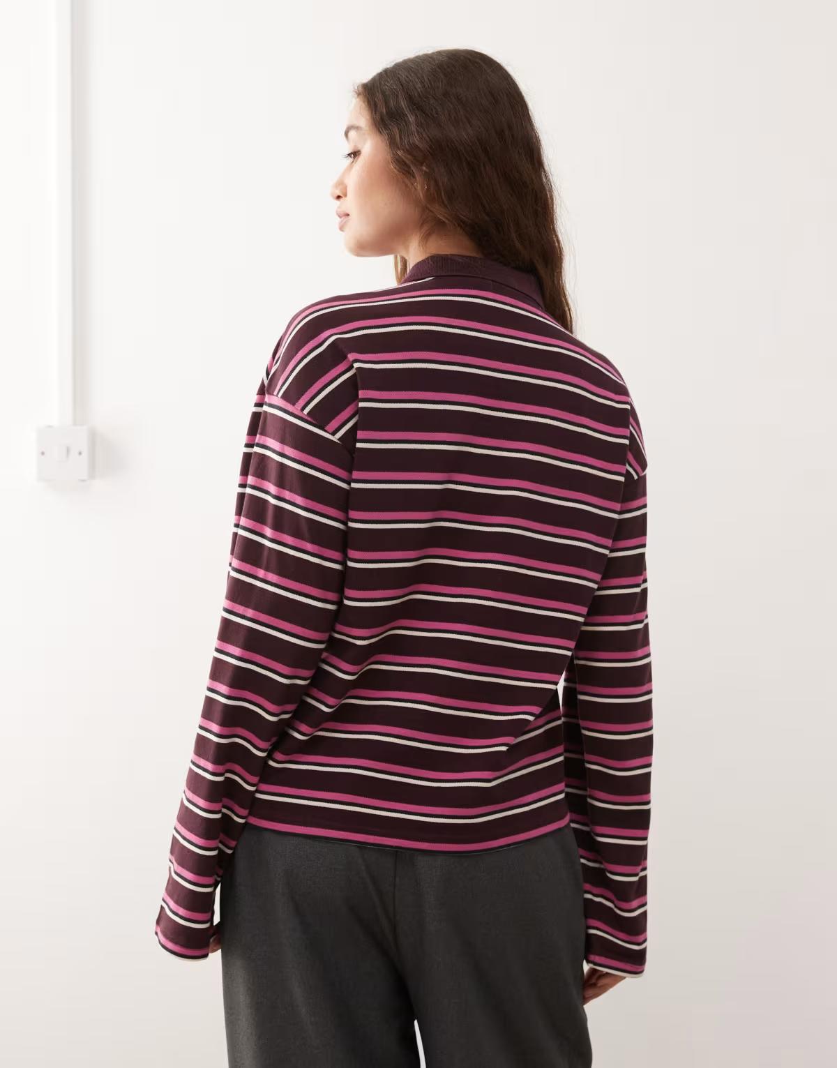 Monki long sleeve oversized rugby polo in burgundy and plum stripe