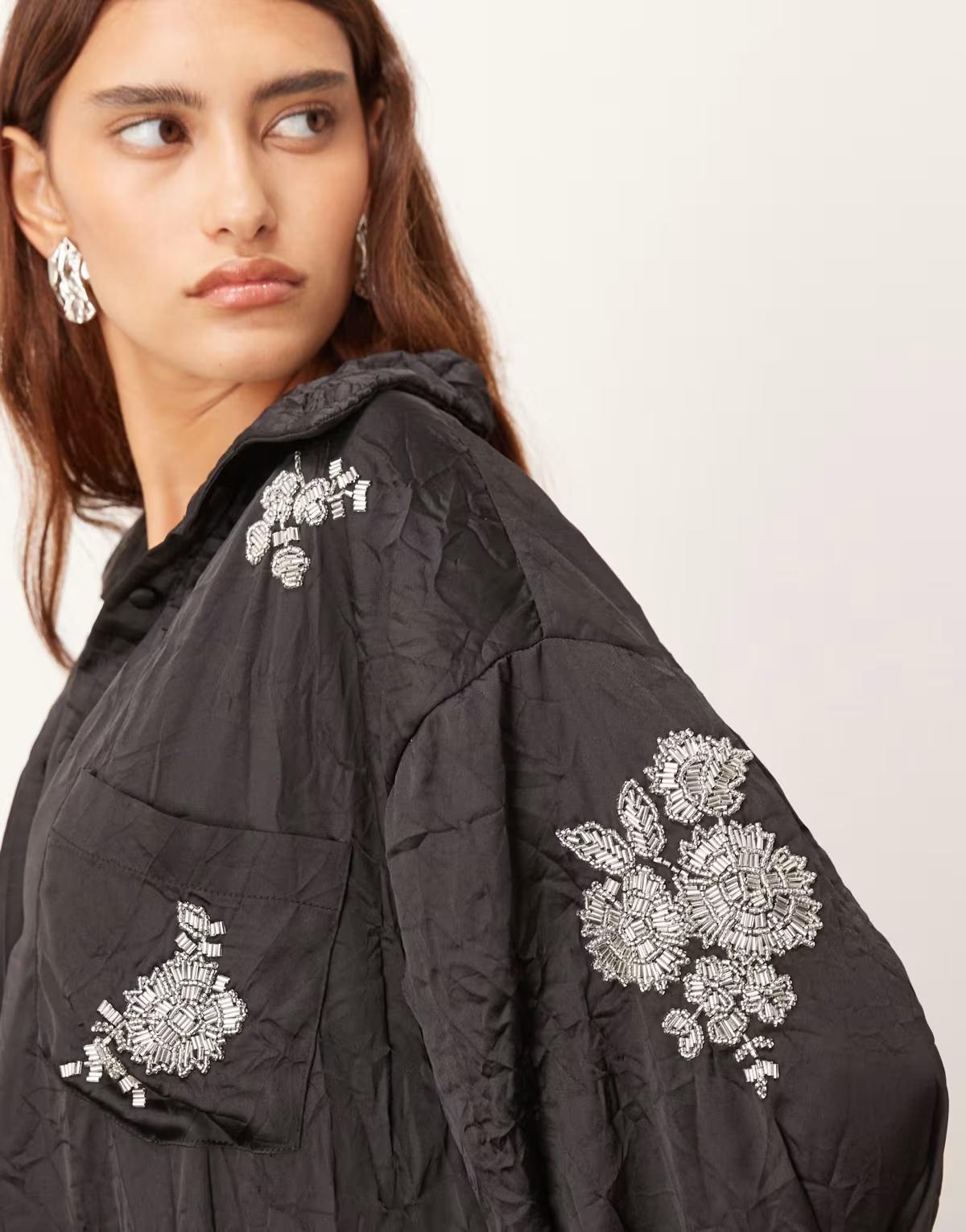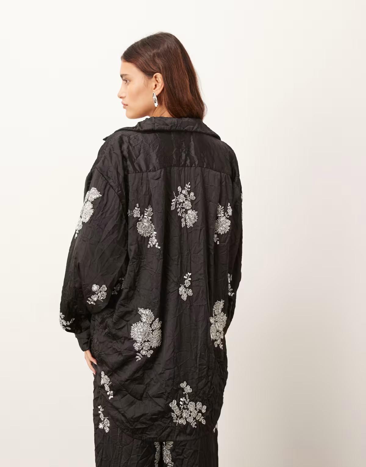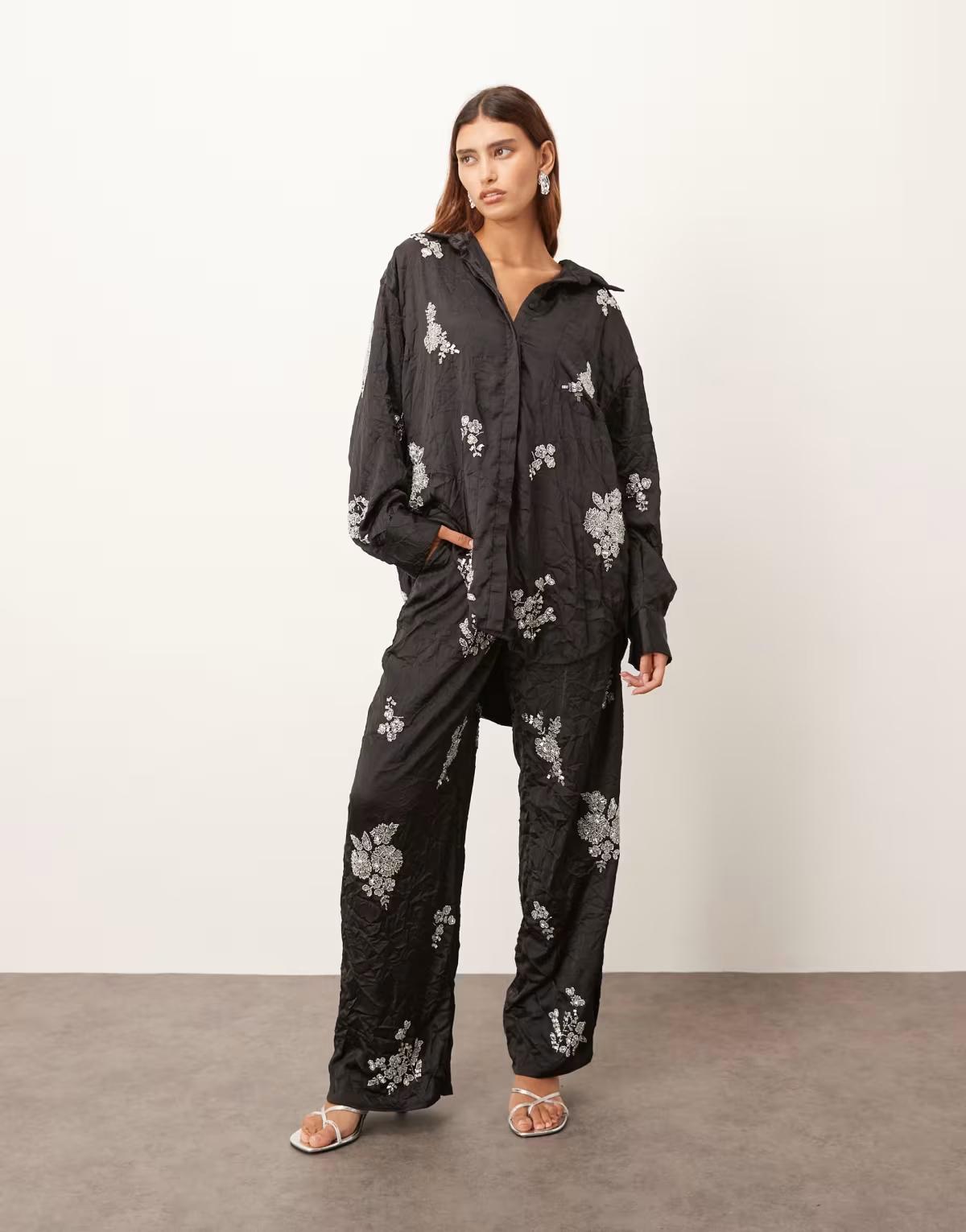 ARRANGE crinkle satin floral embellished shirt co-ord in black