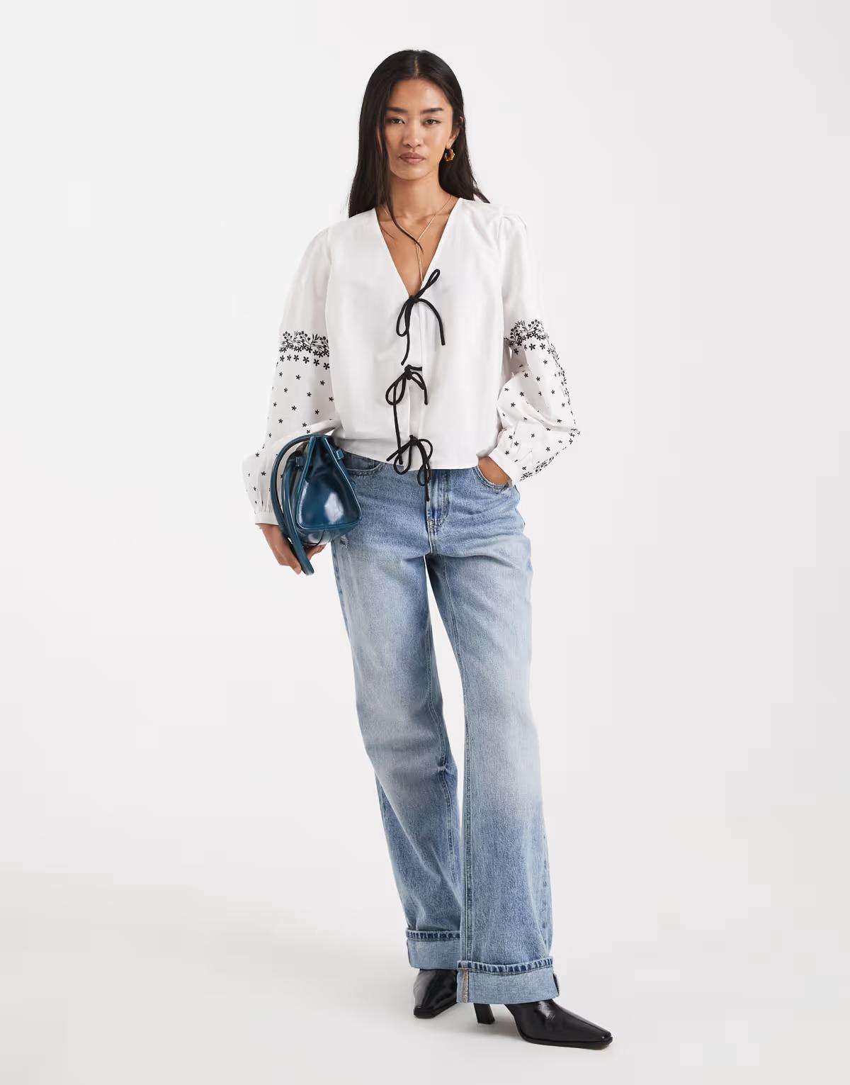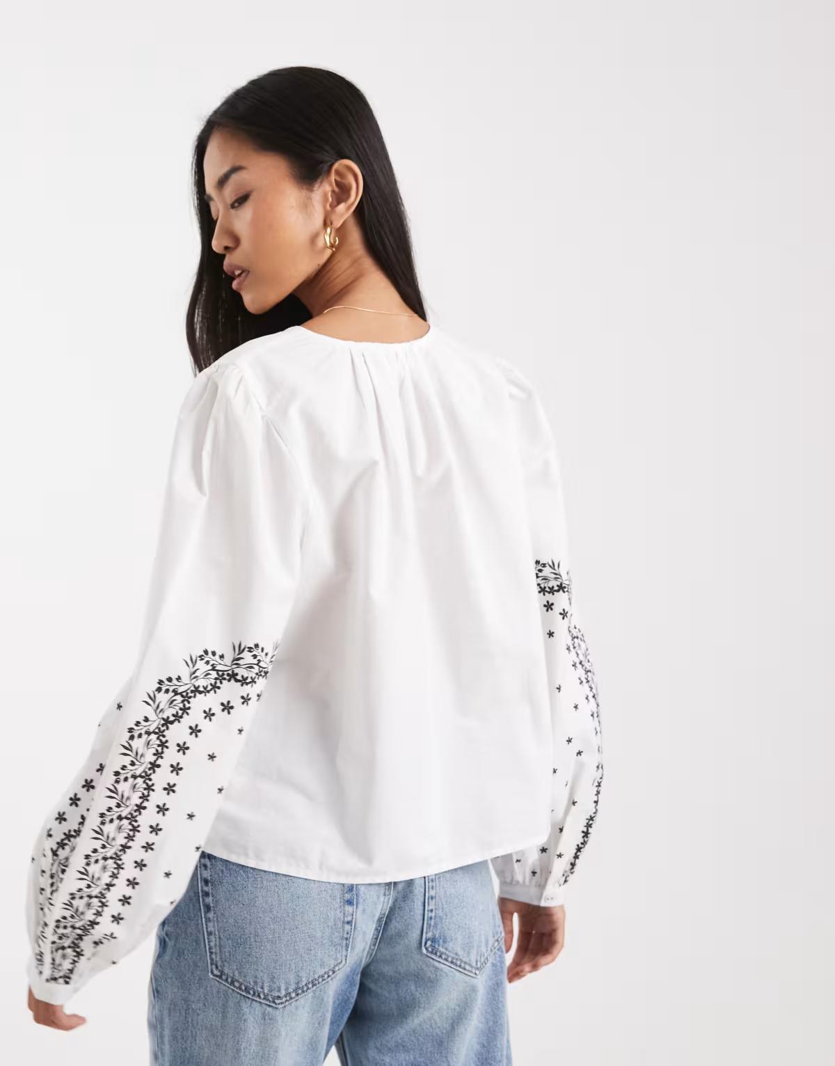 French Connection tie-detail shirt with lace printed sleeves in ivory