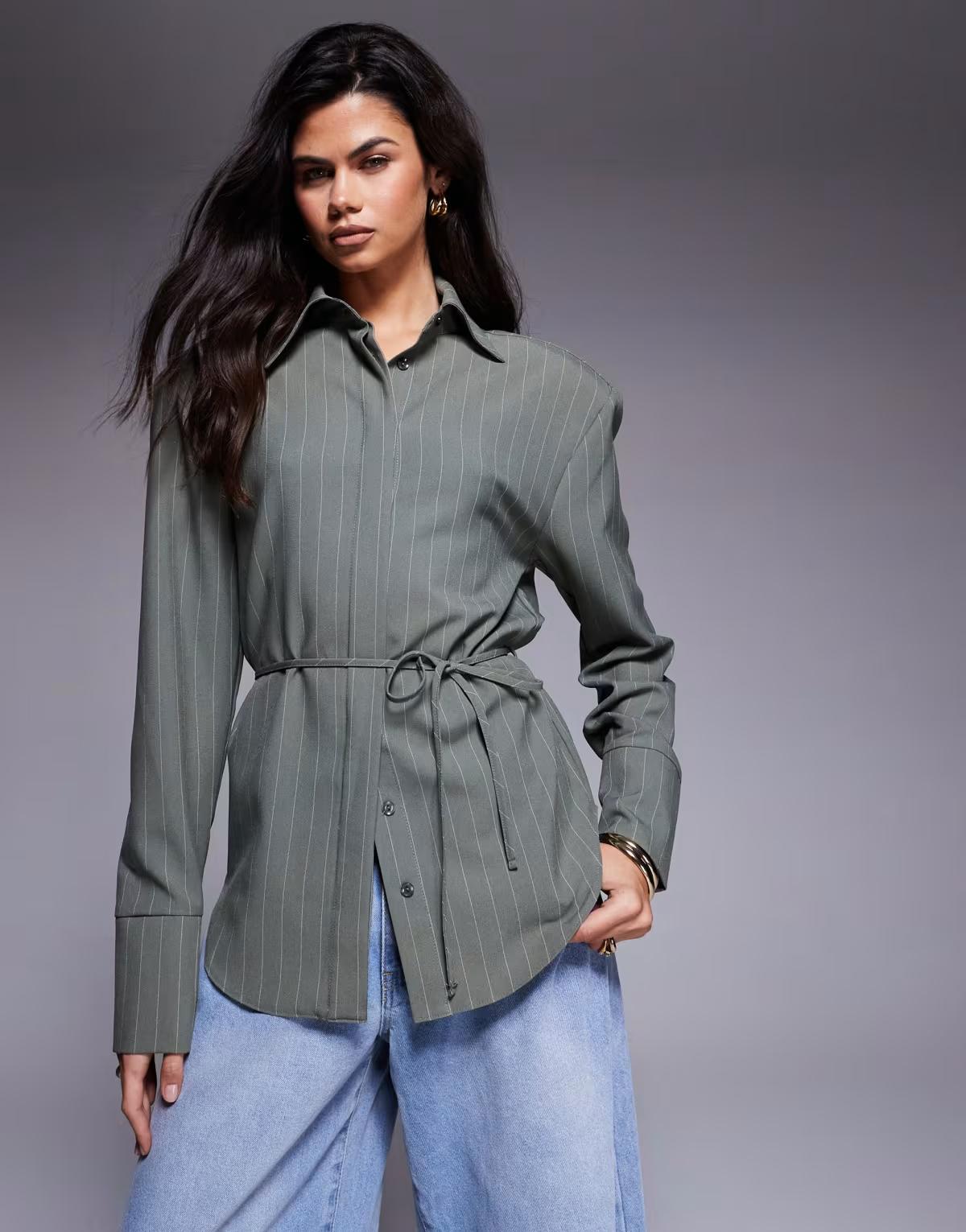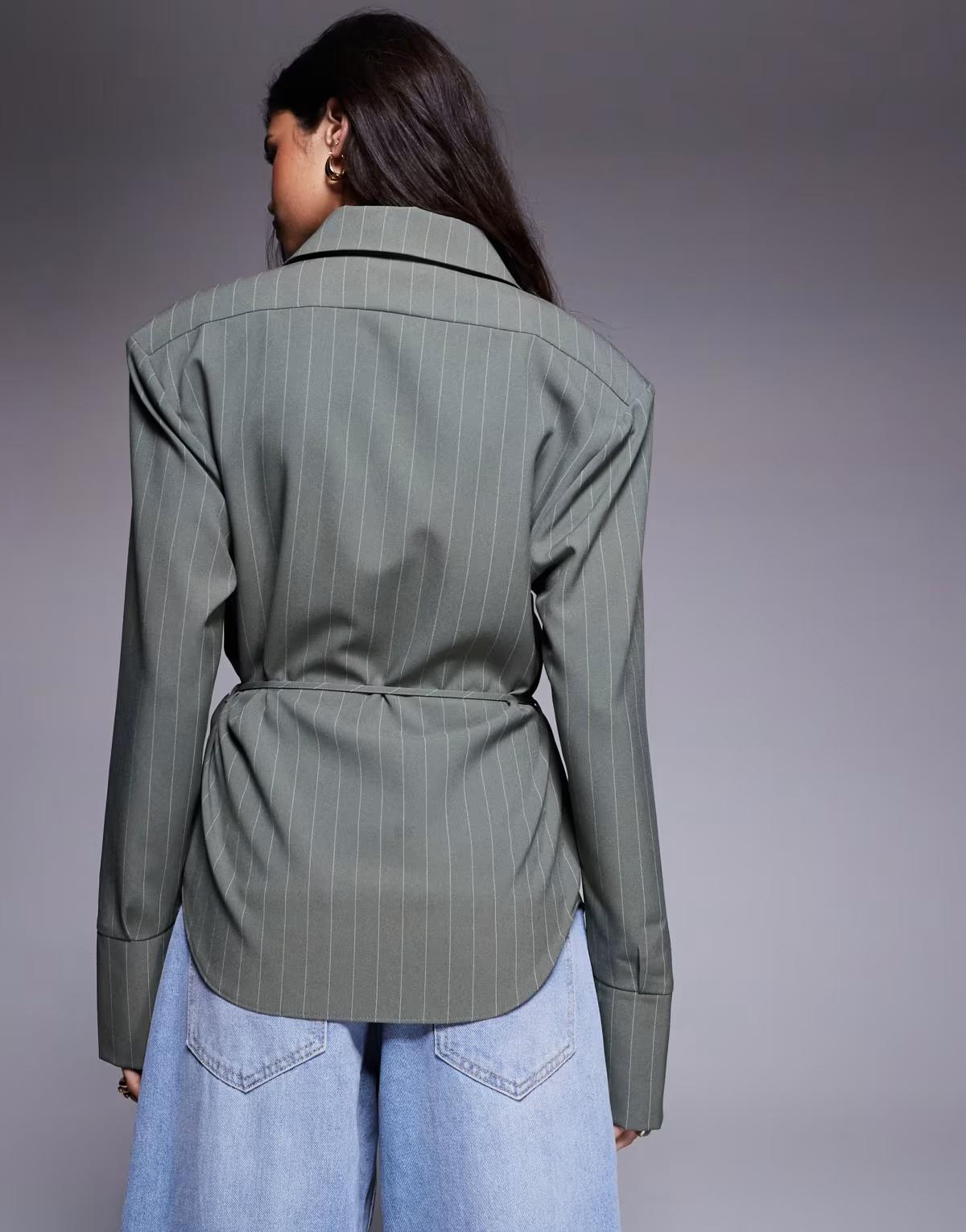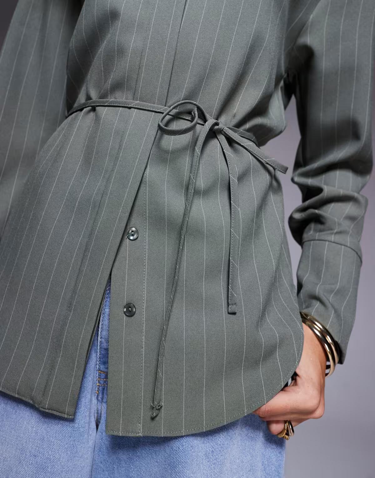 ASOS DESIGN shoulder pad tie back shirt in green pinstripe