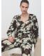 Confeccionada en tejido de gasa, esta prenda presenta un diseño recto con estampado floral. El cuello escotado se complementa con un cierre de lazo, mientras que las mangas largas tienen puños abotonados. Cuenta con un pantalón a conjunto