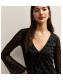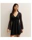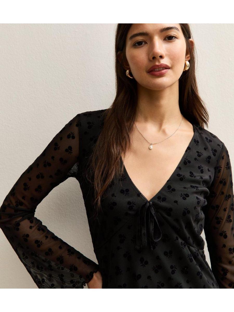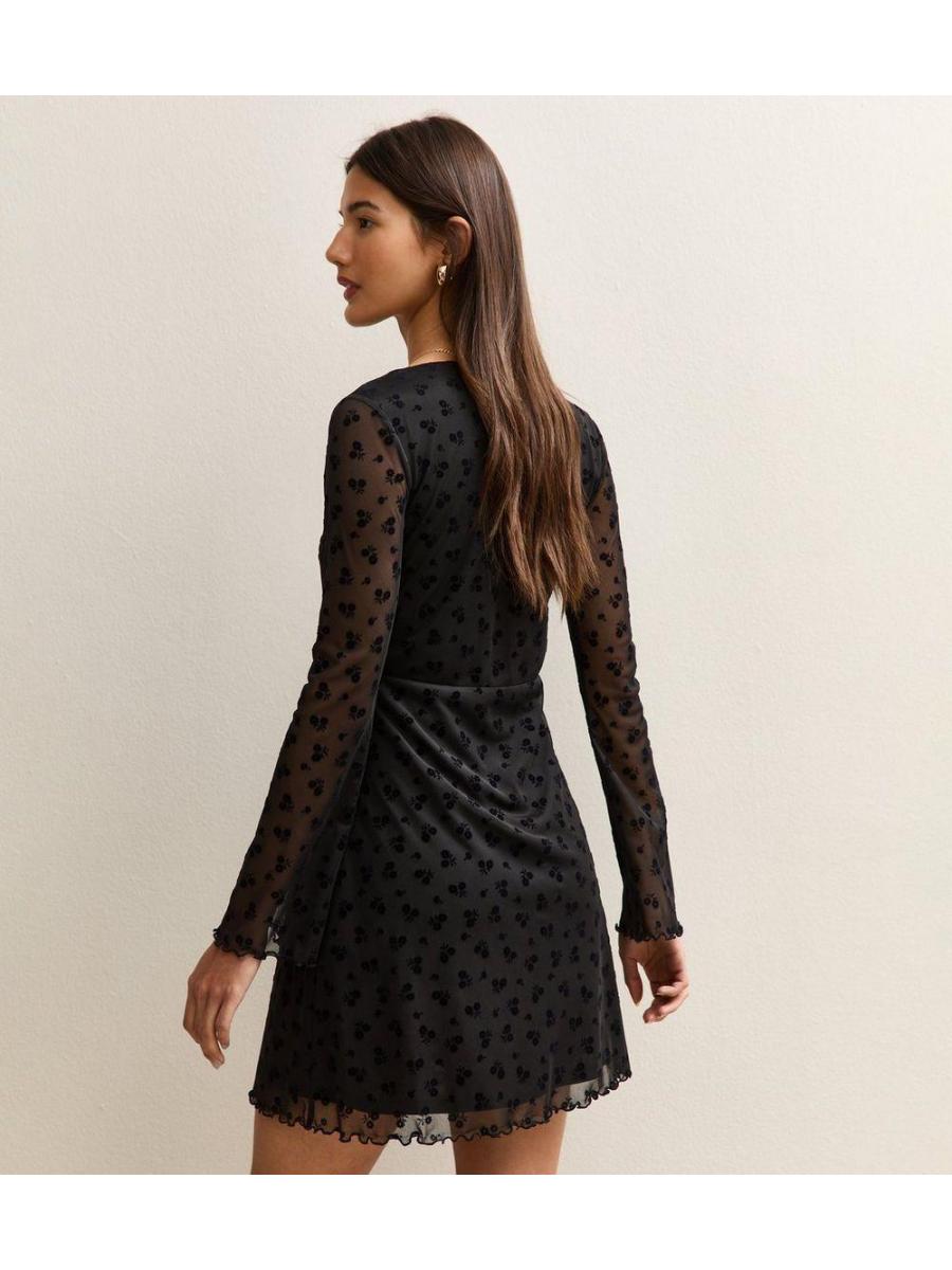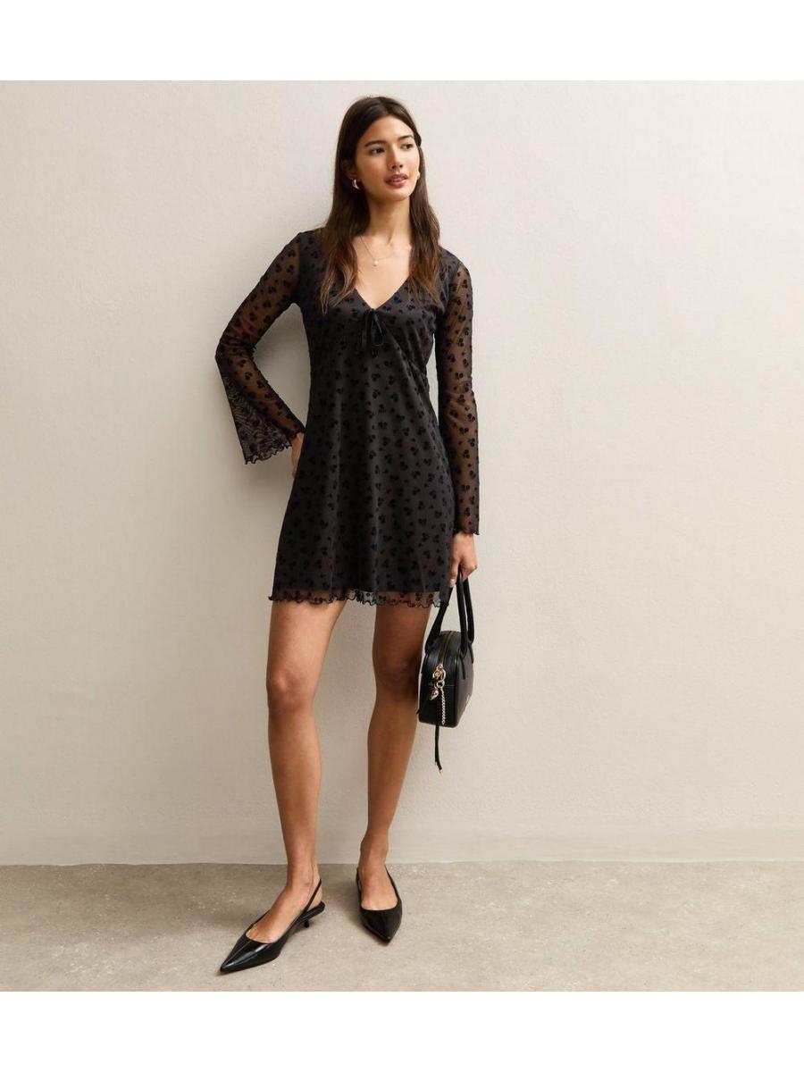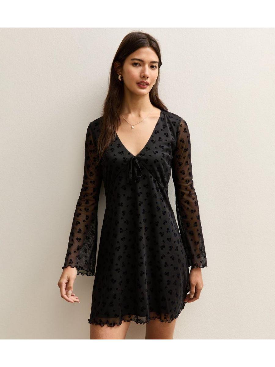 Black Flocked Mesh Flared Sleeve Mini Dress