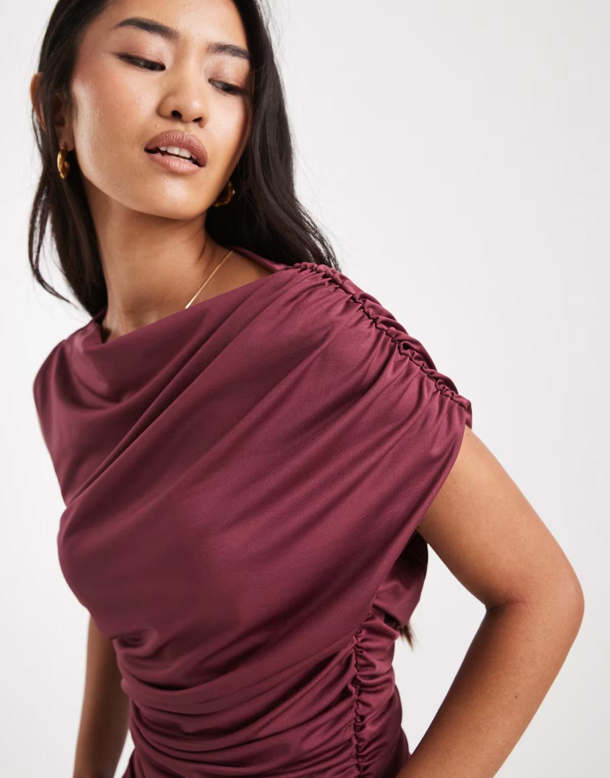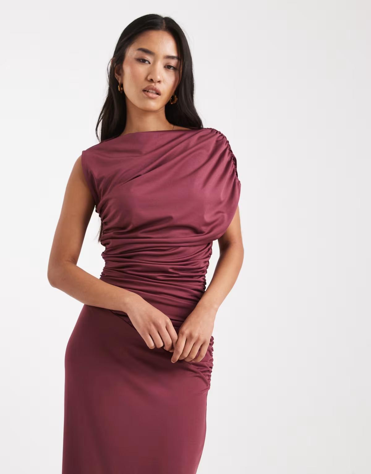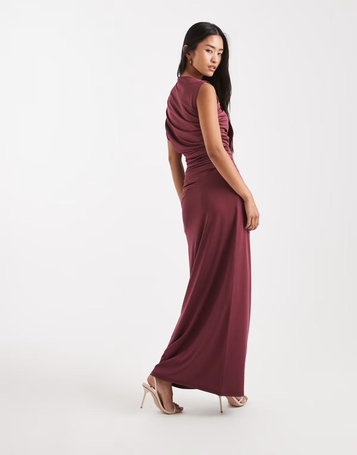 4th & Reckless exclusive double layered slinky drape off shoulder detail sleeveless maxi dress in burgundy