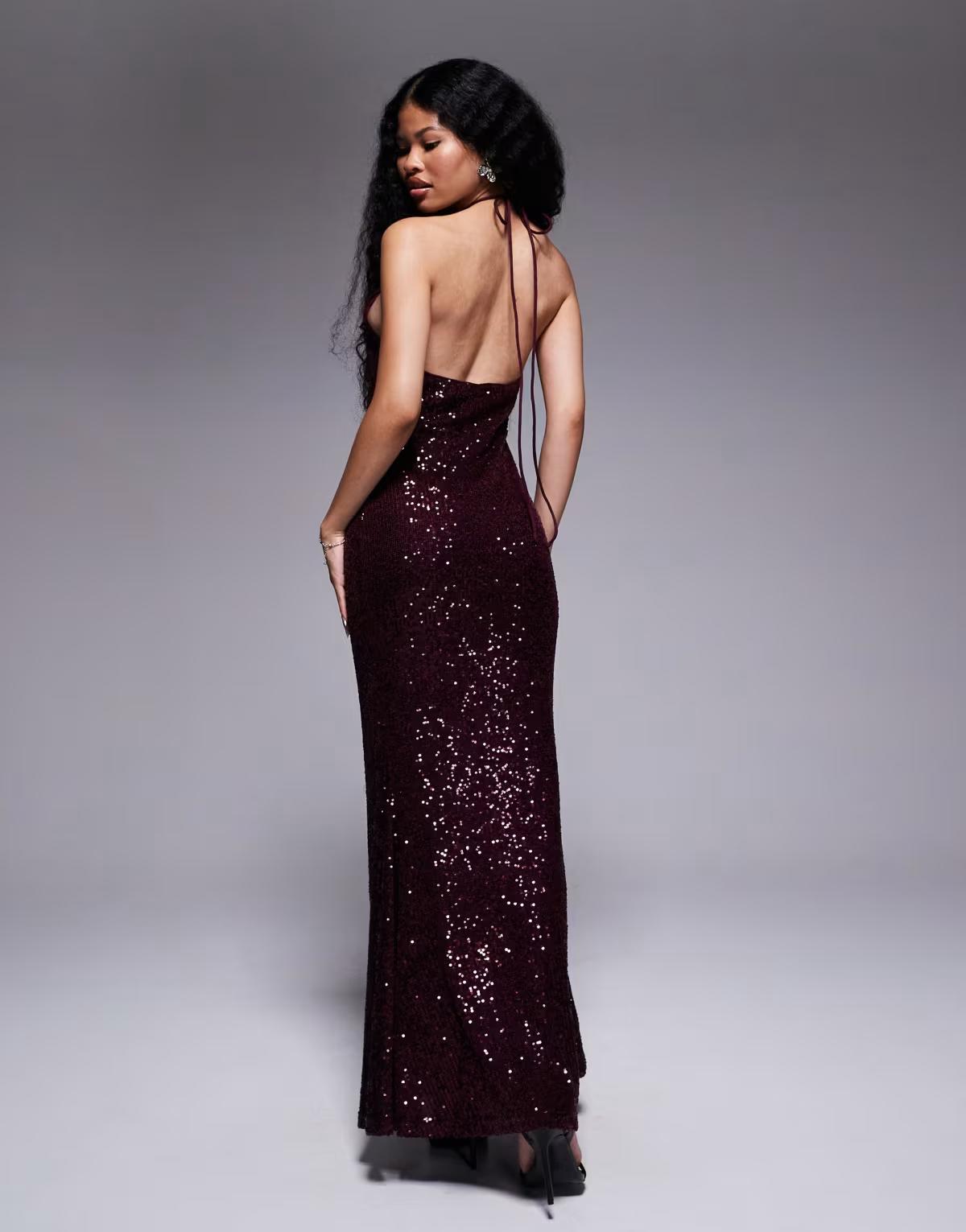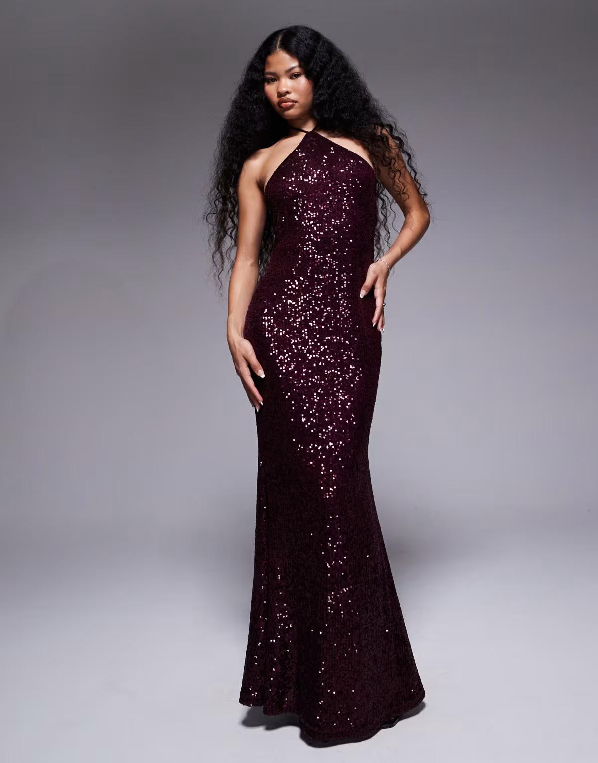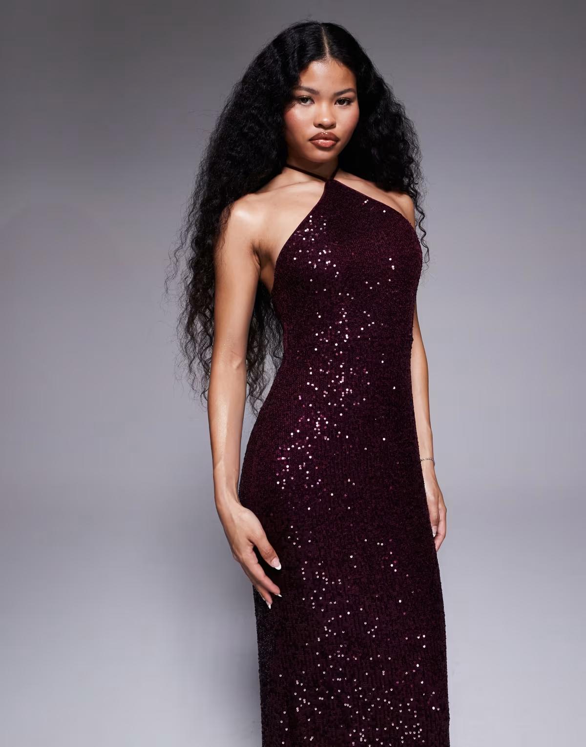 ASOS DESIGN Petite all over sequin halter maxi dress in burgundy