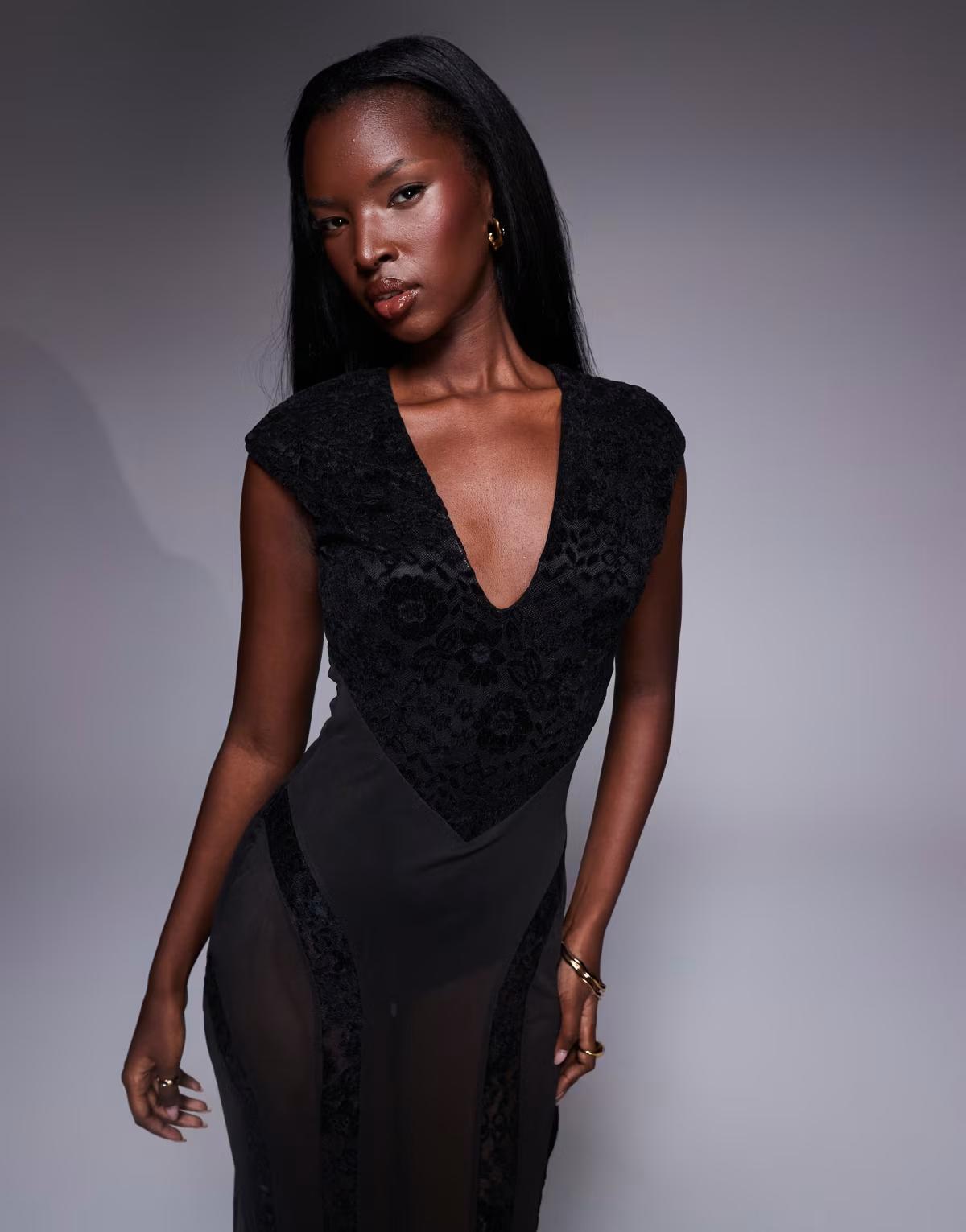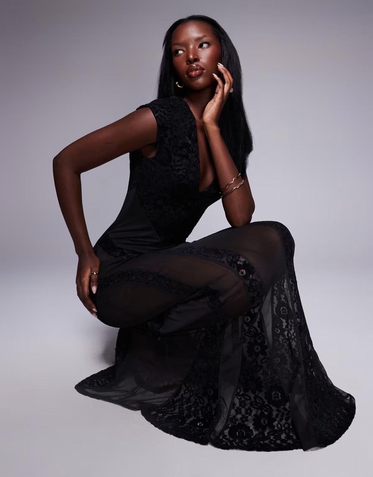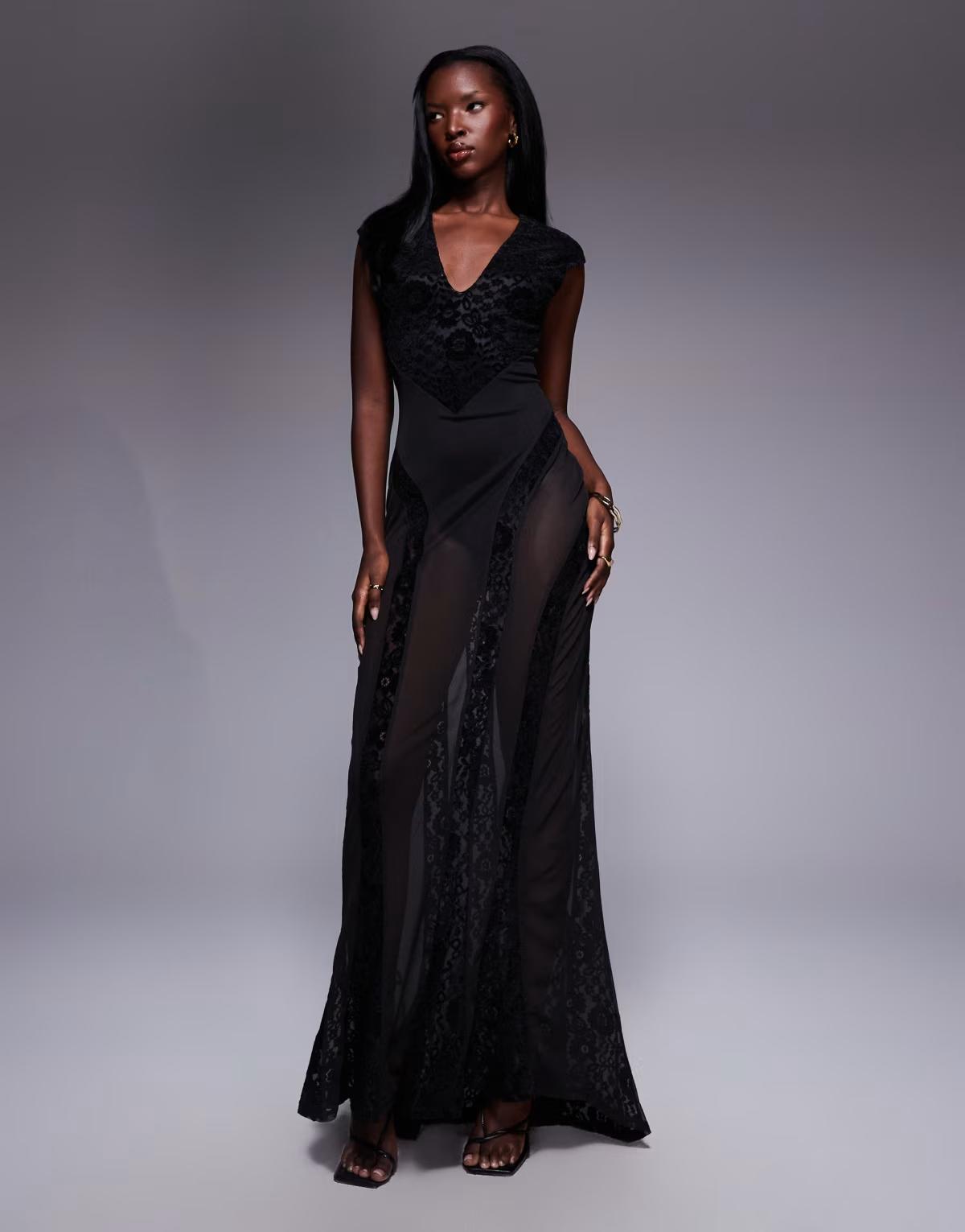 ASOS DESIGN plunge velvet lace sheer skirt maxi dress with low back in black