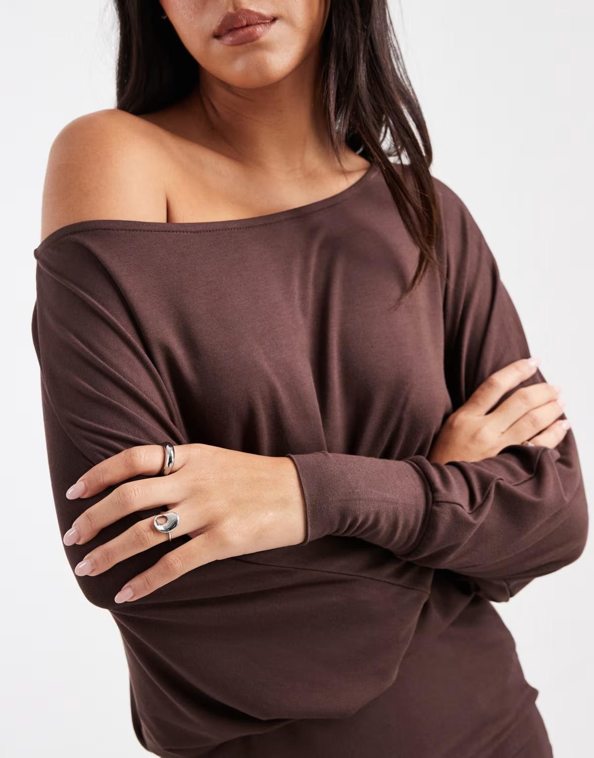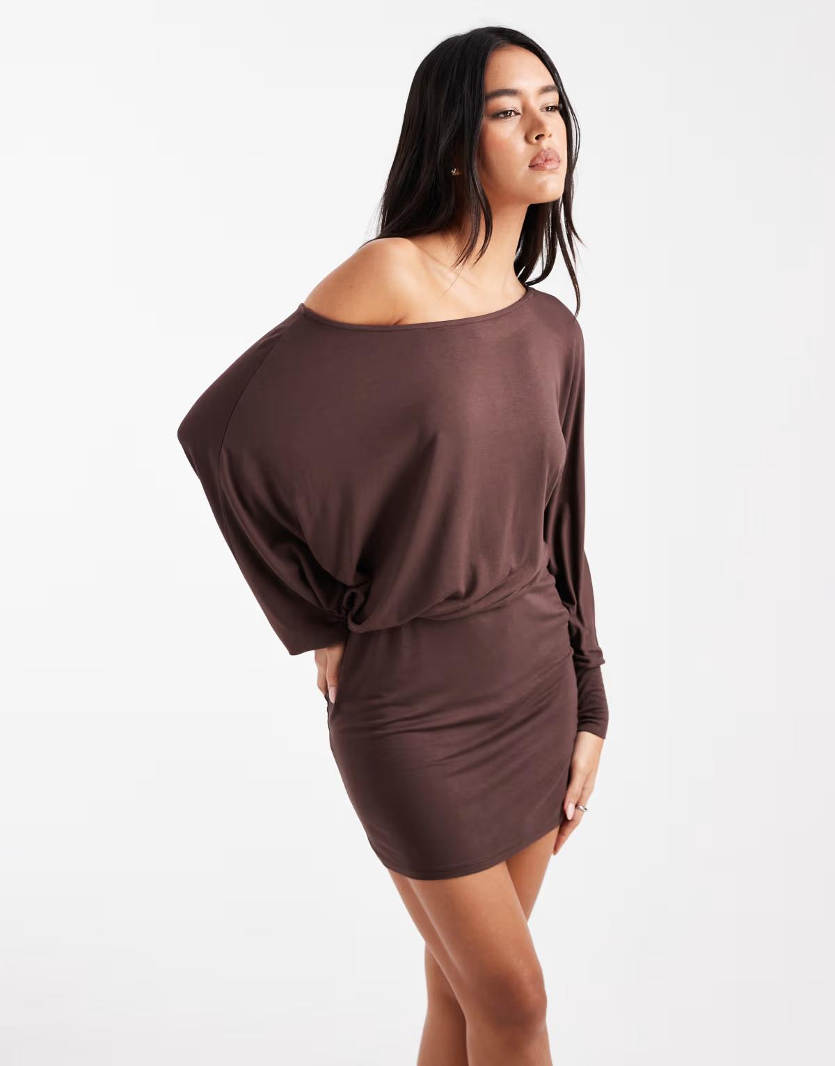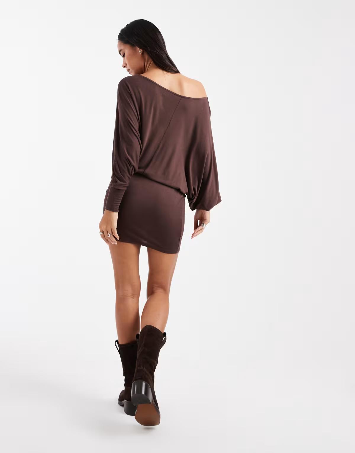 ASOS DESIGN fallen shoulder slouchy batwing mini dress in chocolate