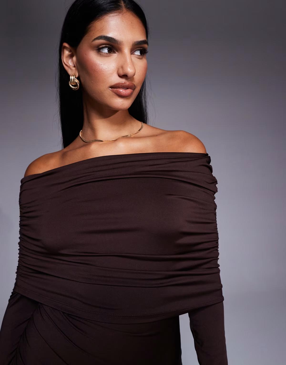 Aria Cove double sculpted slinky ruched extreme foldover asymmetric shoulder mini dress in chocolate