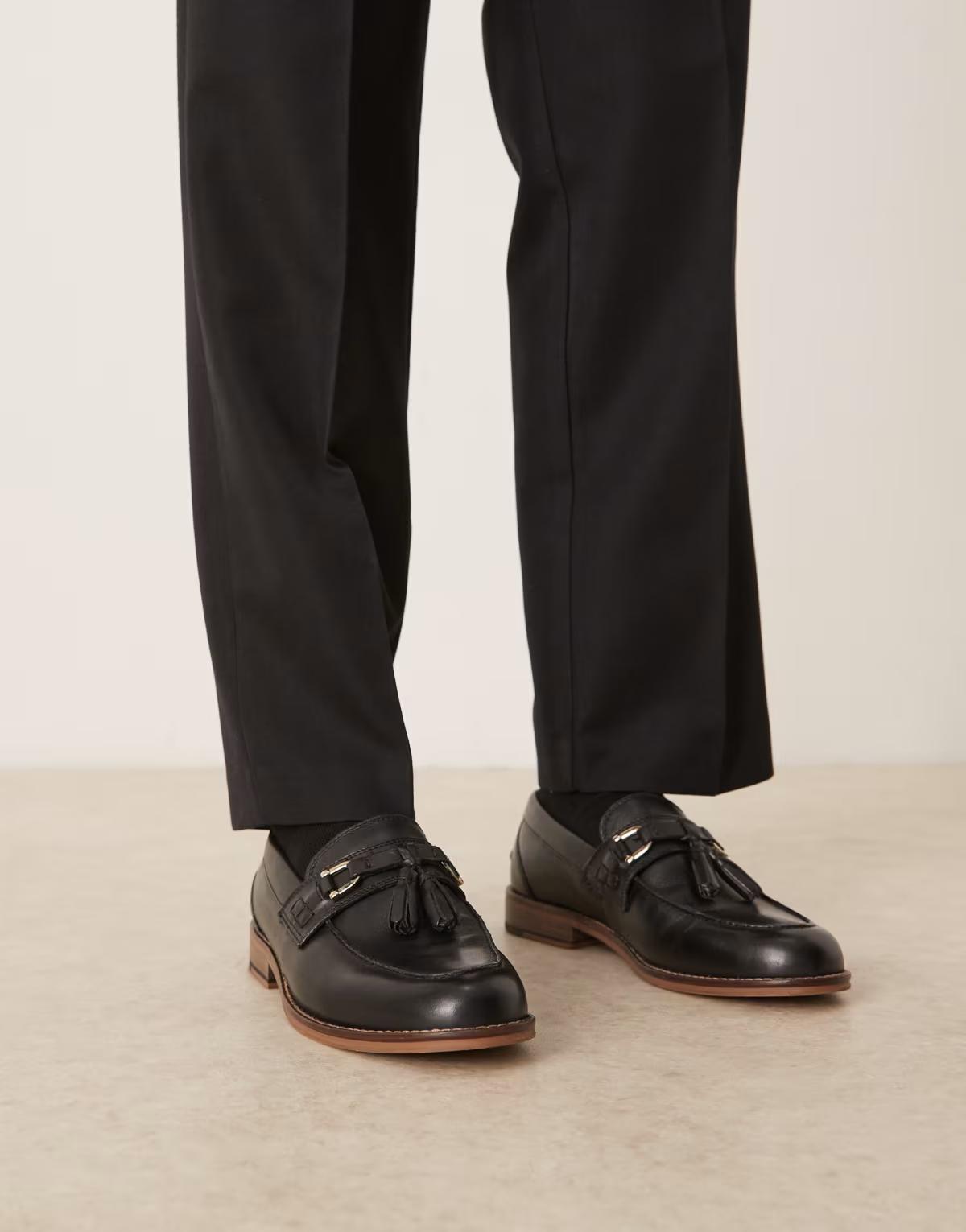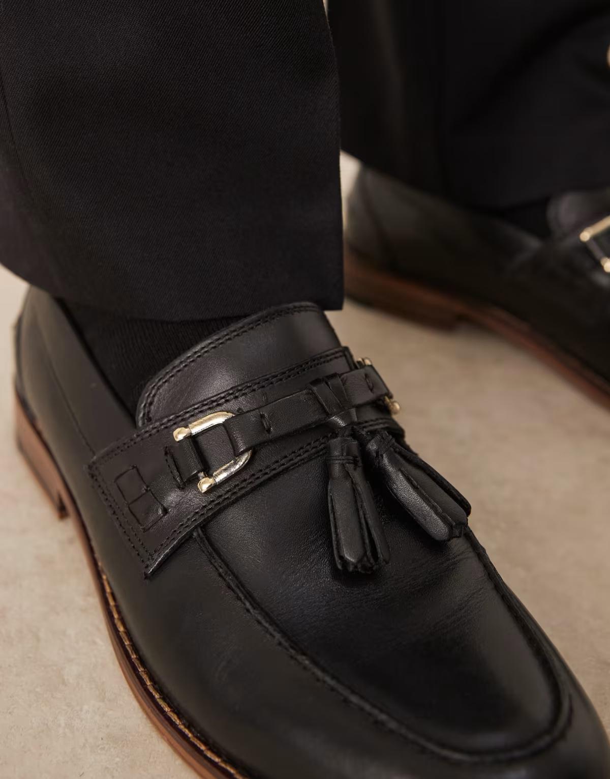 ASOS DESIGN loafers in black leather with gold hardware and tassel