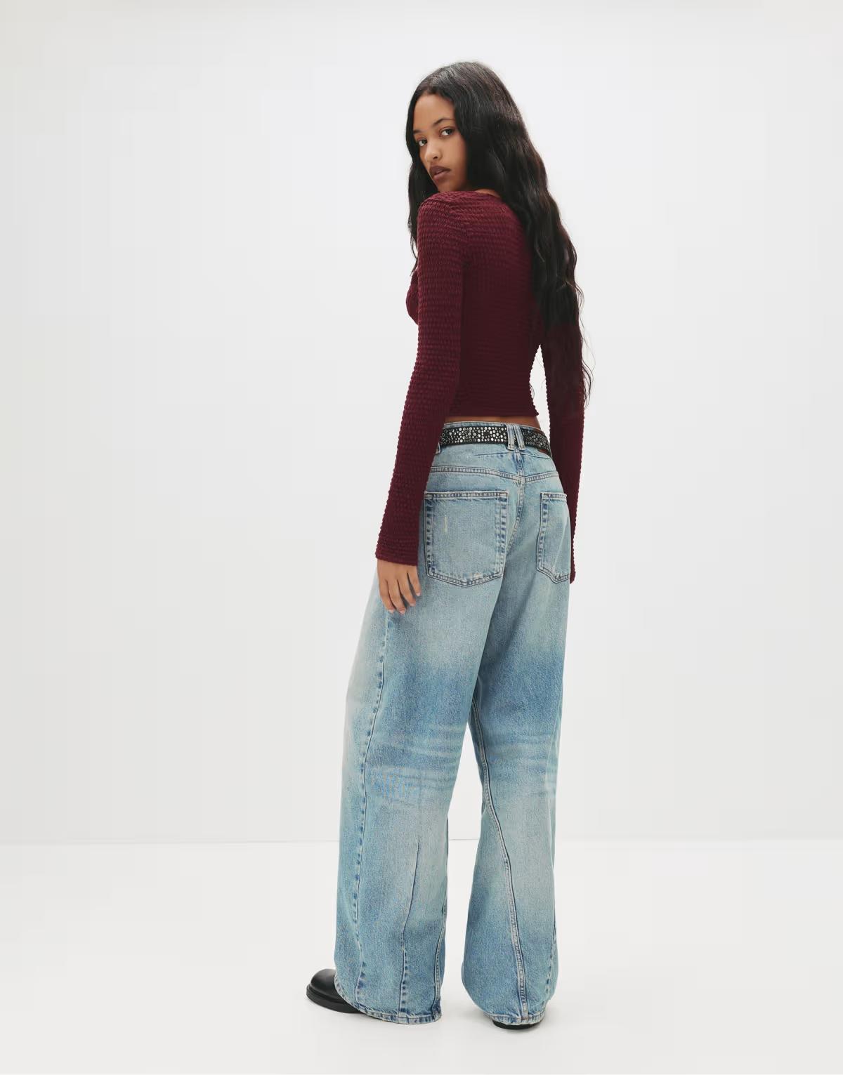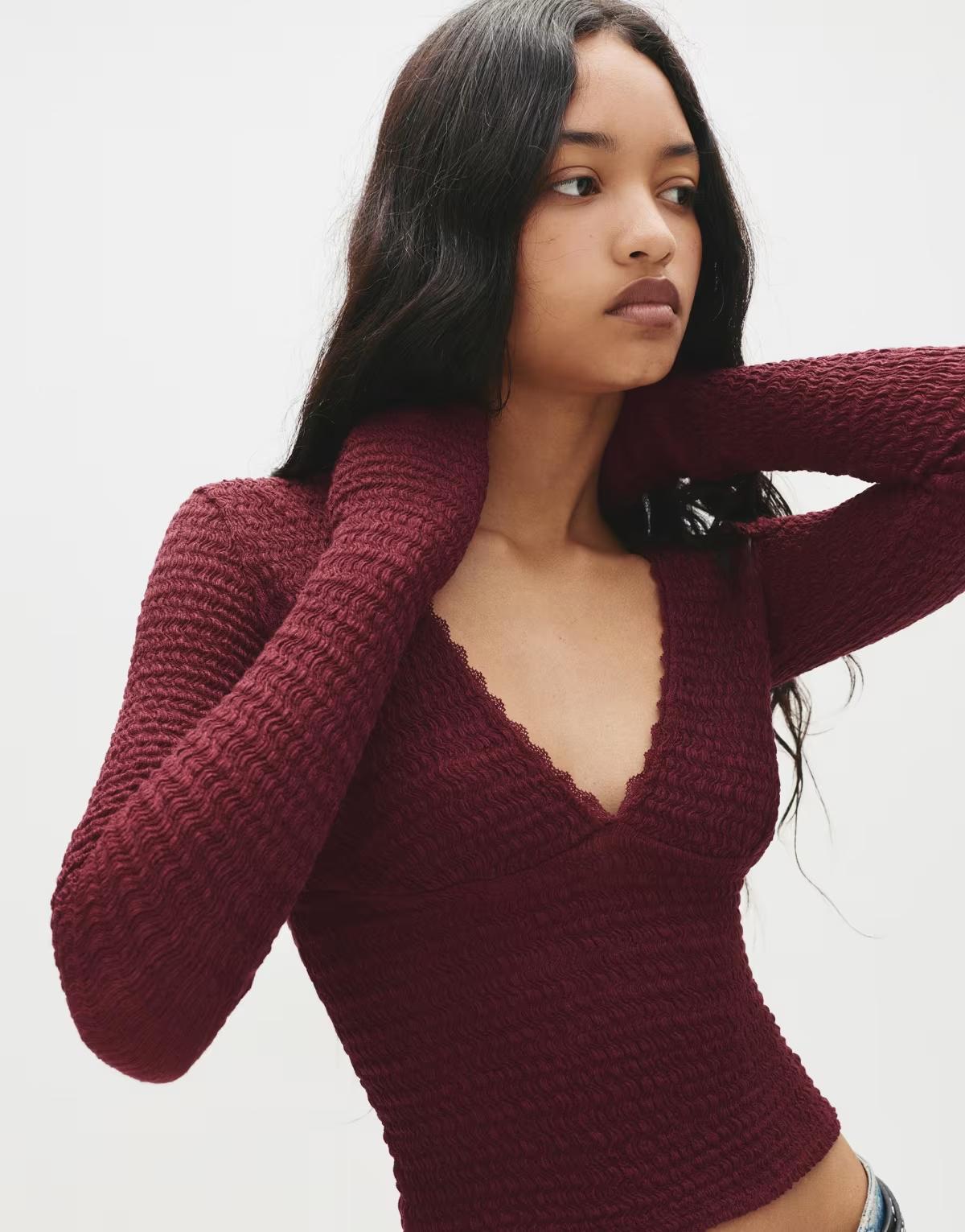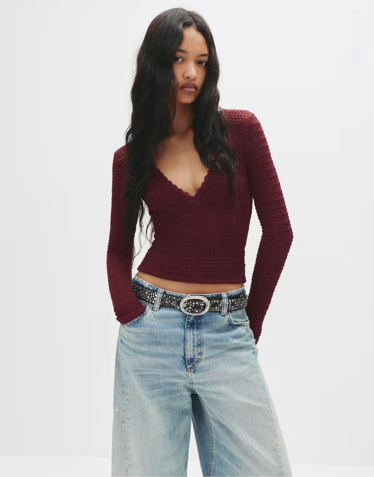 Pull&Bear Crepe long sleeve t-shirt in burgundy