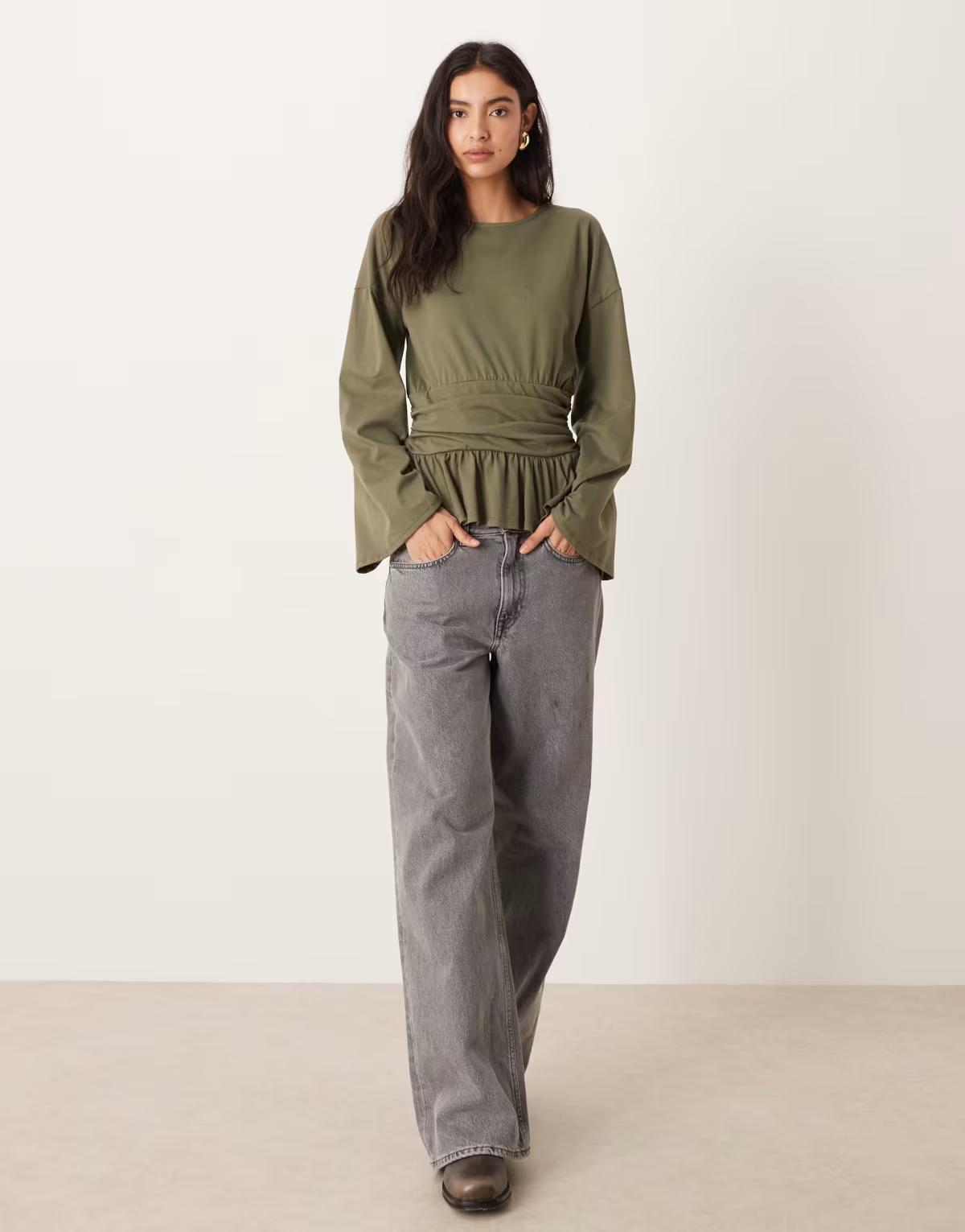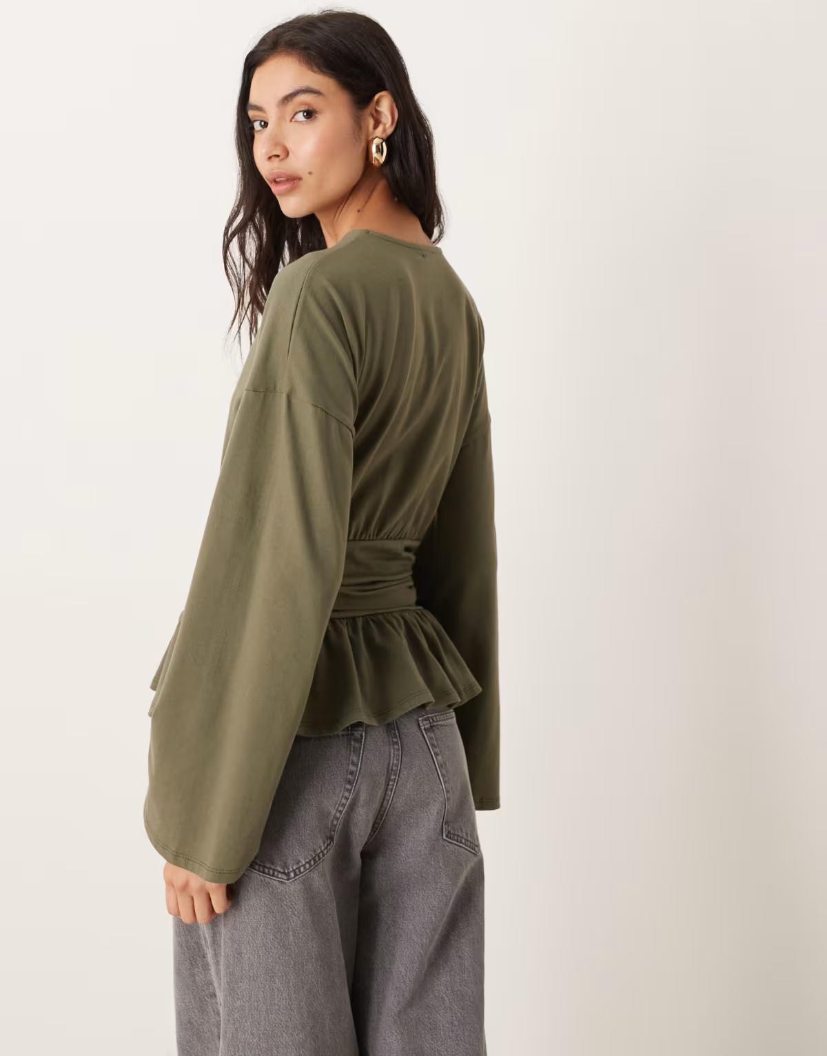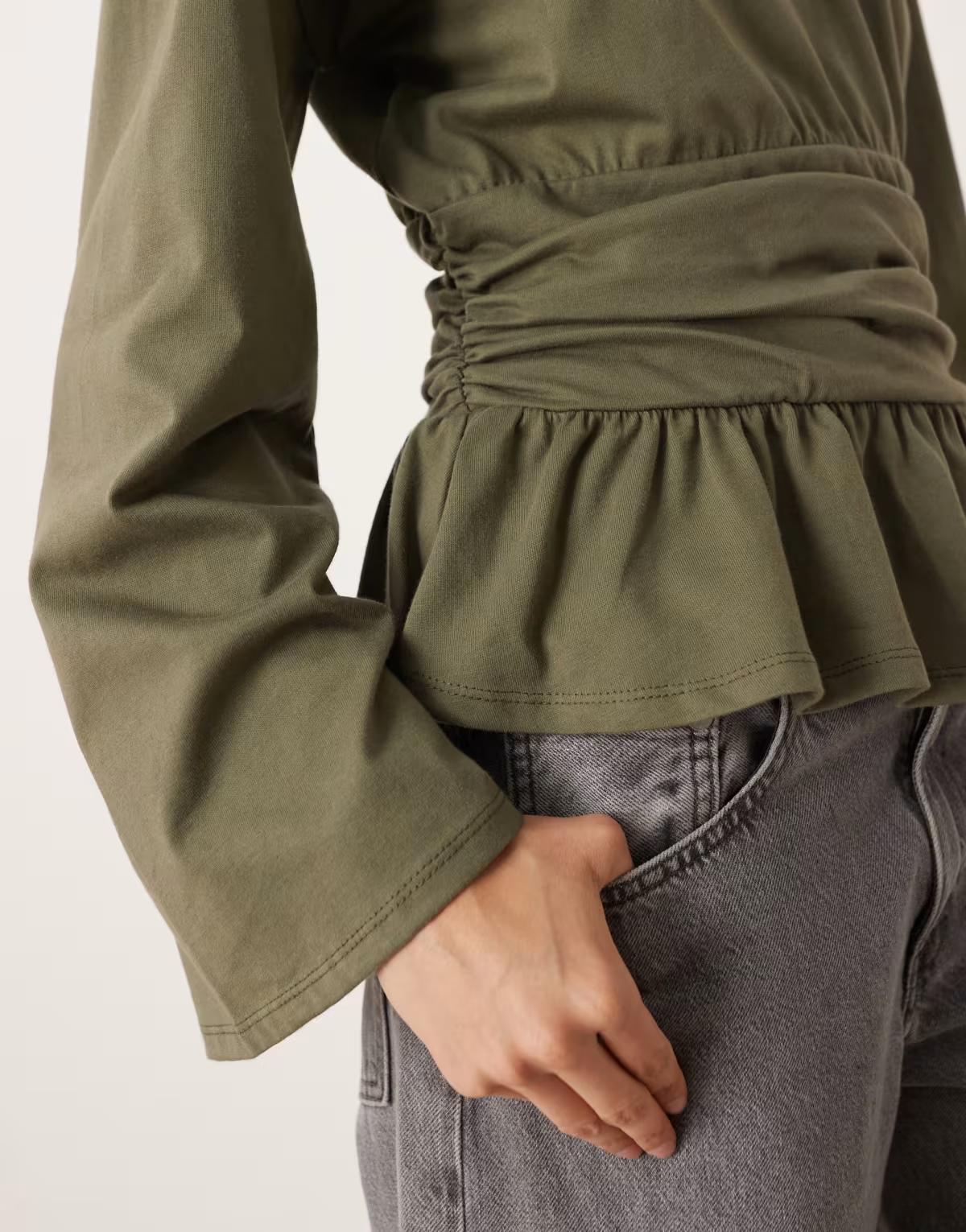 ASOS DESIGN cinched waist peplum hem long sleeve in olive