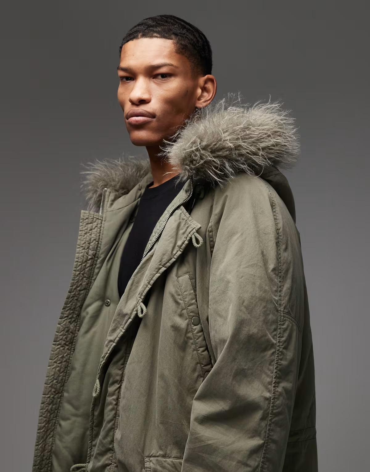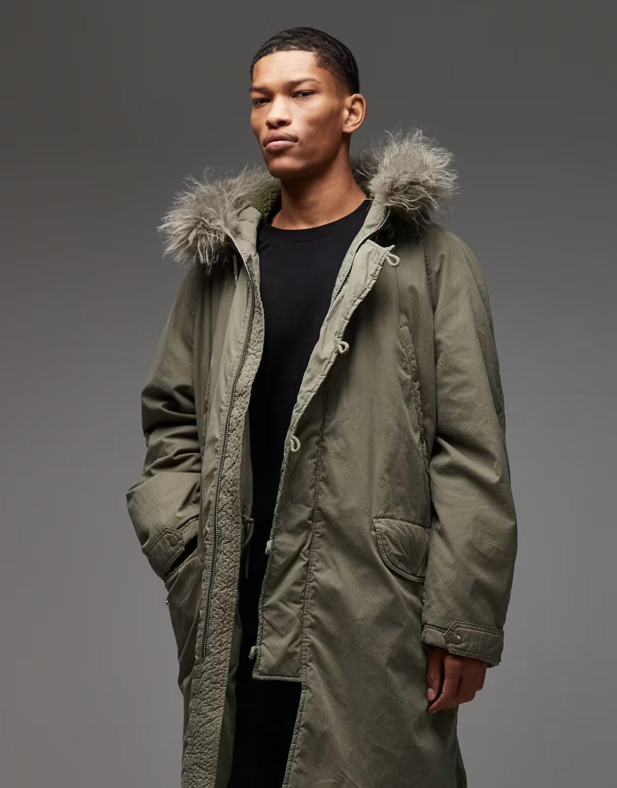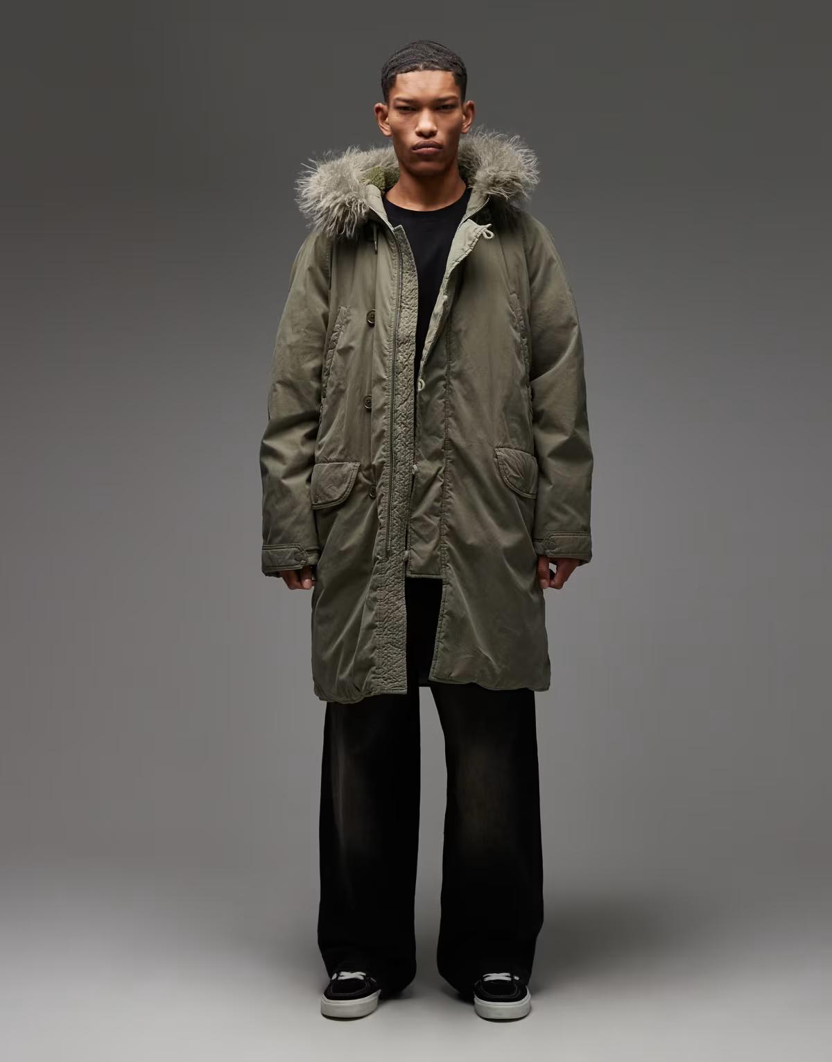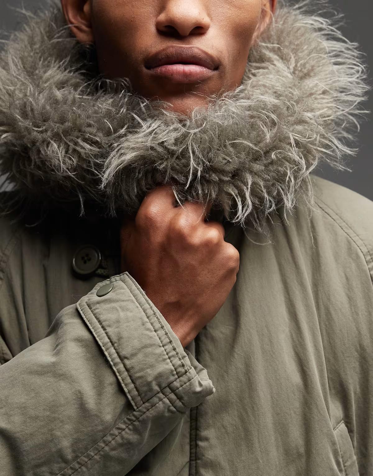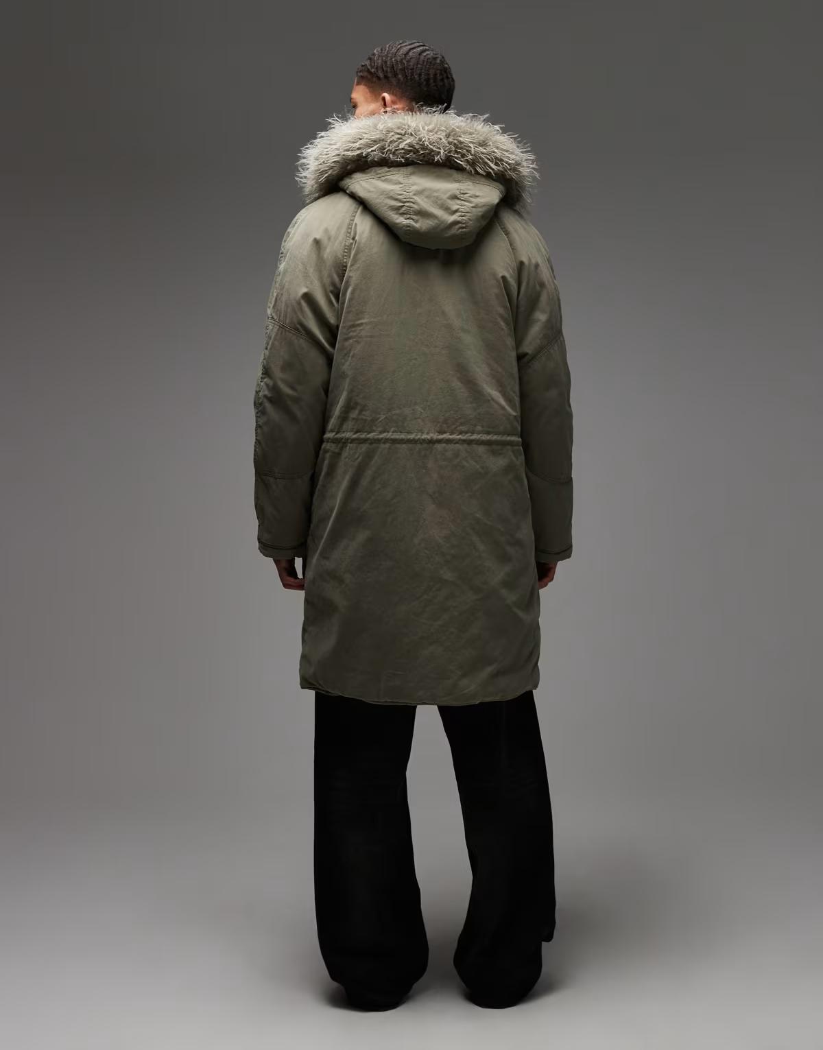 COLLUSION faux fur lined longline parka in khaki