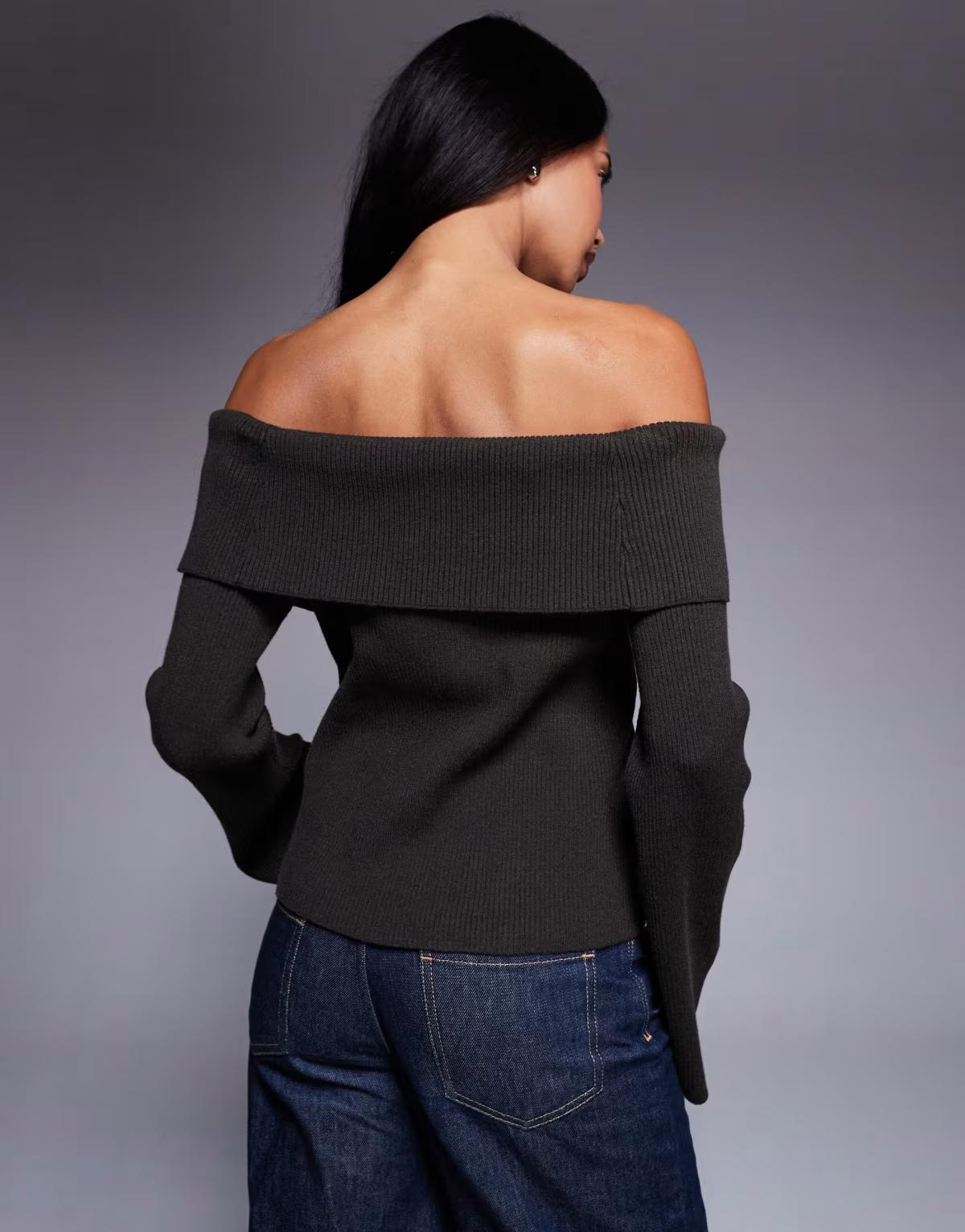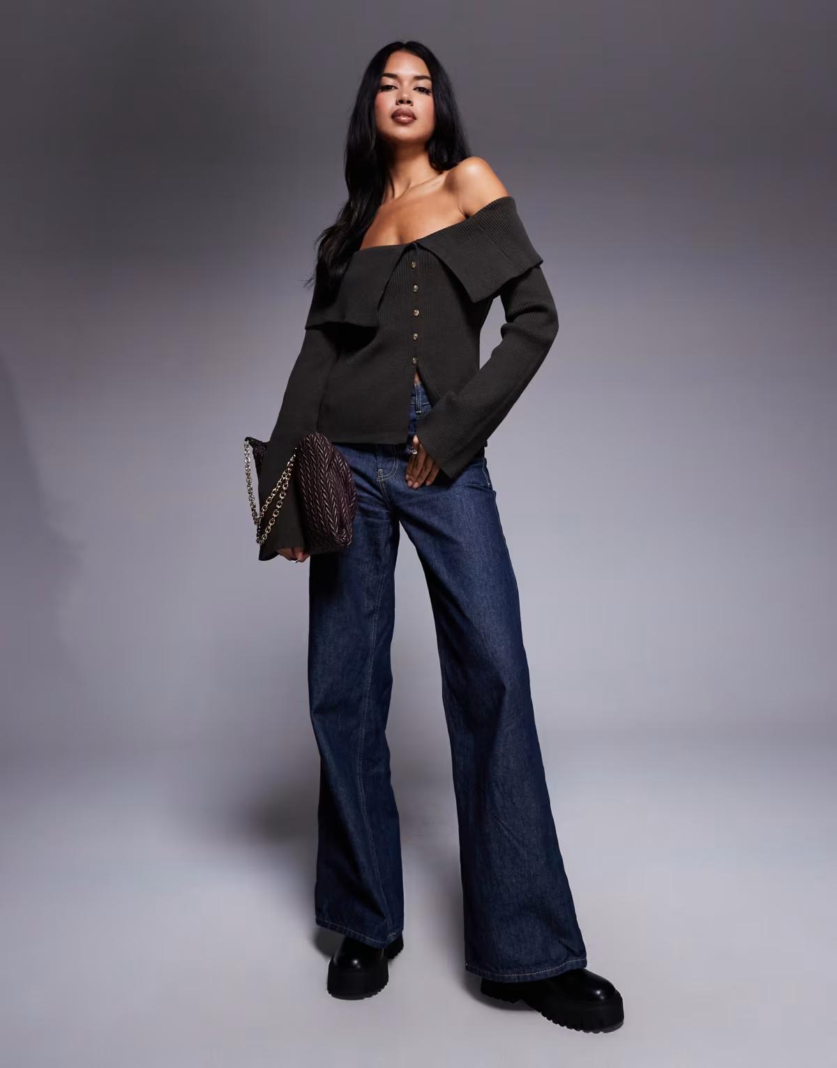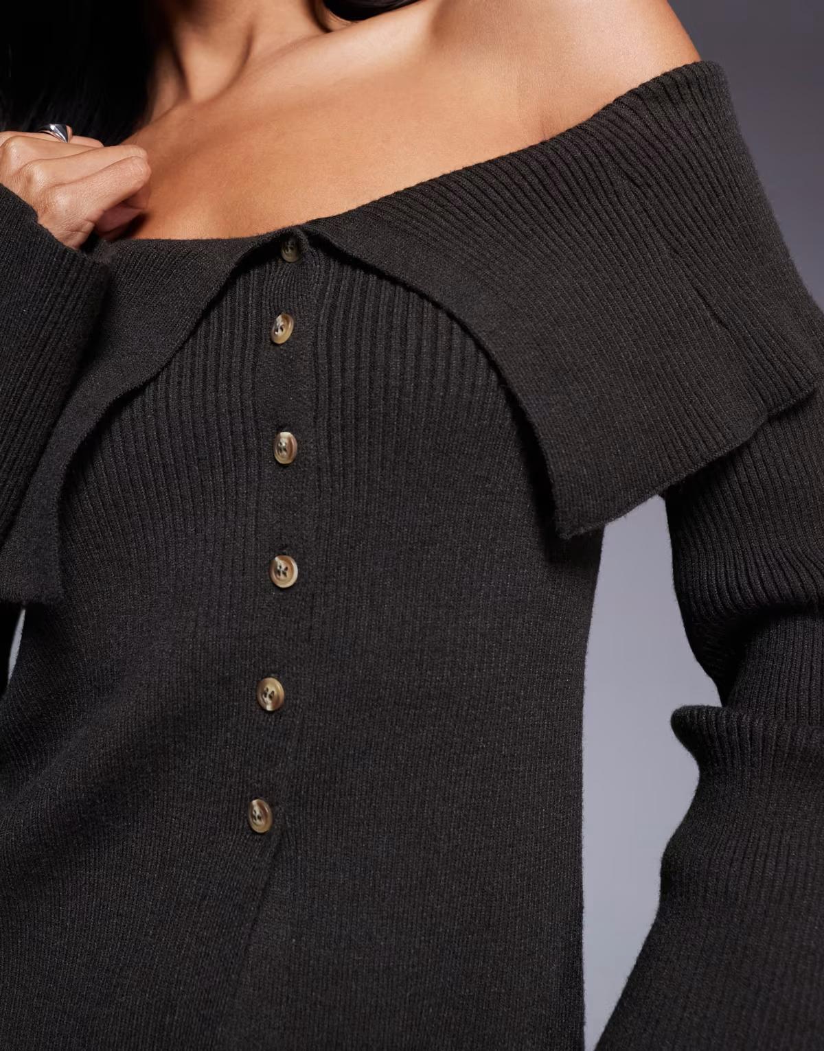 Kaiia knitted asymmetric button detail bardot flare sleeve jumper in chocolate