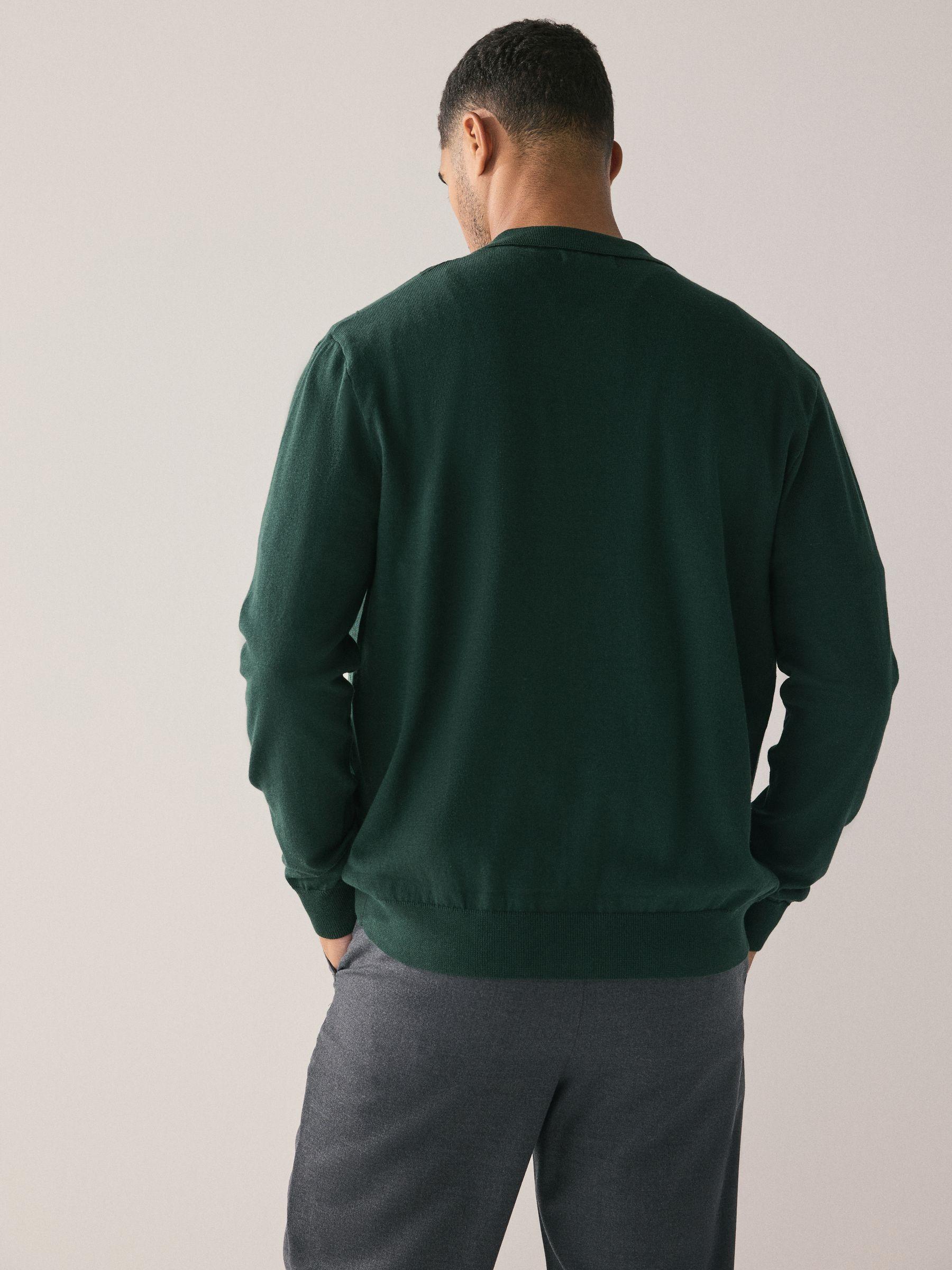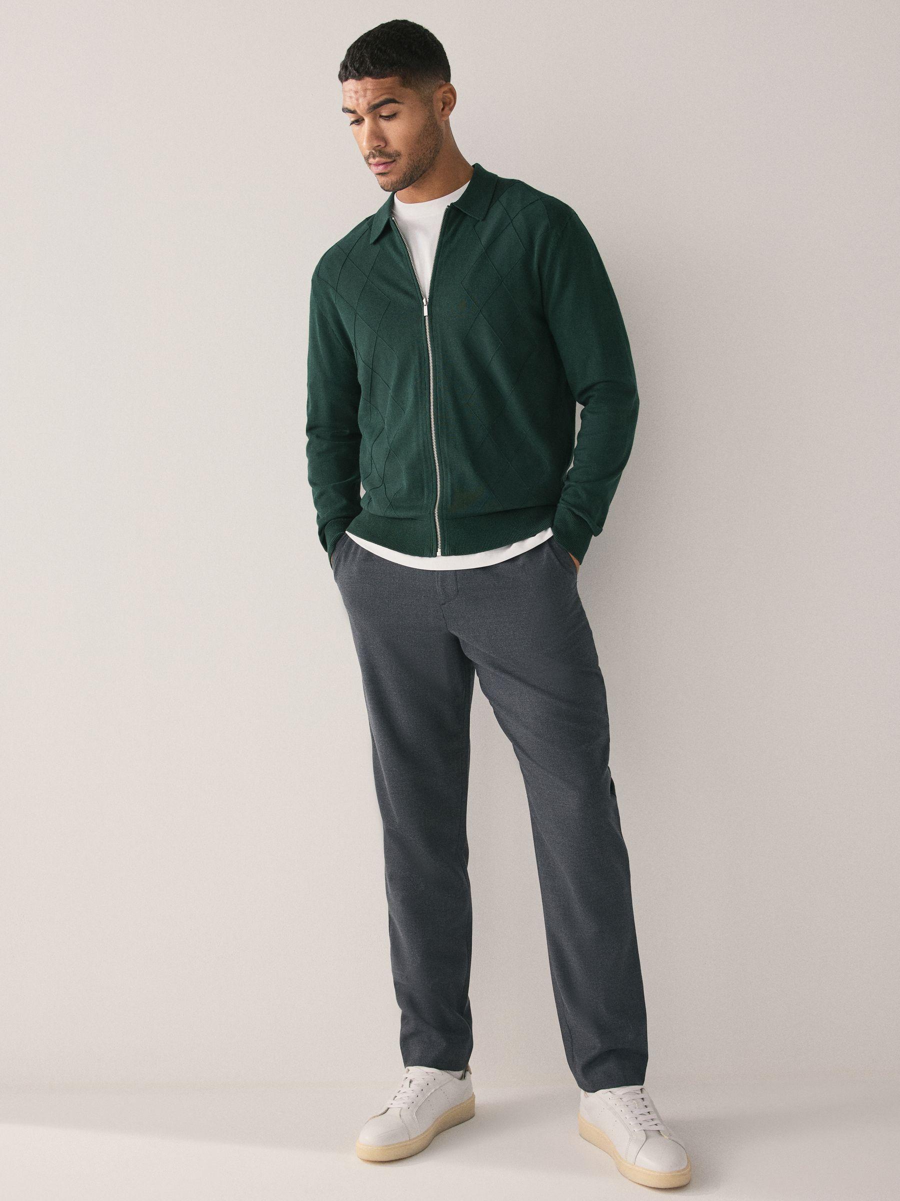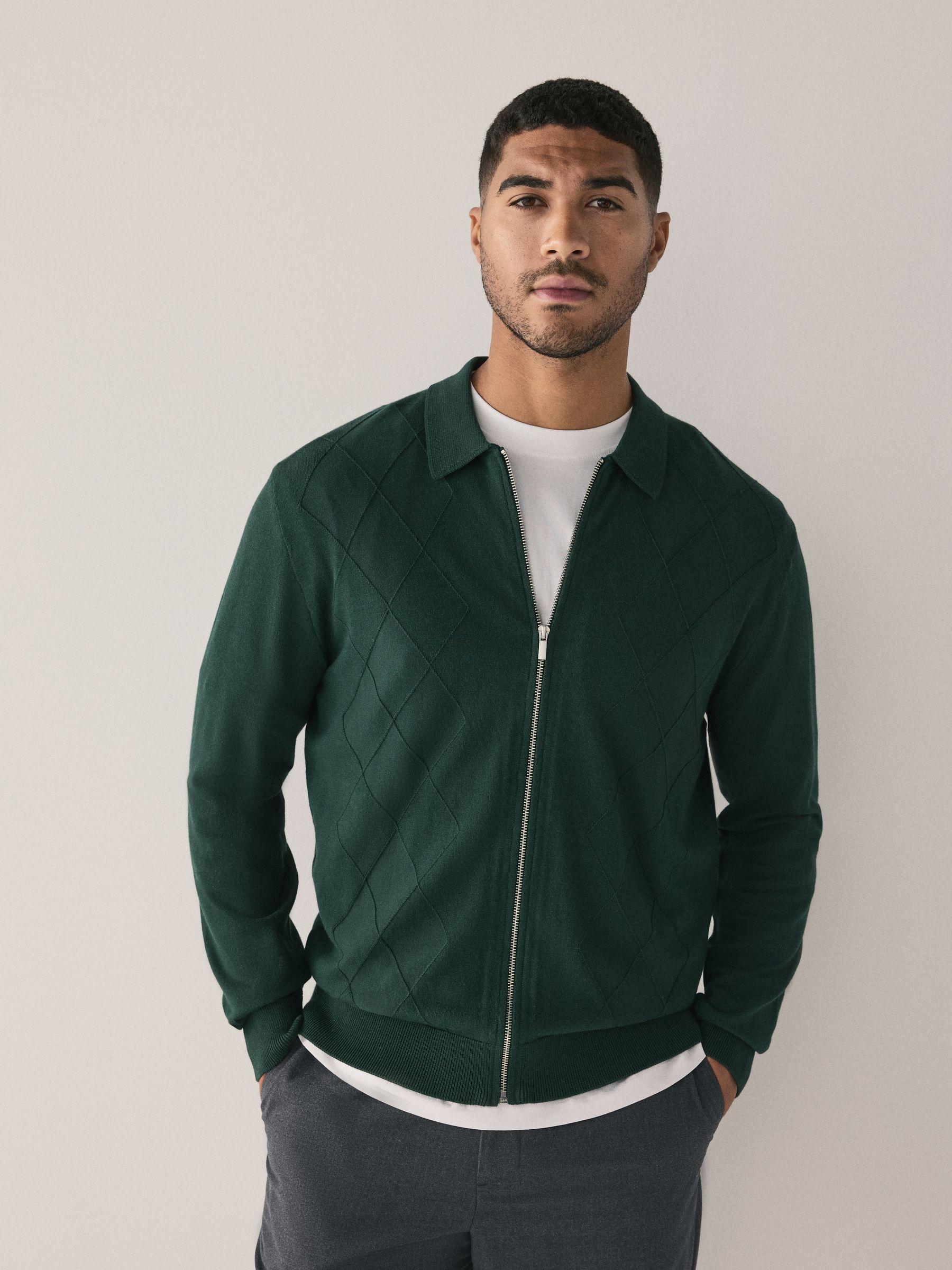 Green Regular Fit Cotton Rich Argyle Stitch Collared Zip Through Cardigan