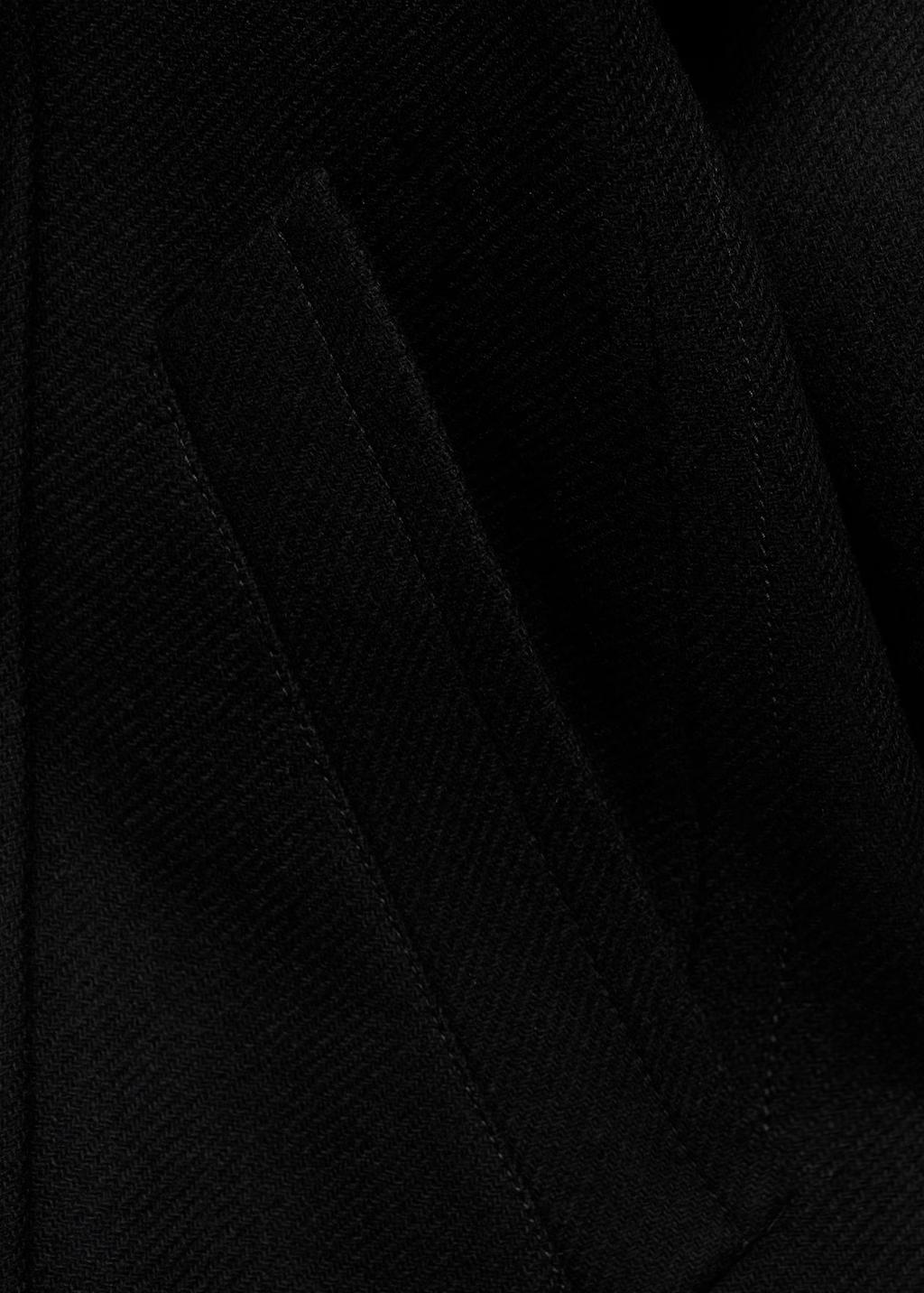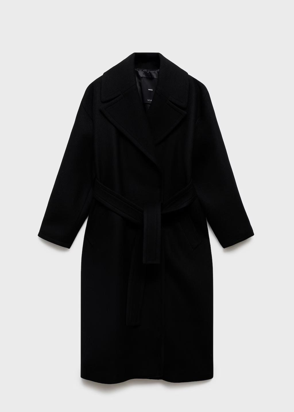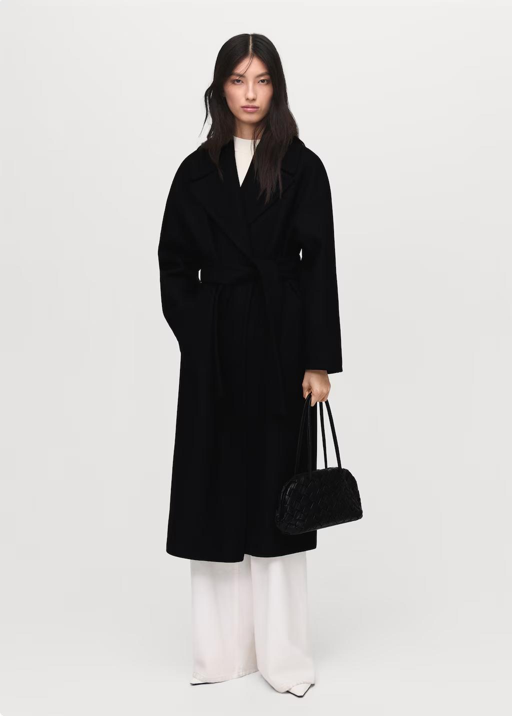 Confeccionado en tejido de lana virgen Manteco, este diseño largo y recto presenta un cuello pico con solapas de muesca. Incluye manga larga, cinturón tipo batín y abertura posterior en el bajo