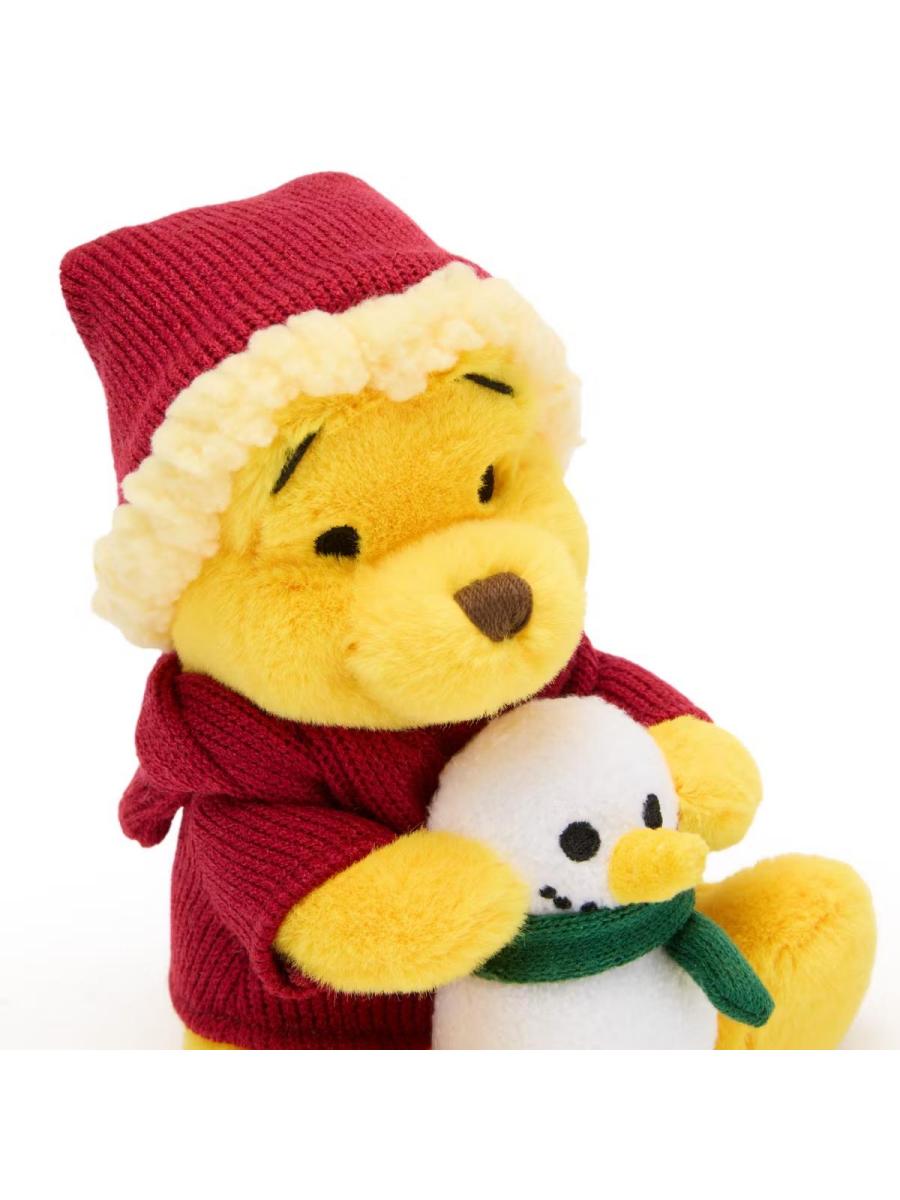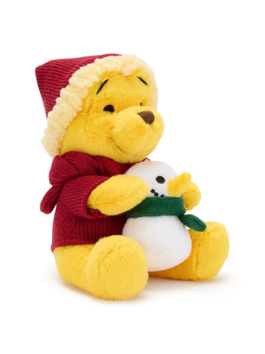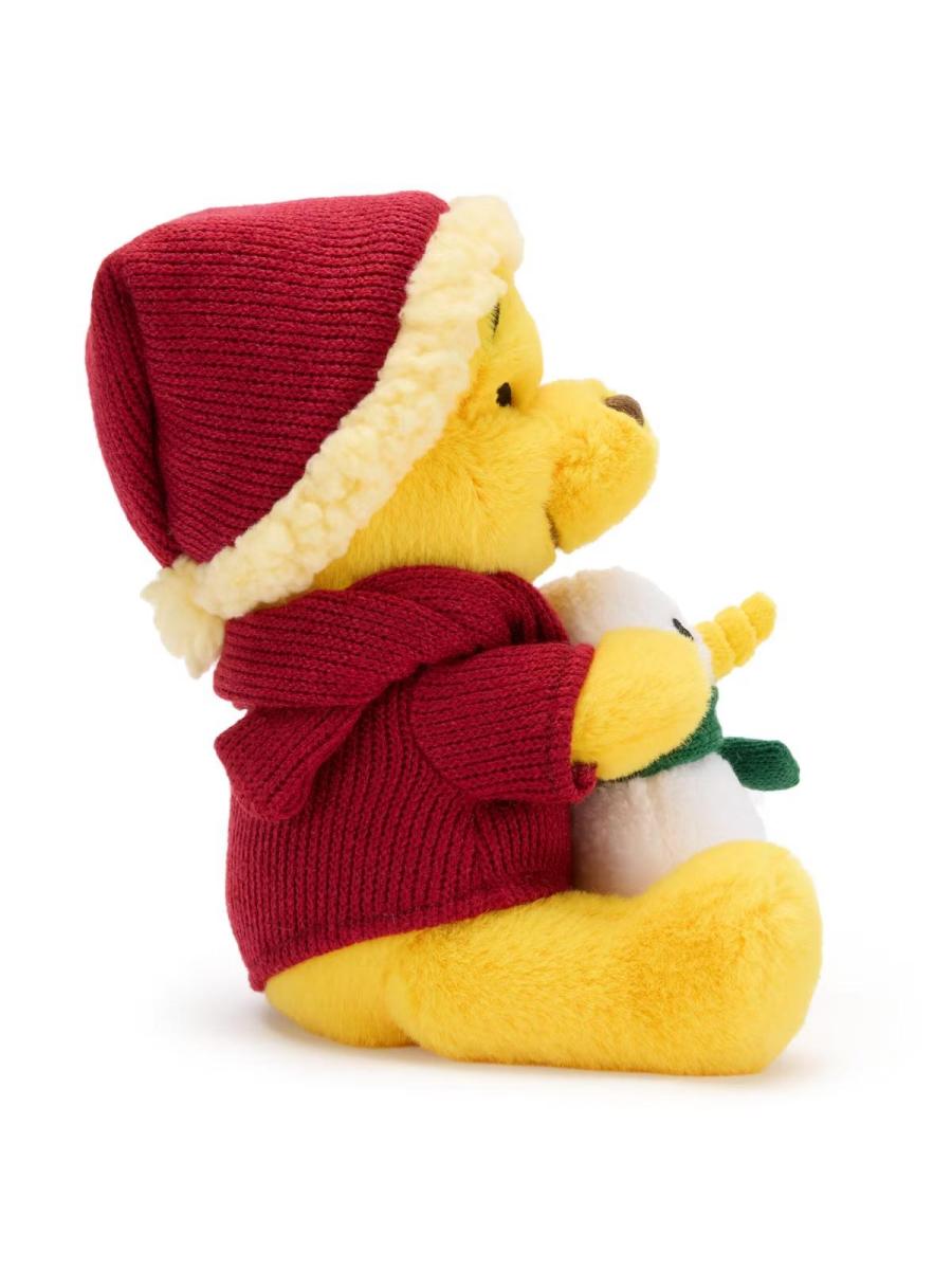 Pooh’s all wrapped up for winter fun! Sporting a Santa hat and red scarf, he’s holding a snowman soft toy and bringing sweet seasonal smiles wherever he goes.