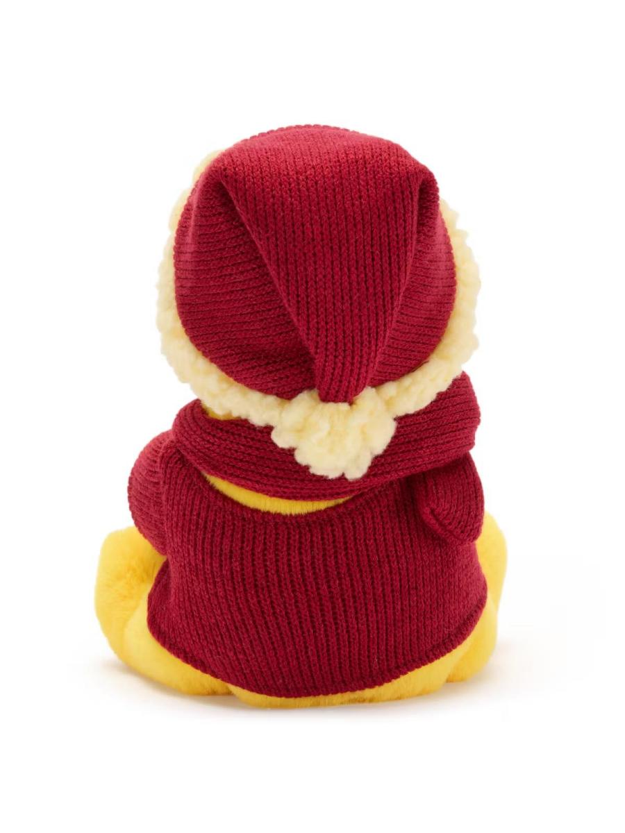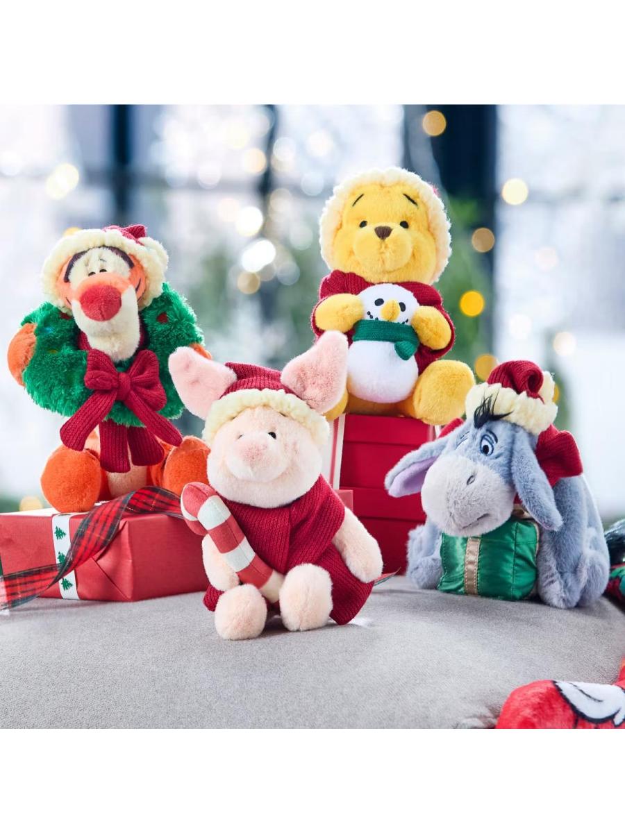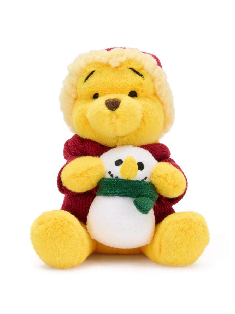 Pooh’s all wrapped up for winter fun! Sporting a Santa hat and red scarf, he’s holding a snowman soft toy and bringing sweet seasonal smiles wherever he goes.