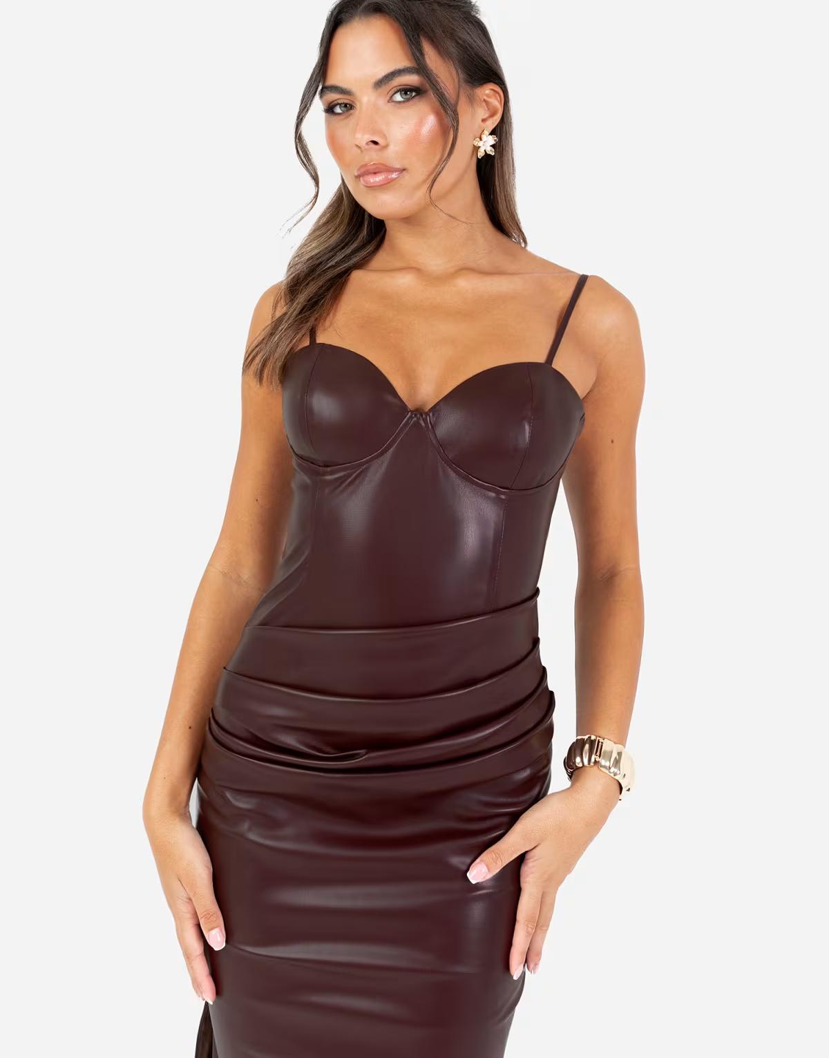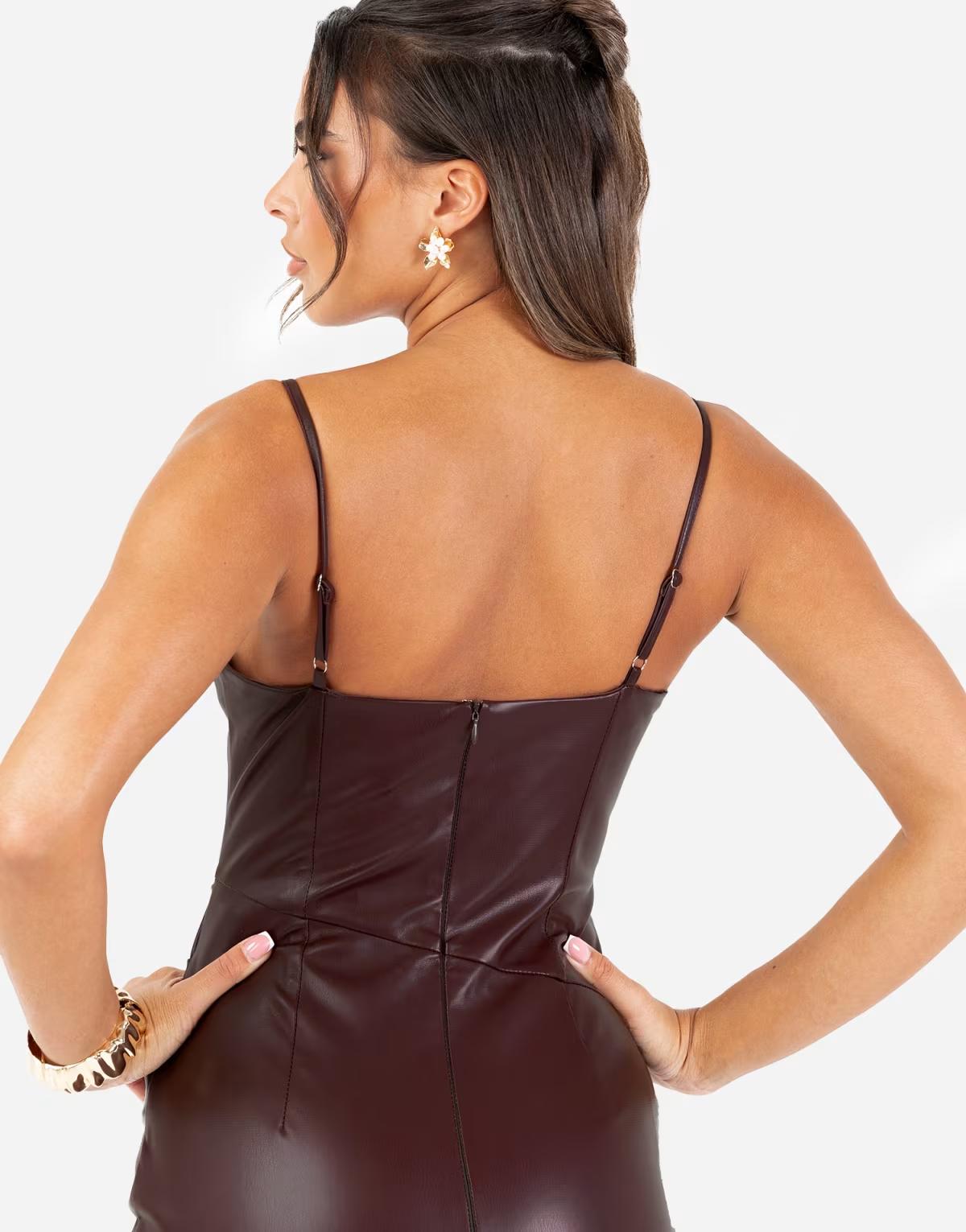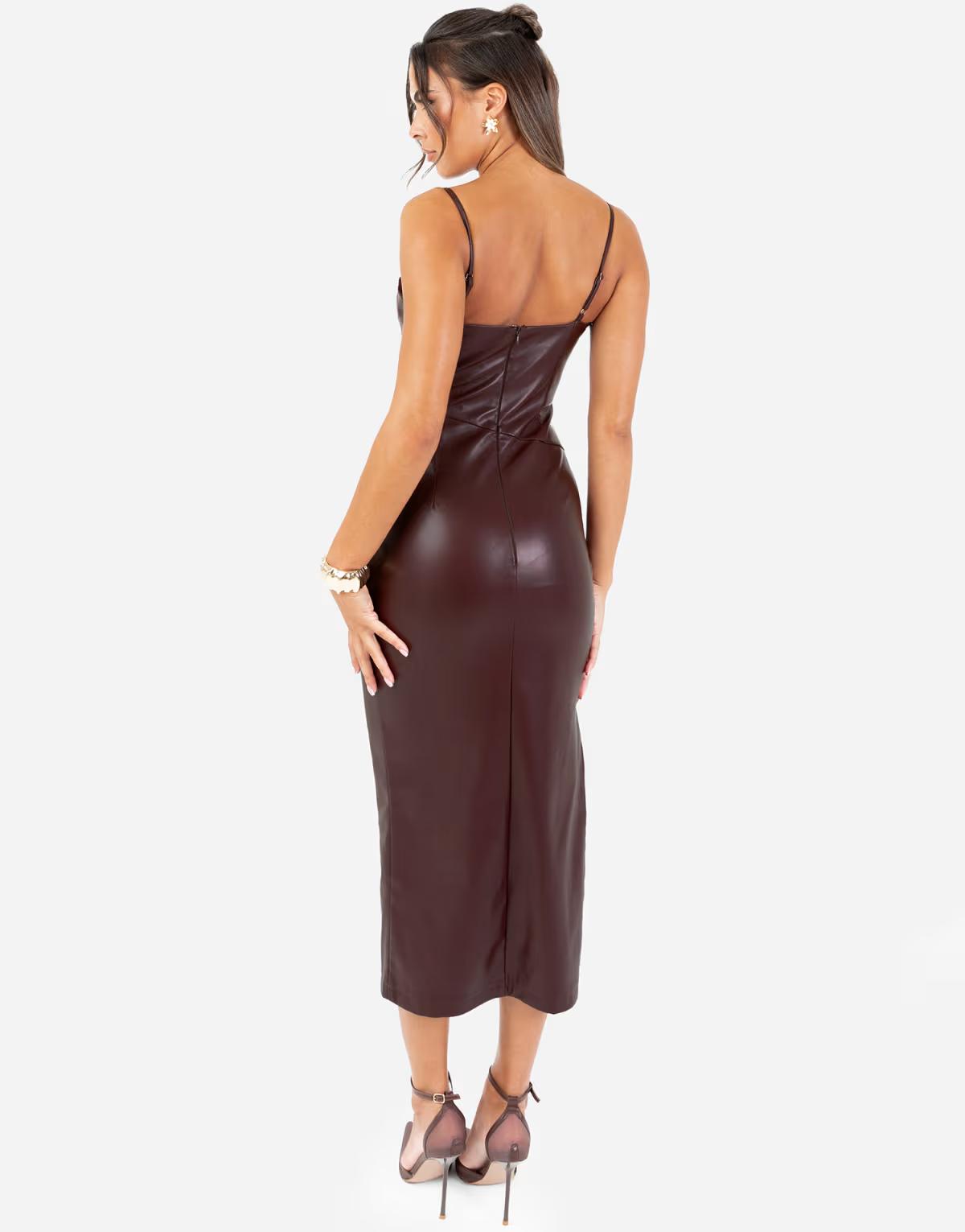 Maya Pu leather strappy midi dress in chocolate
