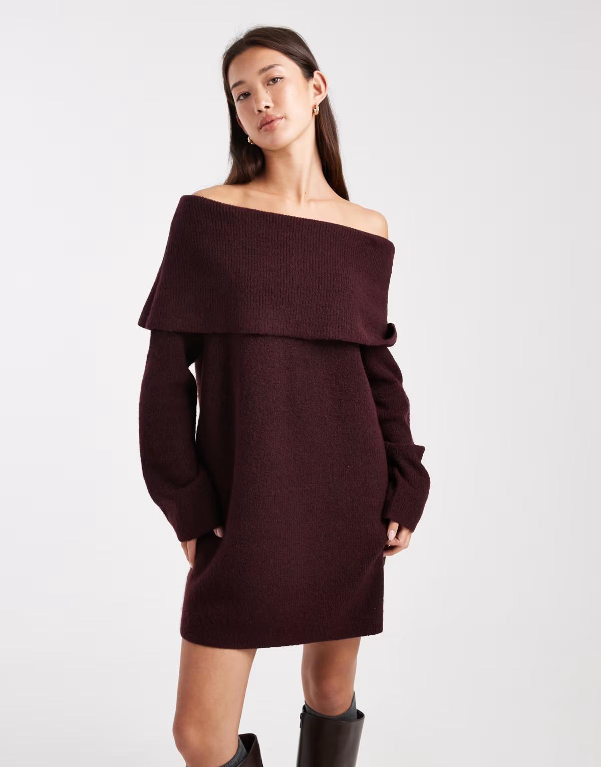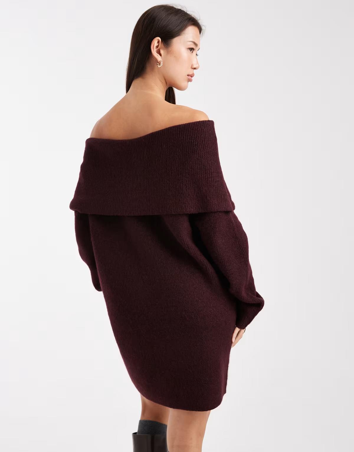 Miss Selfridge foldover bardot mini dress in chocolate