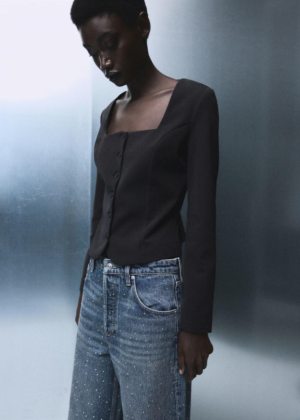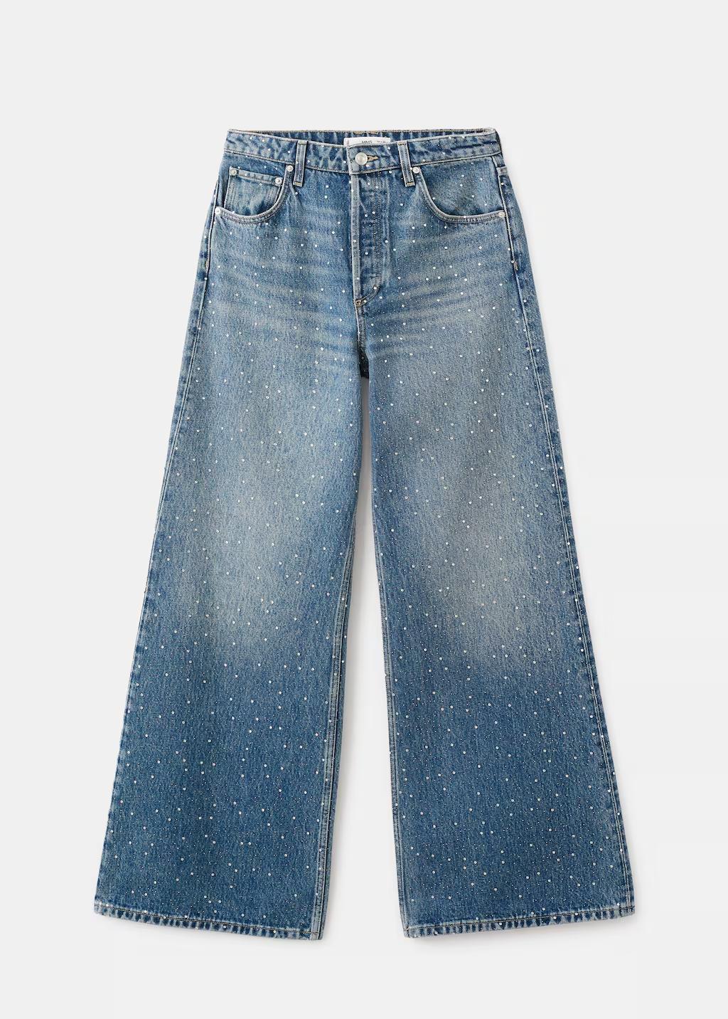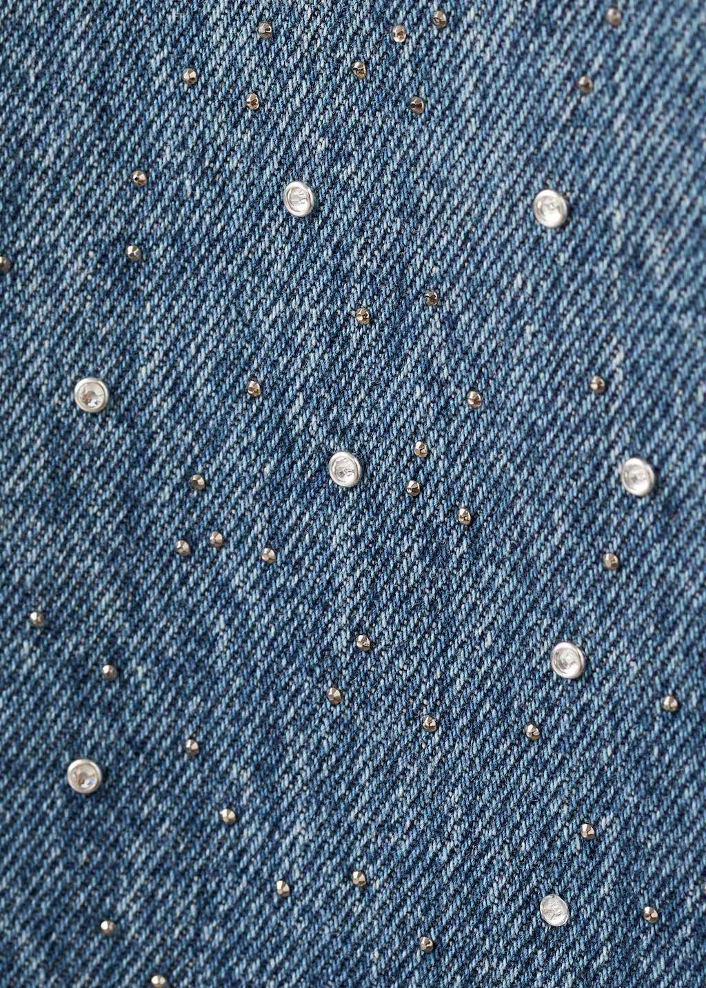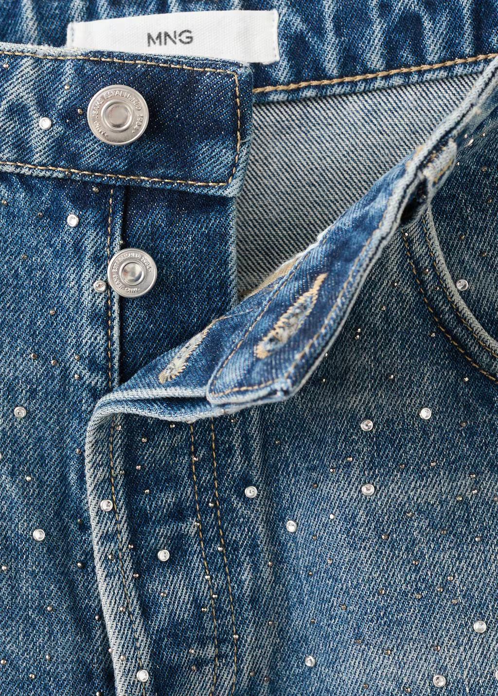 Cierre de botones. Tejido de algodón estilo tejano vaquero. Diseño largo. Diseño wide leg. Tiro medio. Trabillas. Cinco bolsillos. Adorno de strass. Esta prenda pertenece a nuestra colección de fiesta y evento, diseñada para elevar tus looks en ocasiones especiales