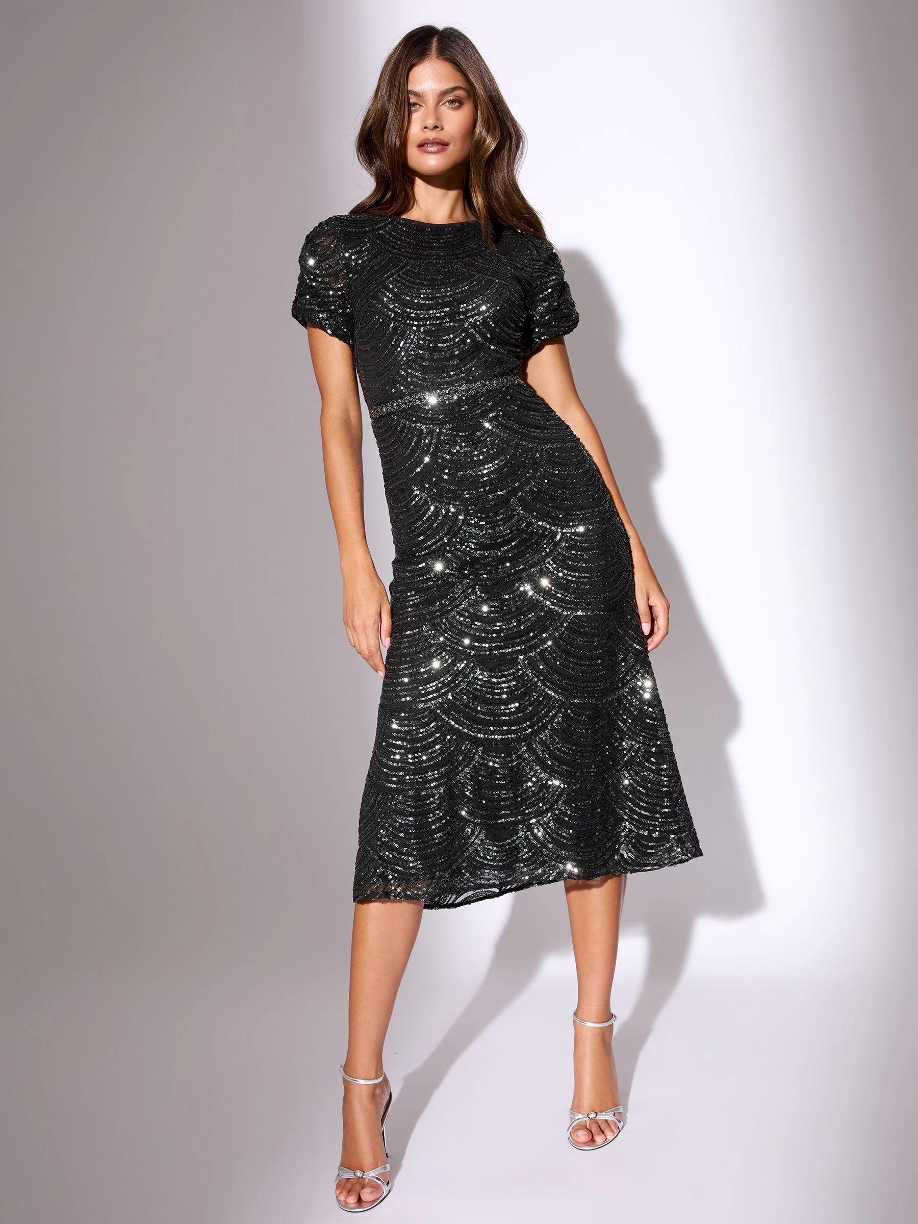 Lipsy Black Sleeve Fit Premium Sequin Embellished Short And Flare Midi Dress