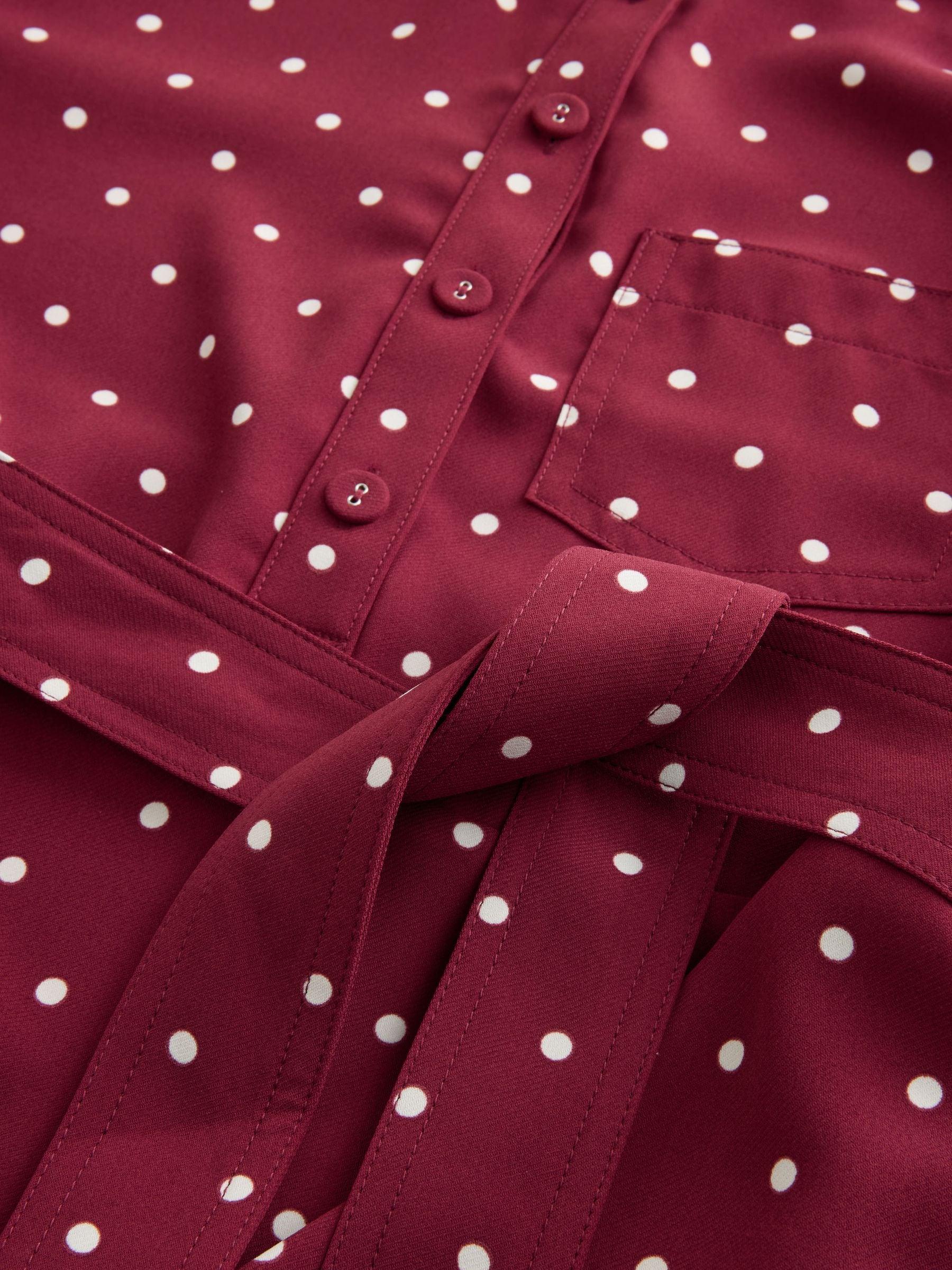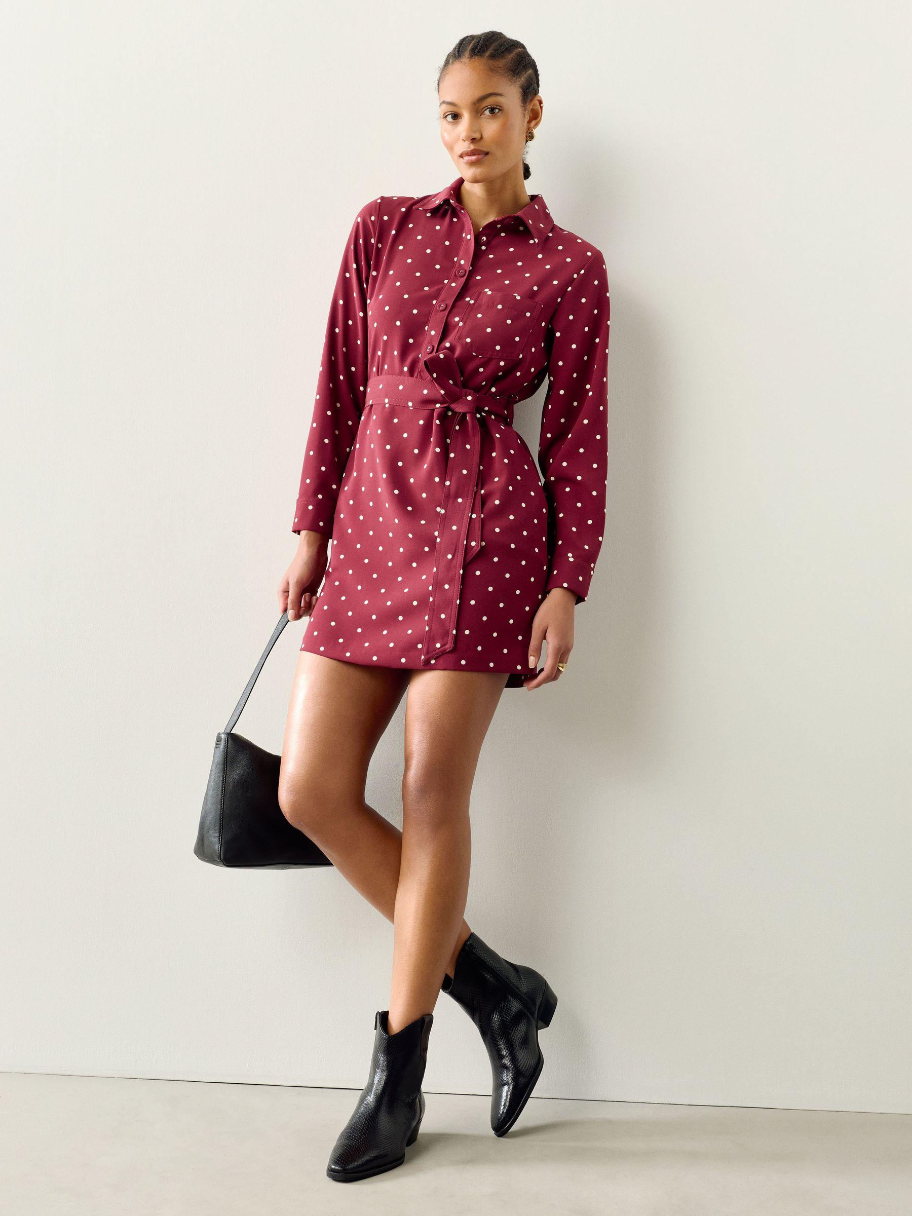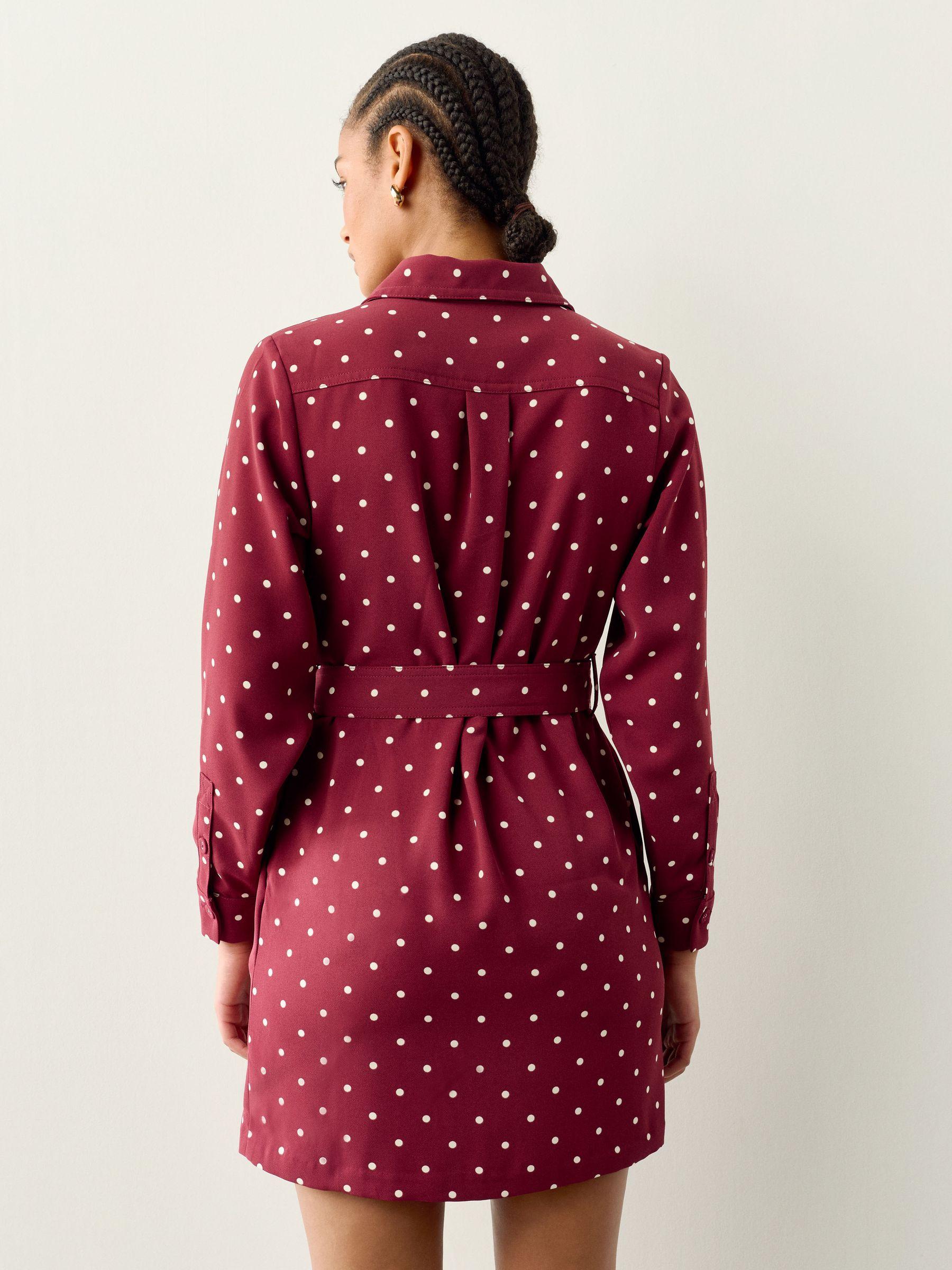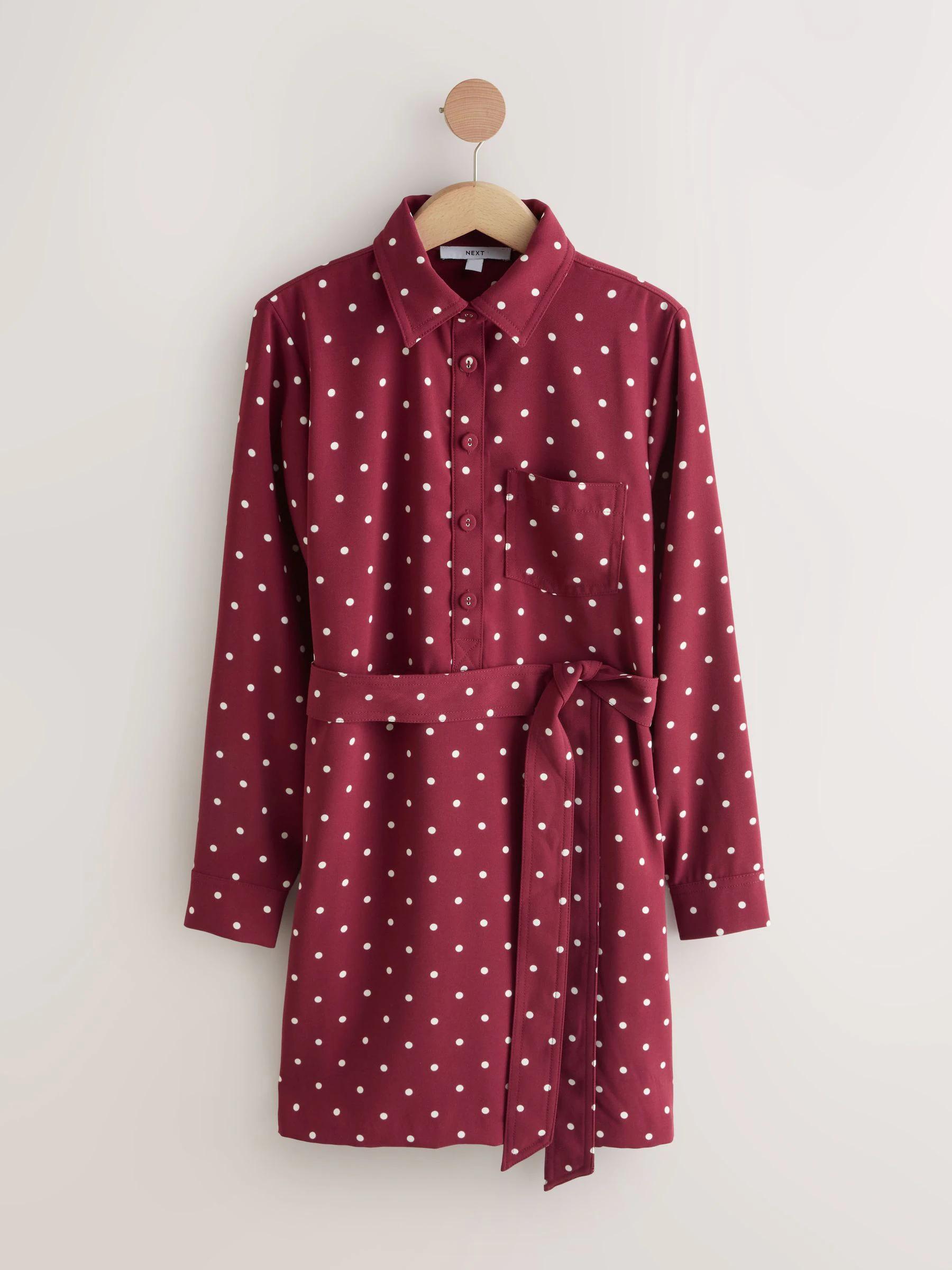 Burgundy Red Spot Long Sleeve Mini Tie Waist Shirt Dress