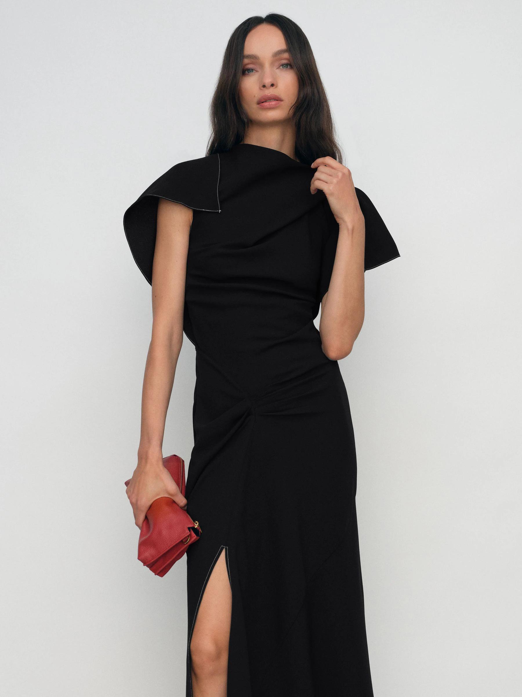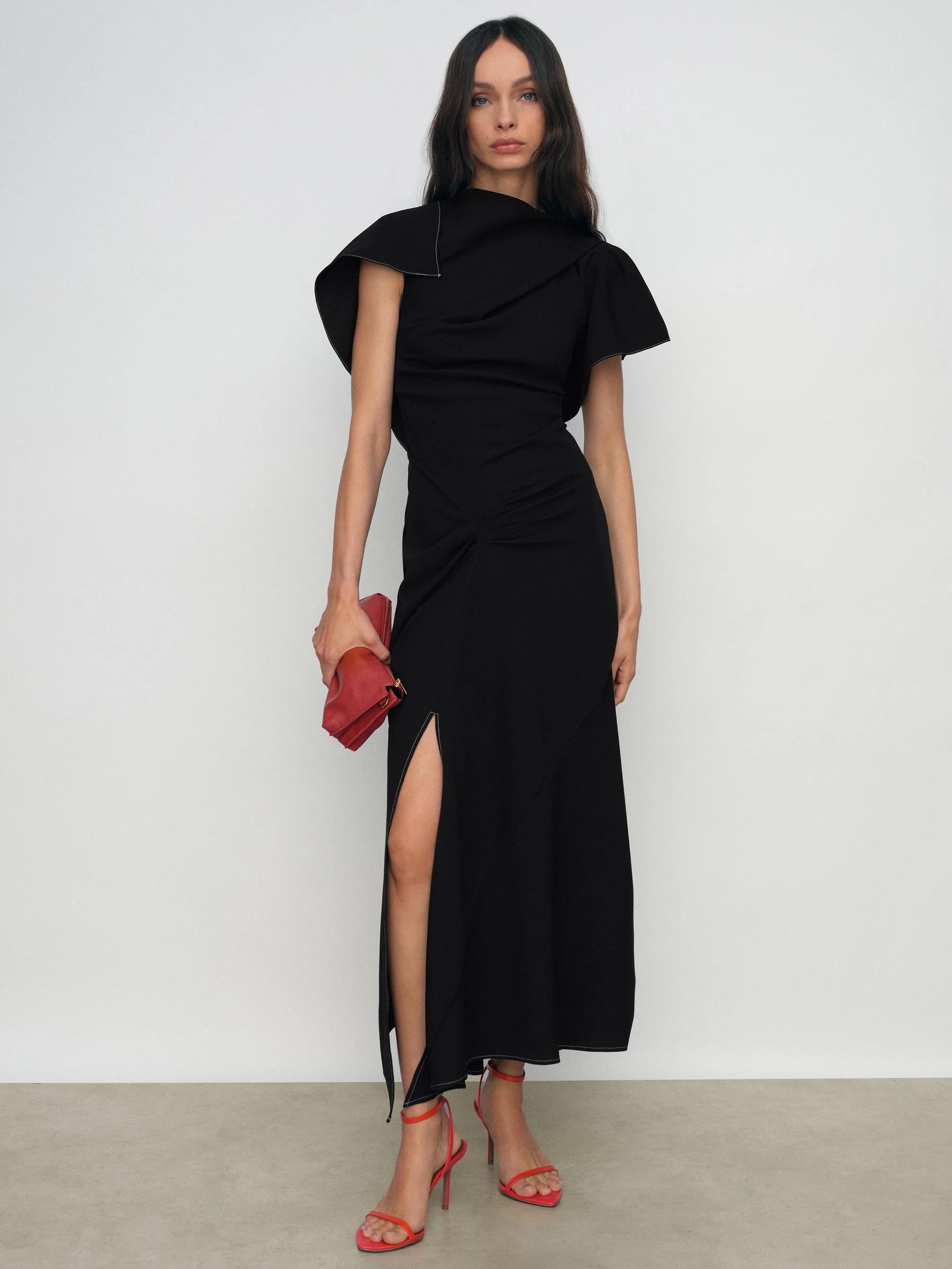 Reiss Black Saskia Asymmetric Draped Midi Dress