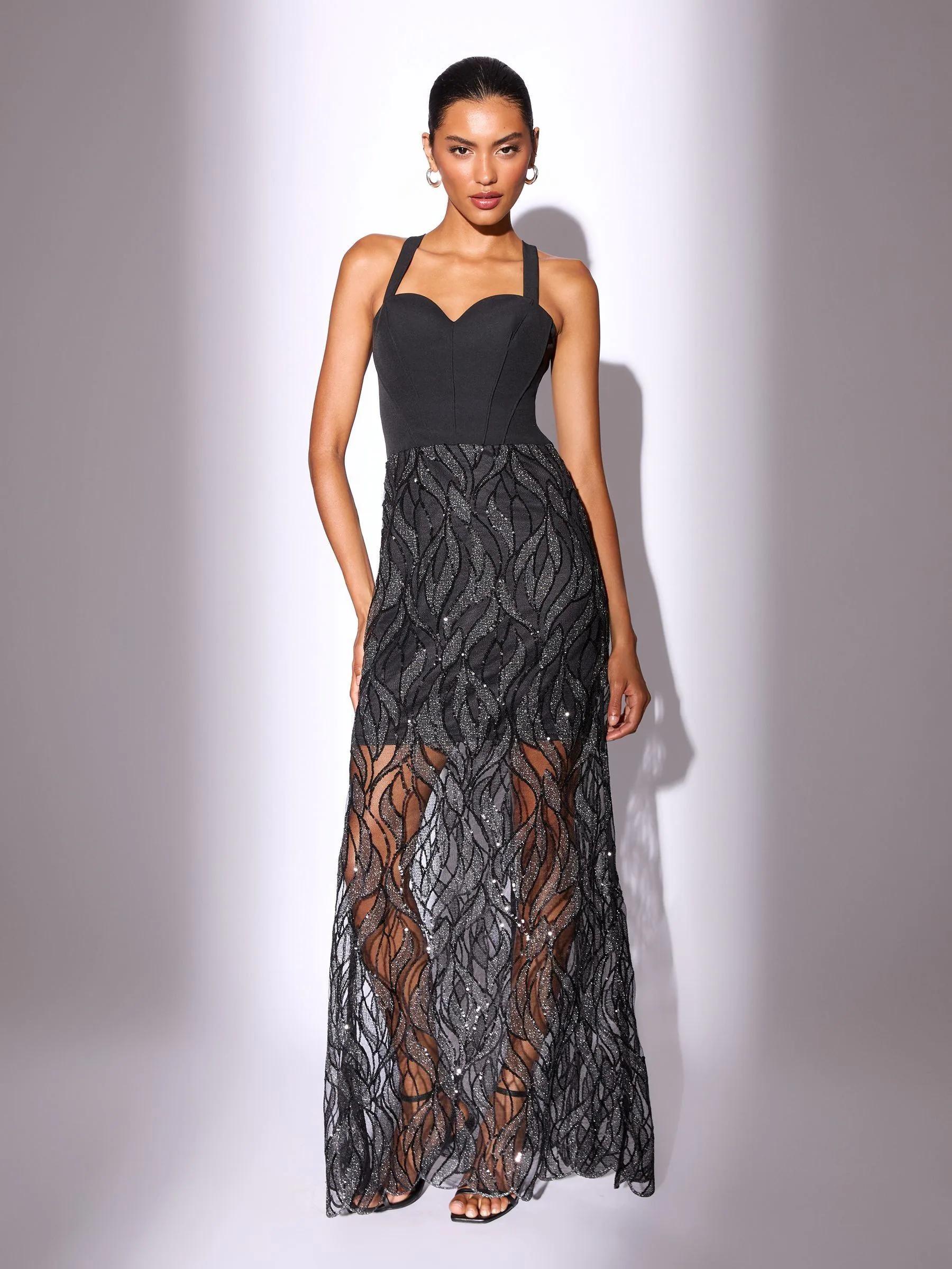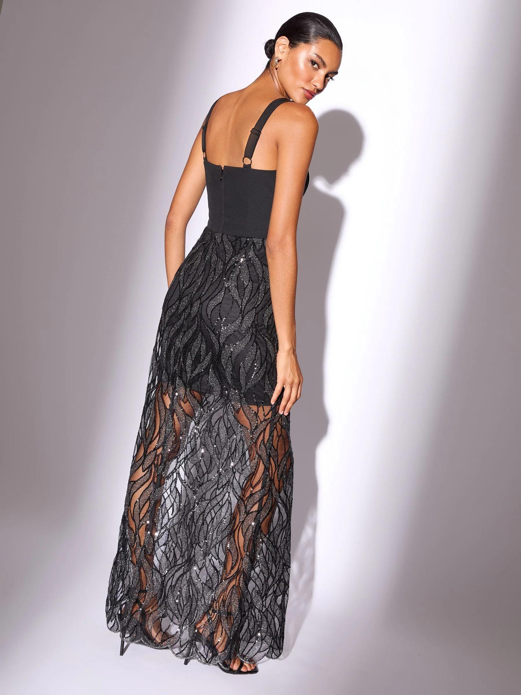 Lipsy Black Corset Detail Sequin Sheer Skirt Maxi Dress