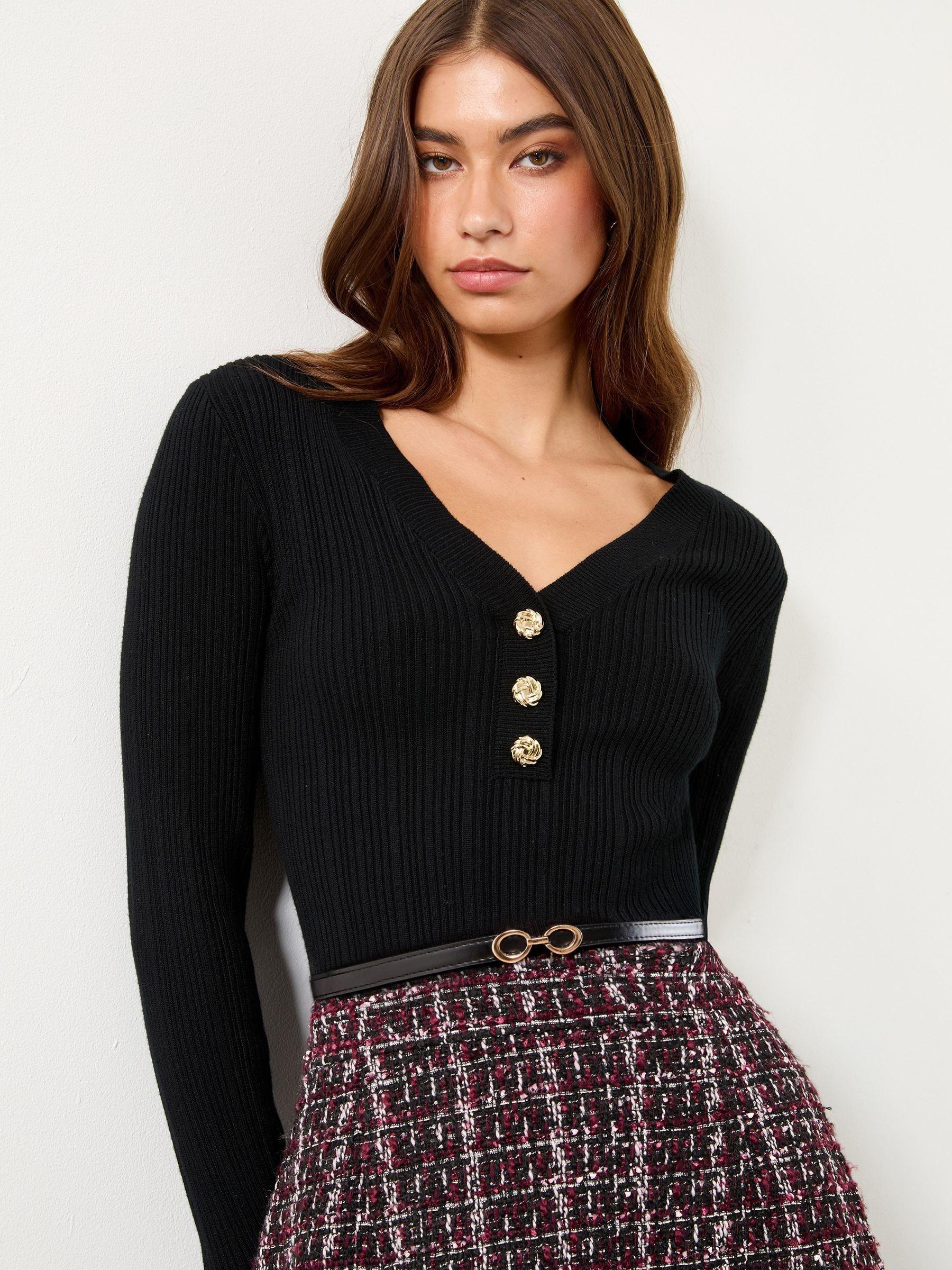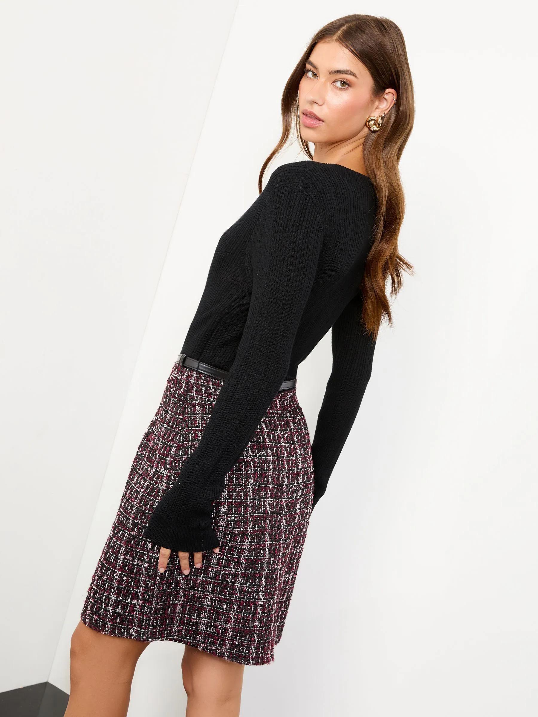 Lipsy Black/Burgundy Mini Boucle Check 2-in-1 V-Neck Knitted Dress