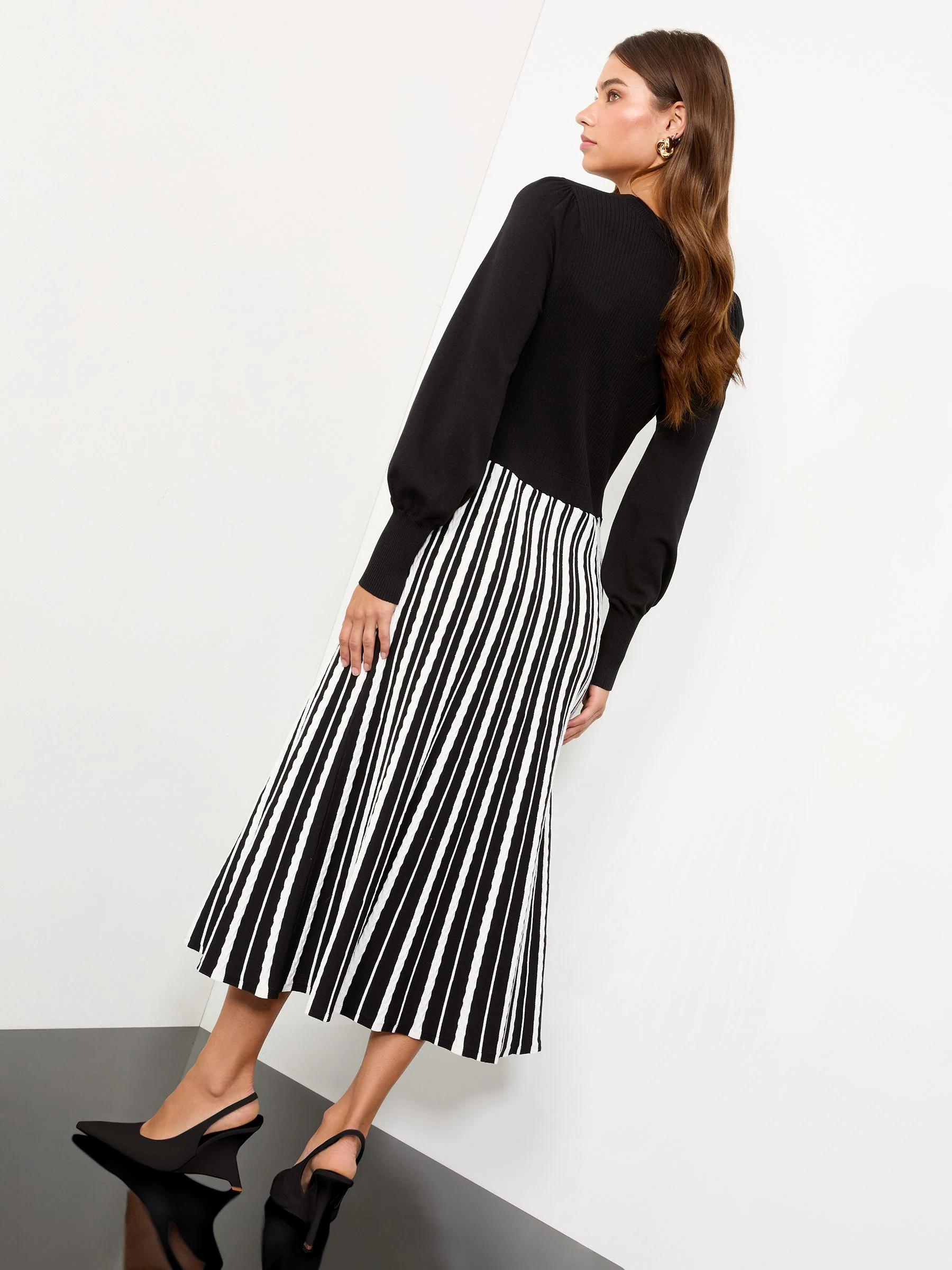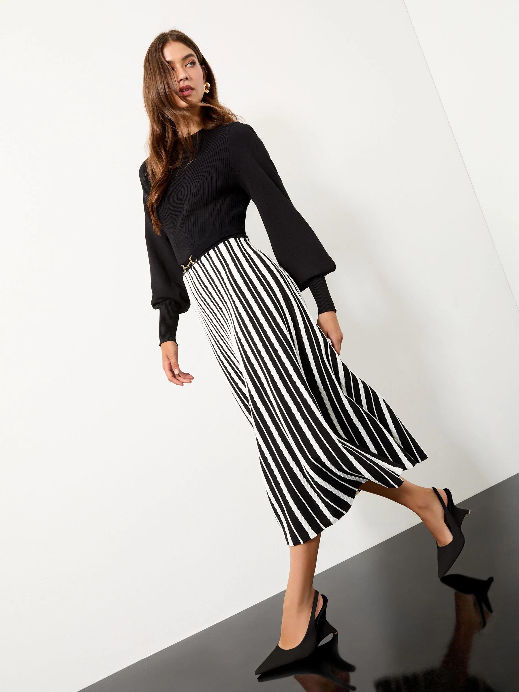 Lipsy Black/White Gold Snaffle Trim Crew Neck Long Sleeve Stripe Patterned Knitted Midi Dress