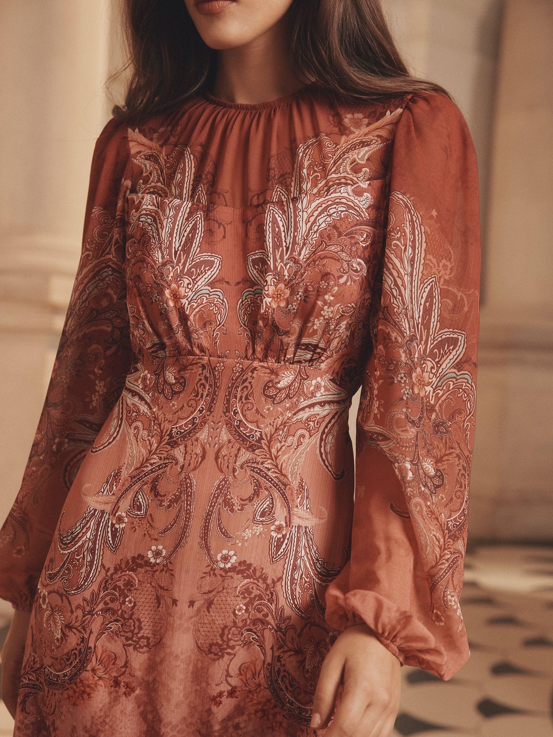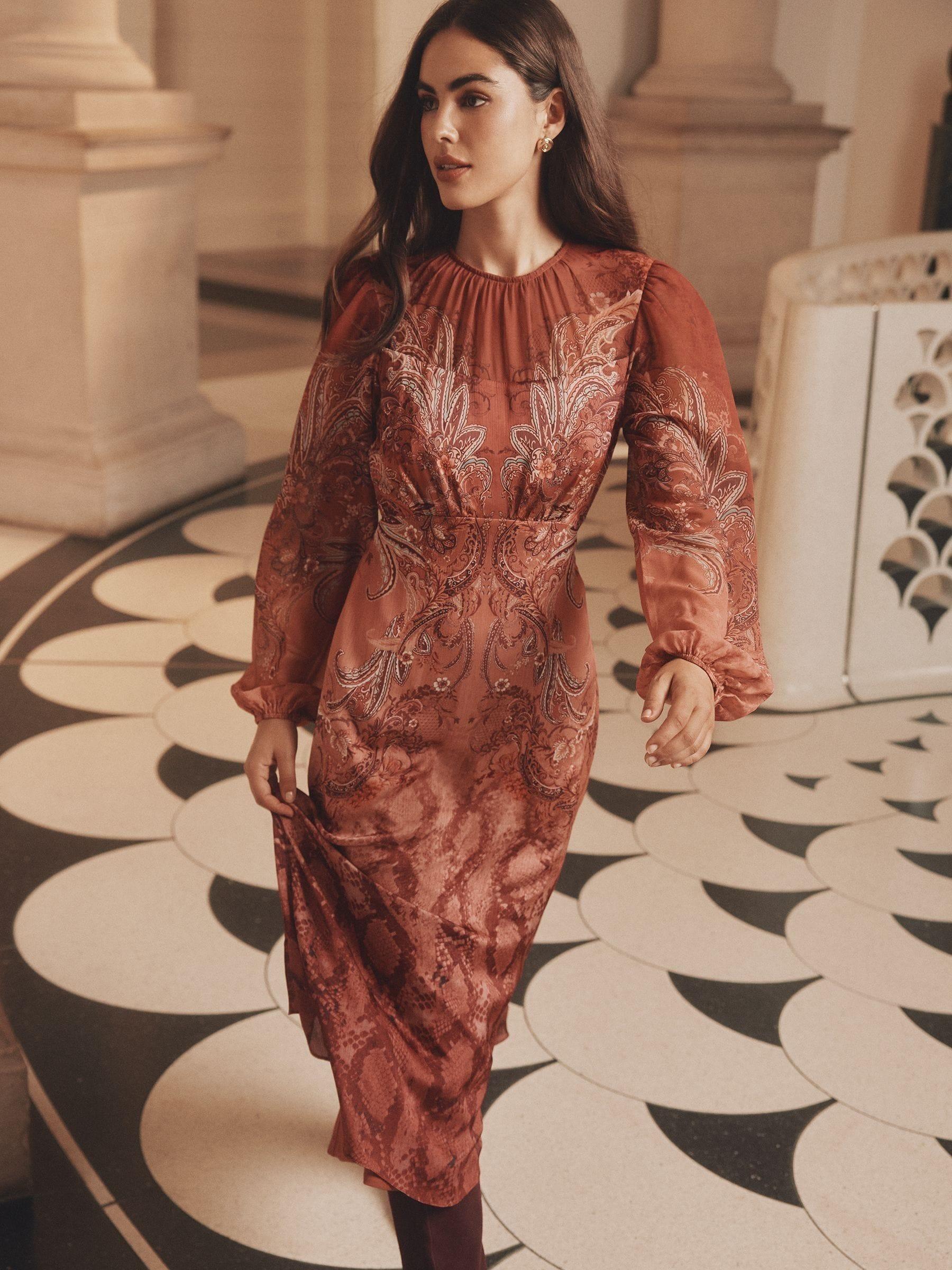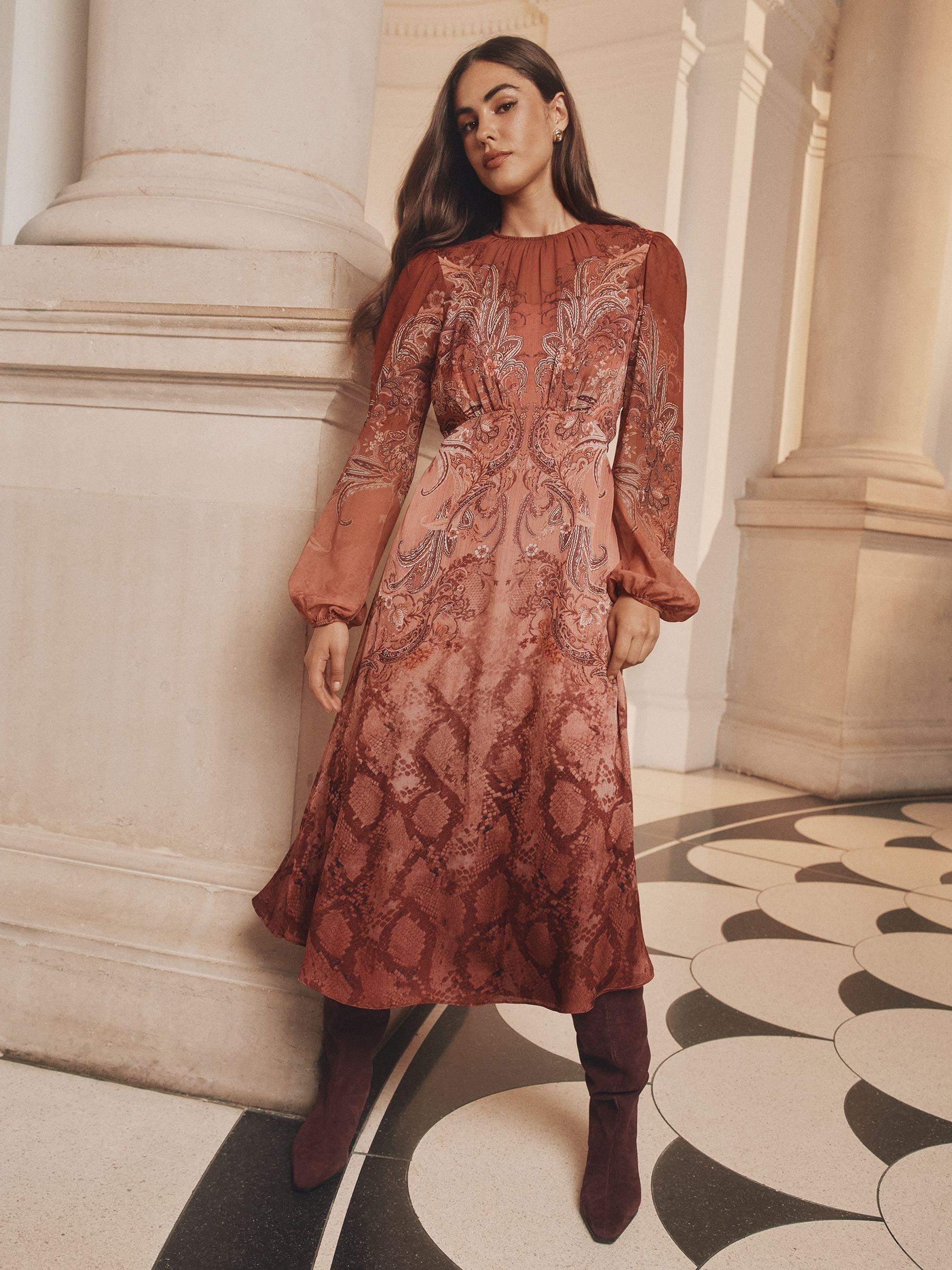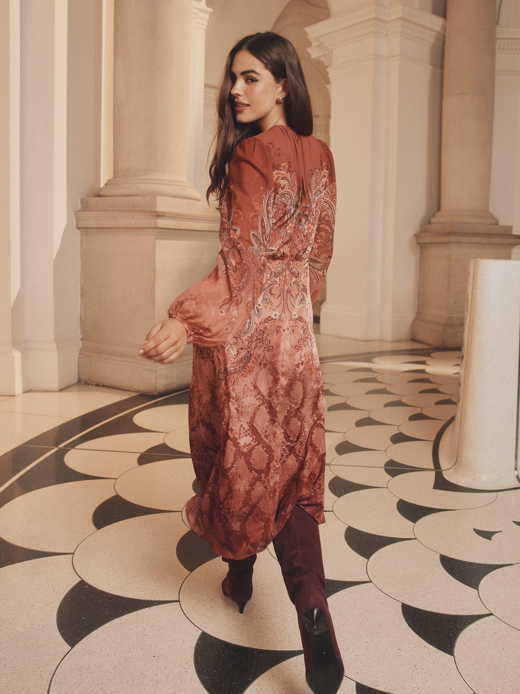Lipsy Orange Printed Printed Long Sleeve Underbust Fit And Flare Midi Dress