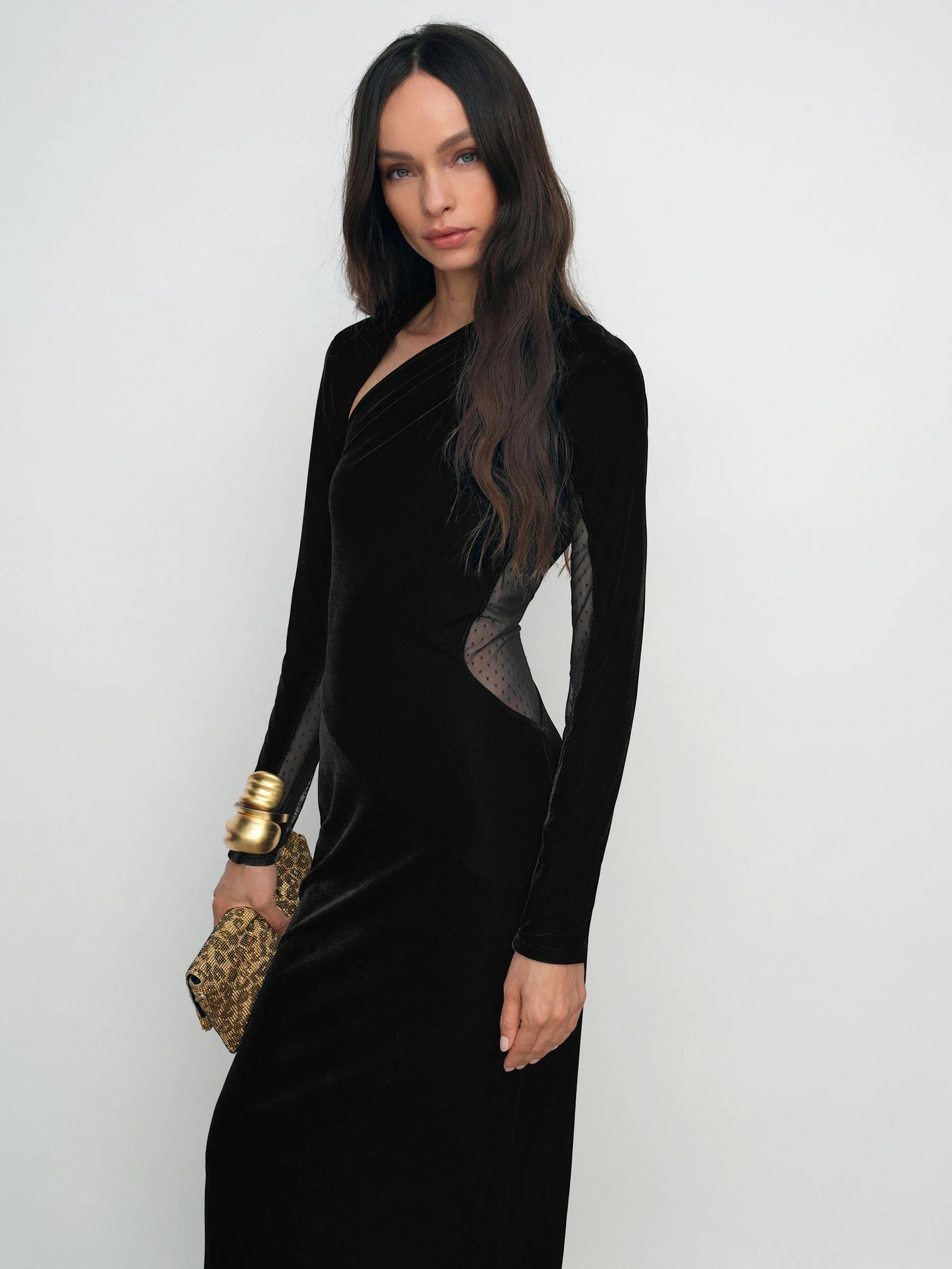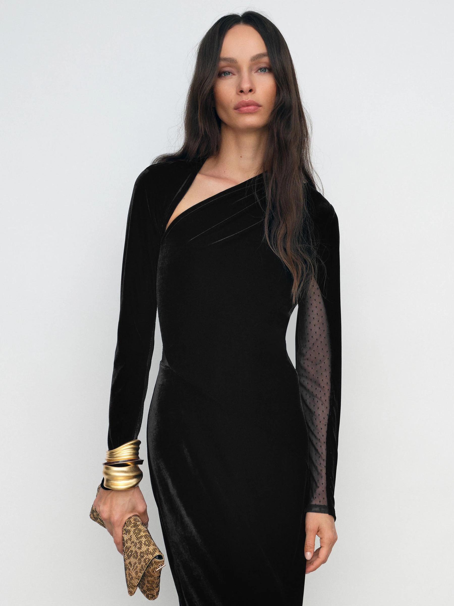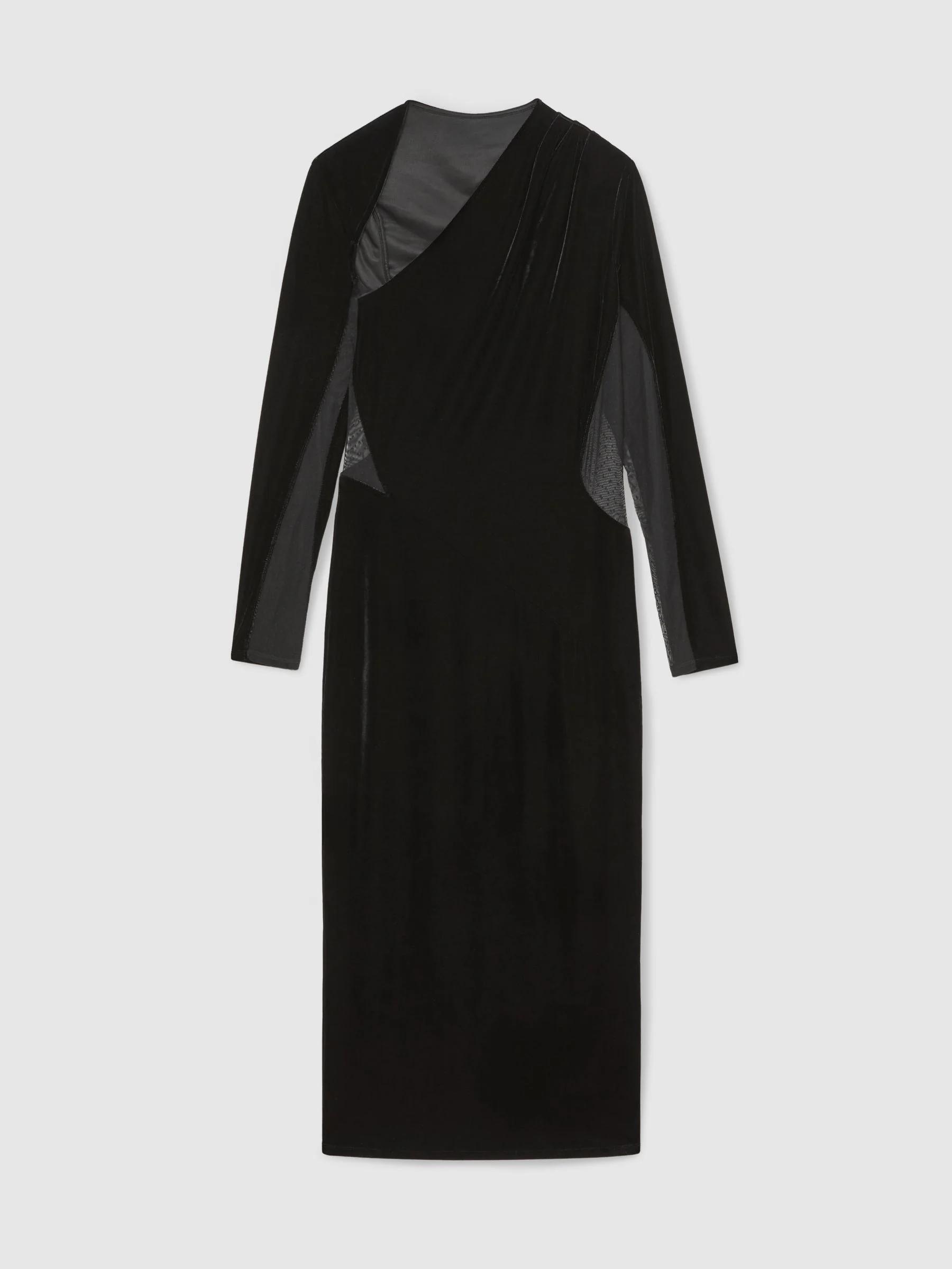 Reiss Black Kass Petite Velvet Sheer-Panel Cut-Out Midi Dress