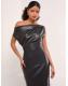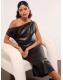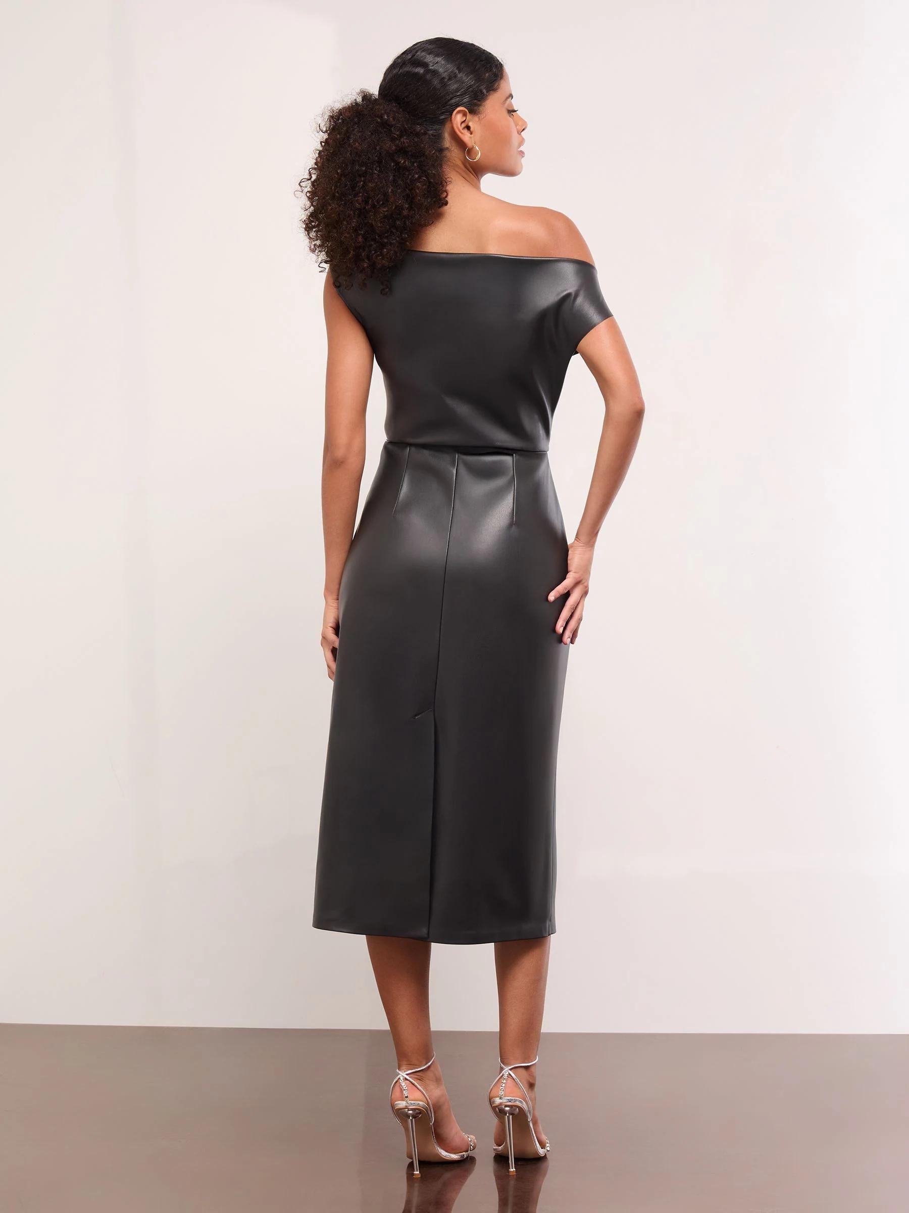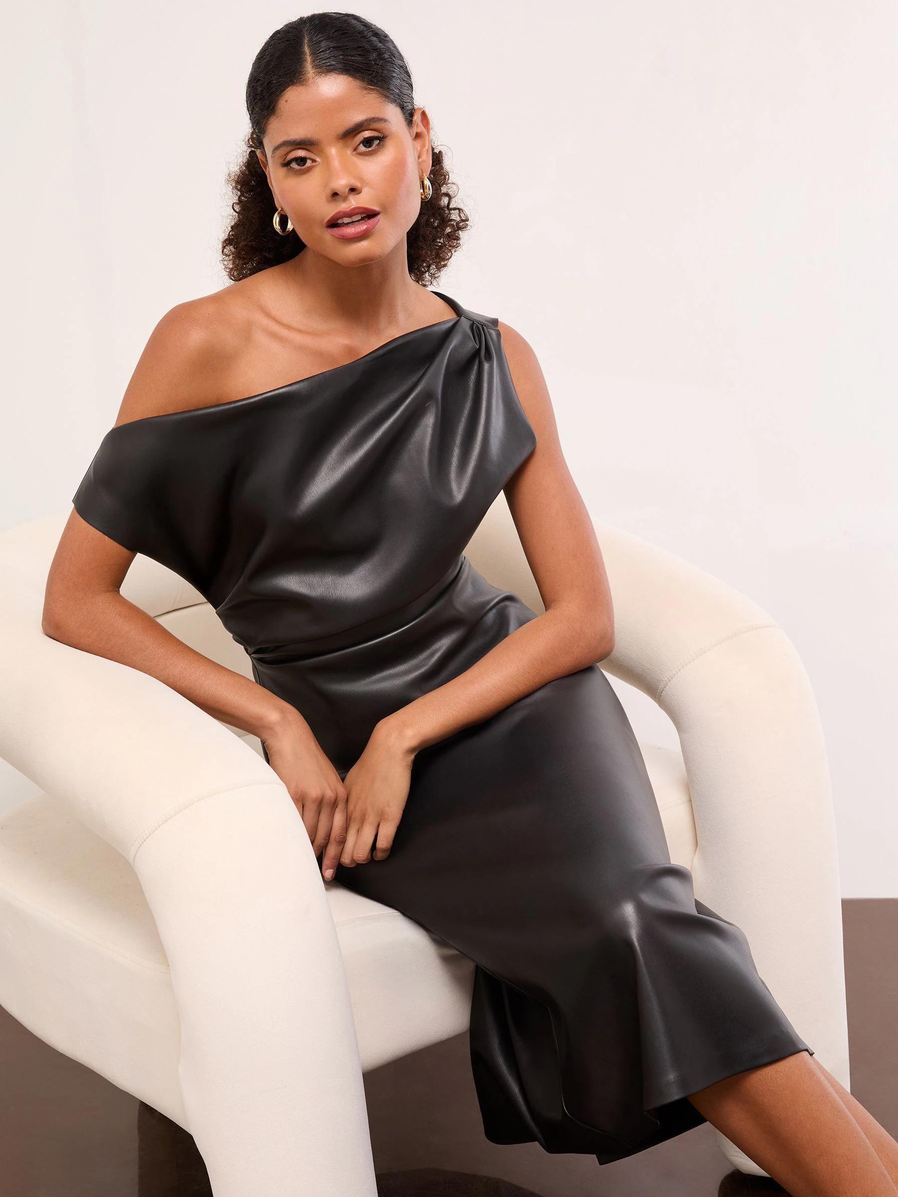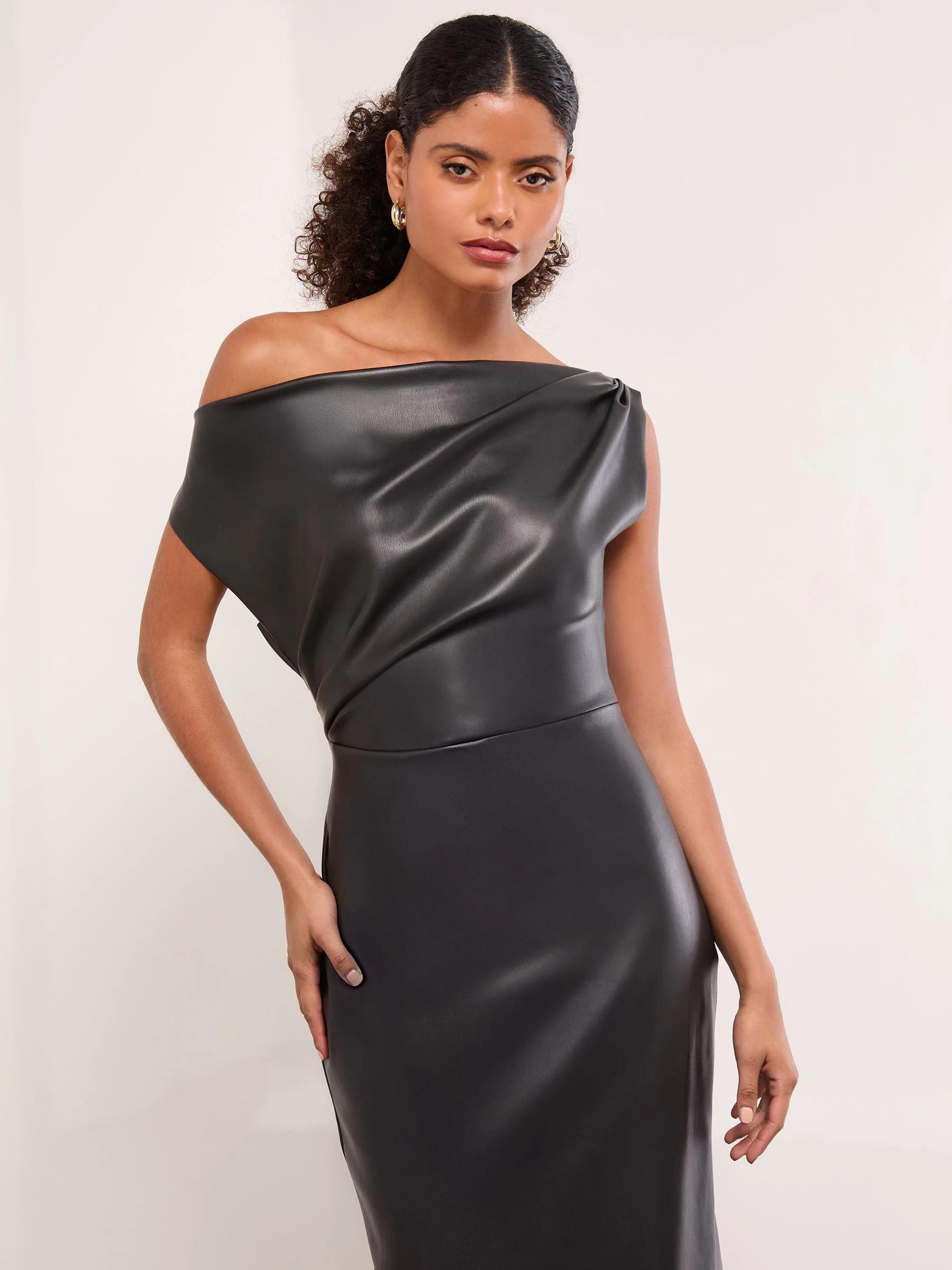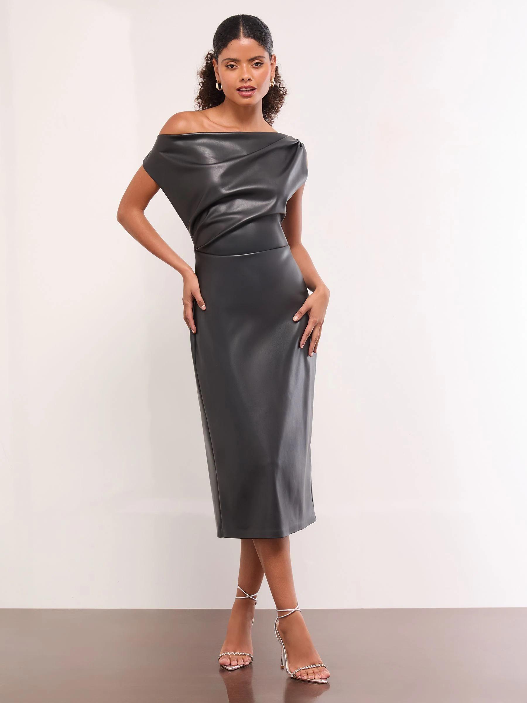 Lipsy Black Faux Leather Off The Shoulder Draped Midi Dress
