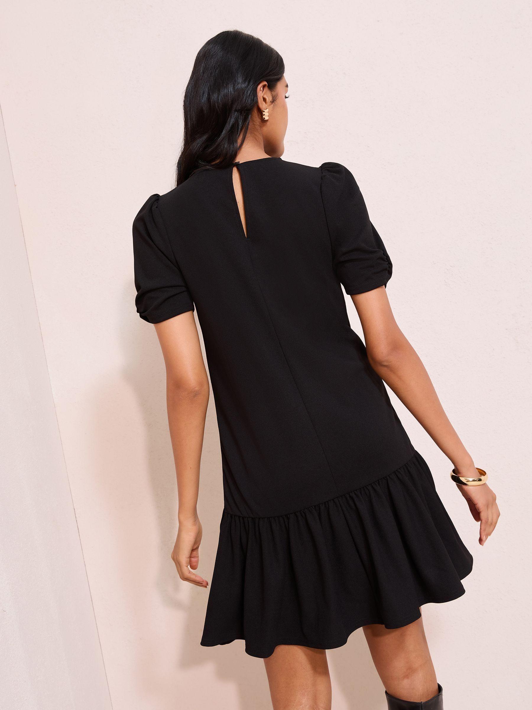 Friends Like These Black Petite Scuba Ruched Sleeve Pep Hem Mini Dress