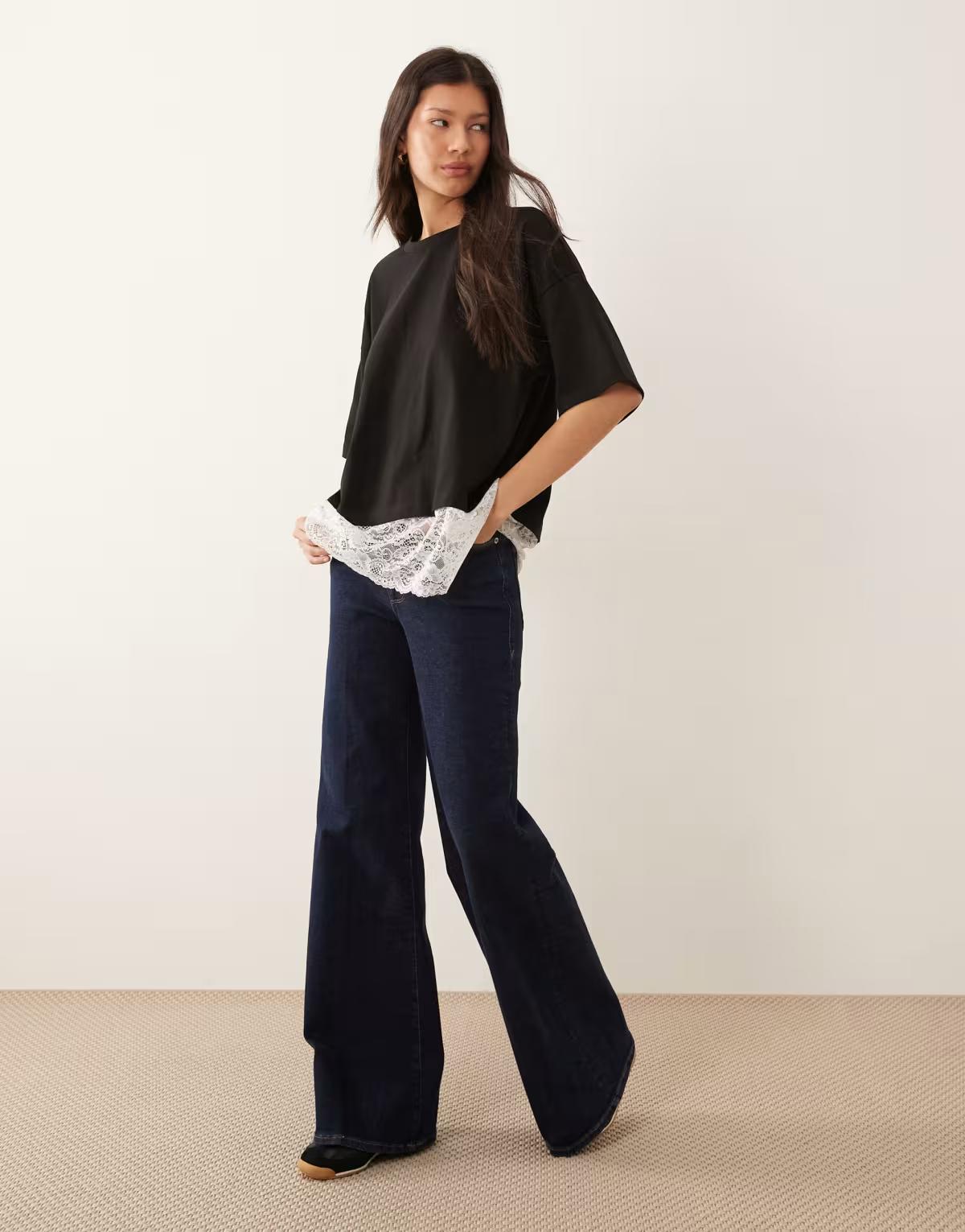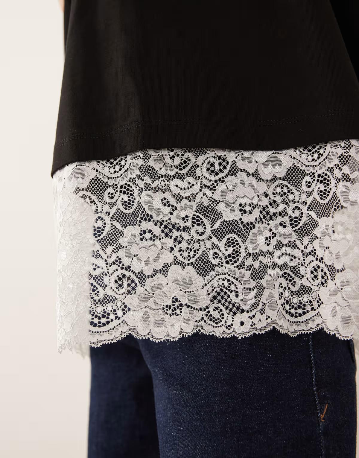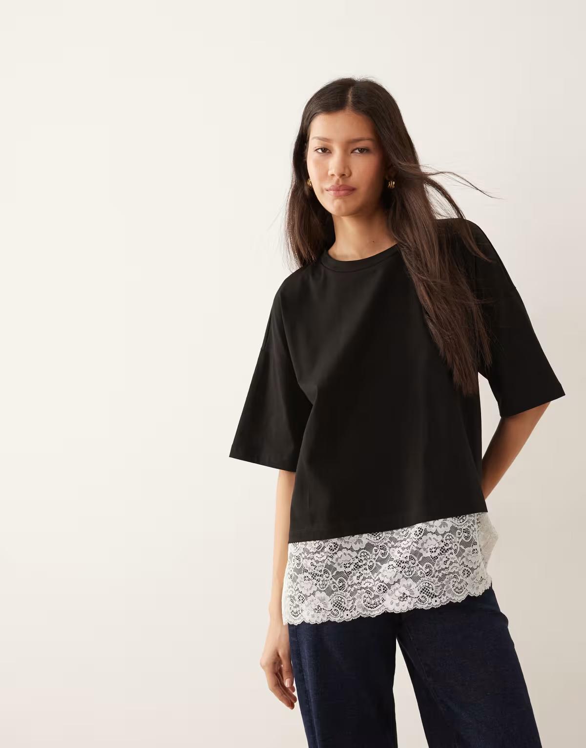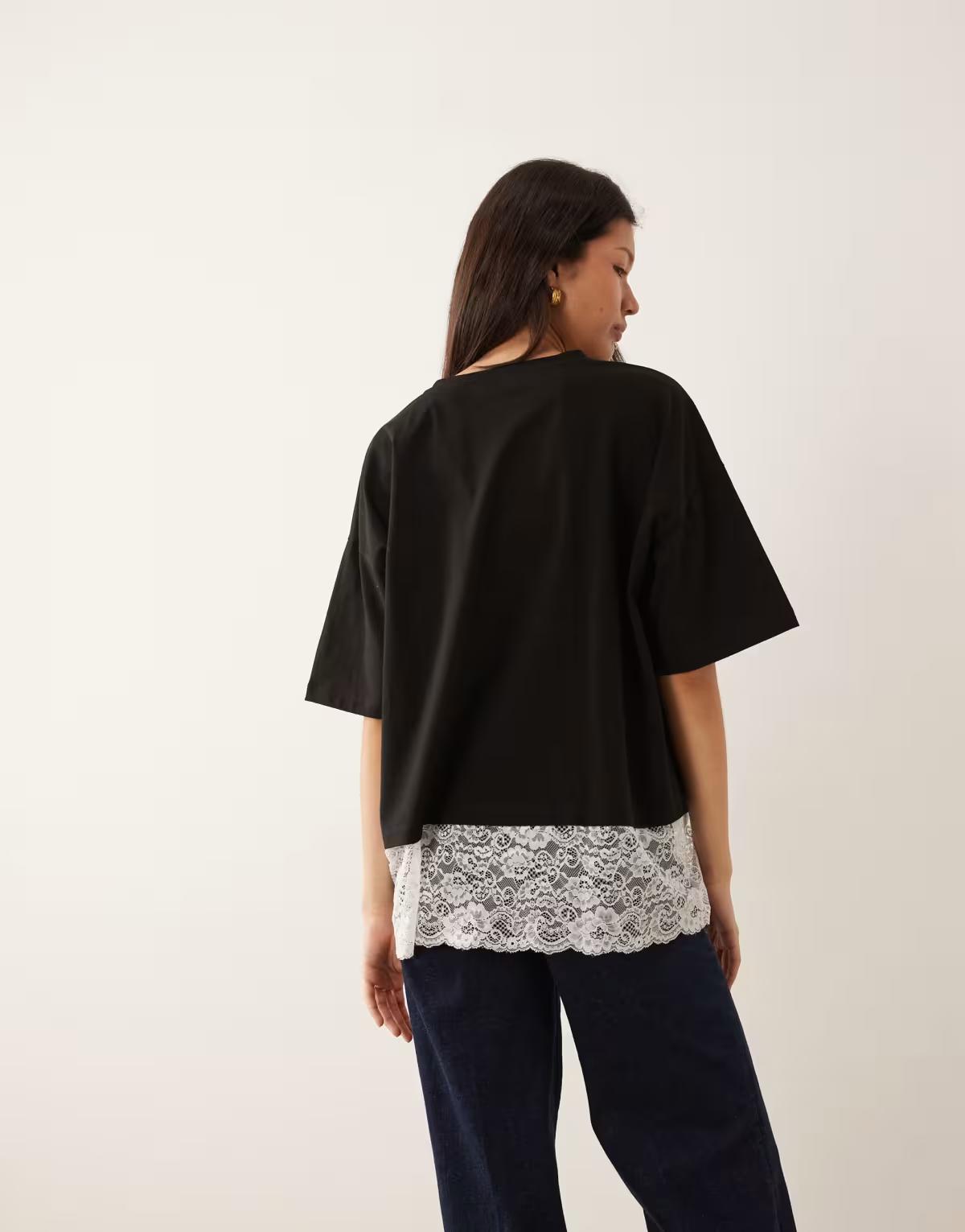 ASOS DESIGN oversized tee monochrome with deep lace hem trim underlayer in black