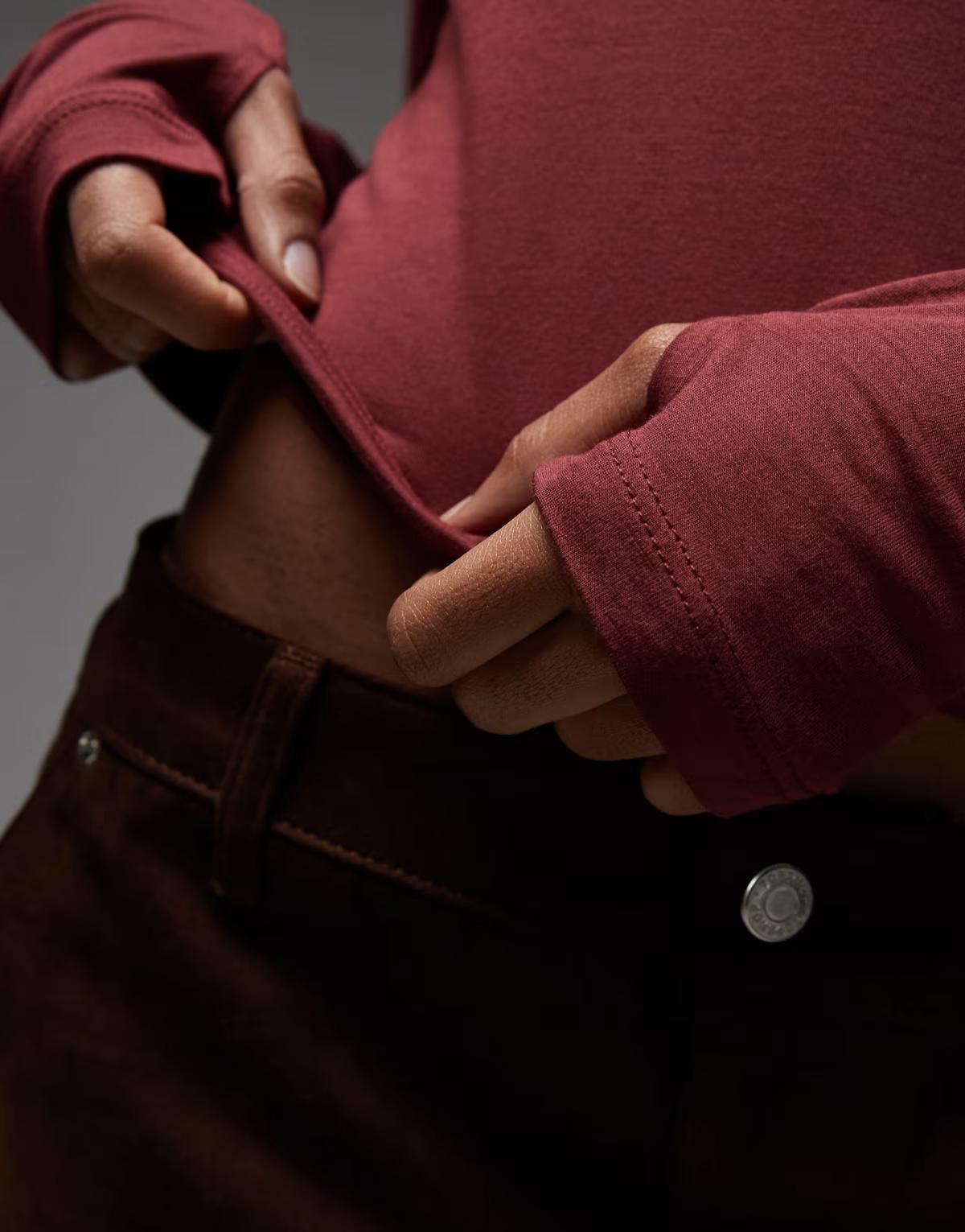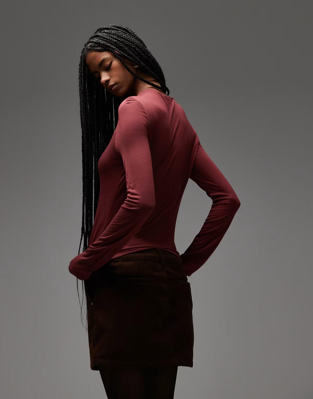 ASOS DESIGN semi sheer long sleeve second skin top in berry