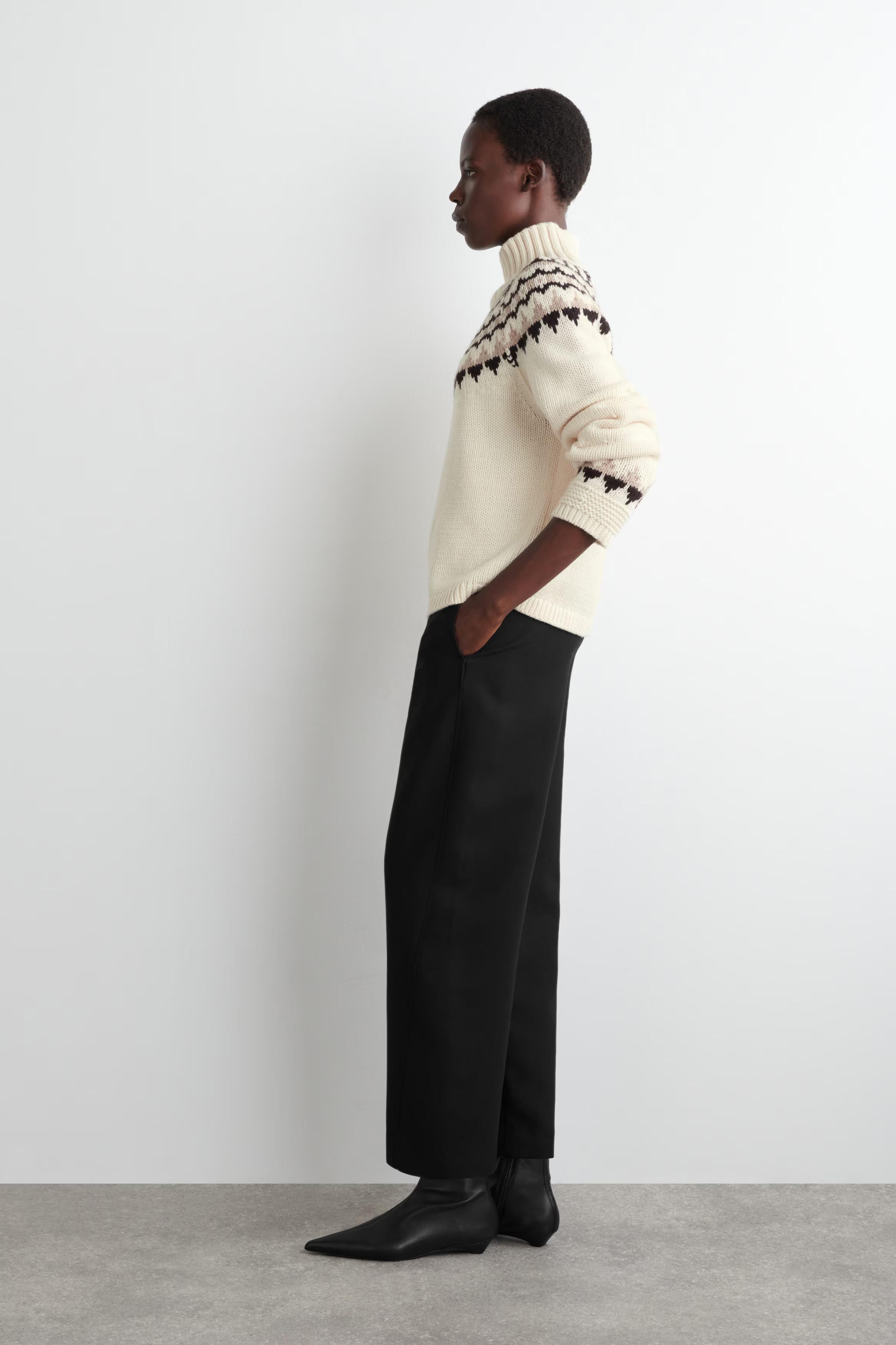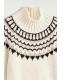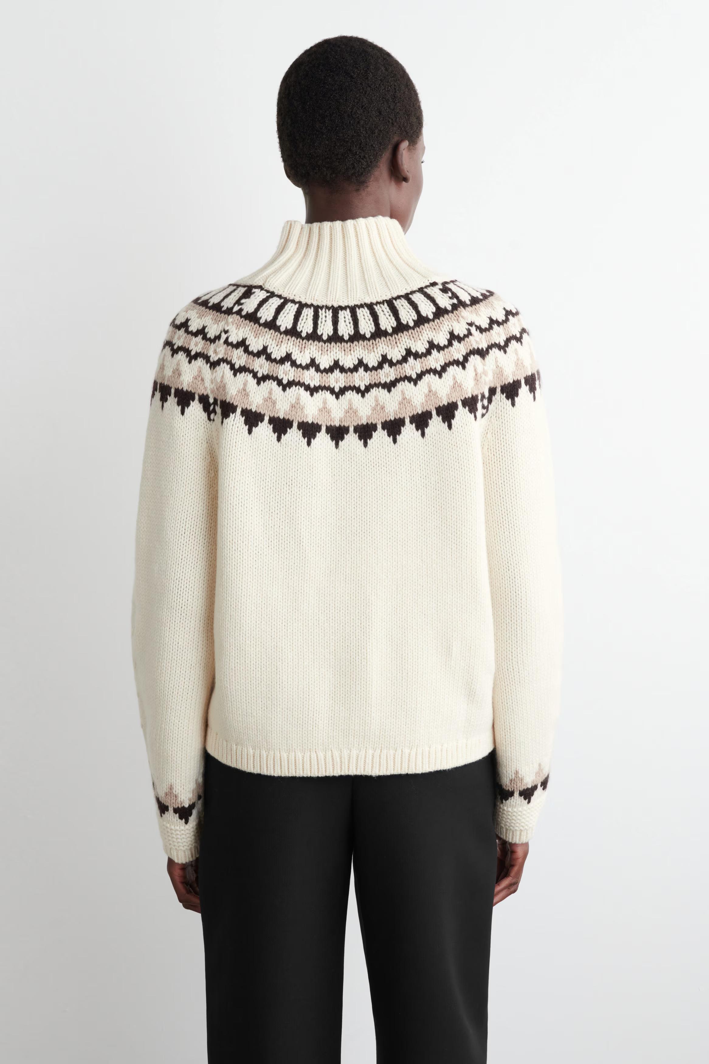 This season, the womenswear team reimagine heritage codes through a modern lens. Offered in a subdued cream tone, this jumper is made from merino wool with hints of cashmere for a luxurously soft hand feel and patterned with a refined fairisle motif. The funnel neck, cuffs and hem are finished with ribbed trims.\u0026nbsp;Regular fitThis product contains Responsible Wool Standard TE-00047206 (RWS) wool fibre from farms certified to animal welfare and land-management requirements\u0026nbsp;Shell: 90% Merino wool, 10% GCS Cashmere. Excluding trims / Machine wash\u0026nbsp;Back length of size S is 58cm / Model wears a size S