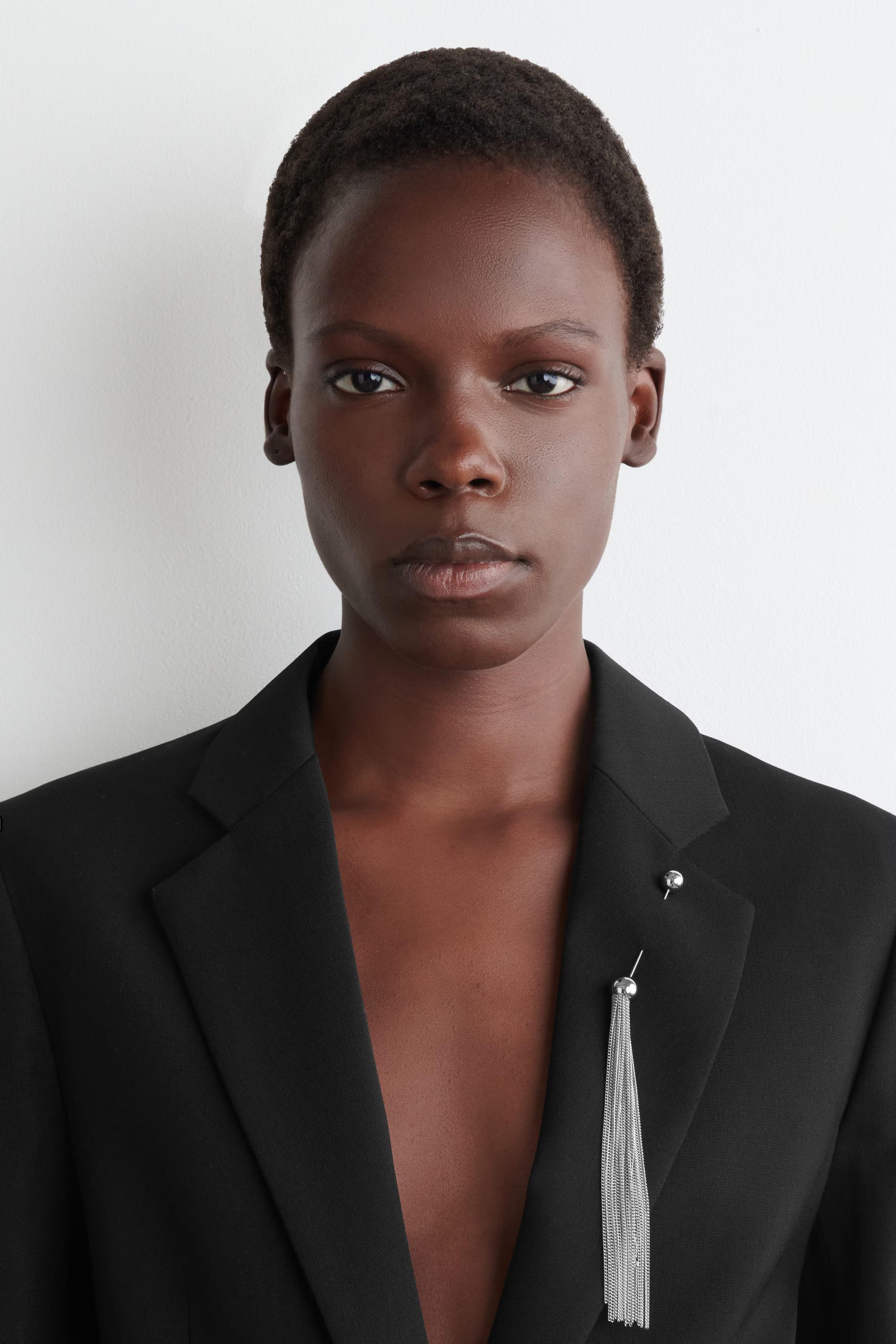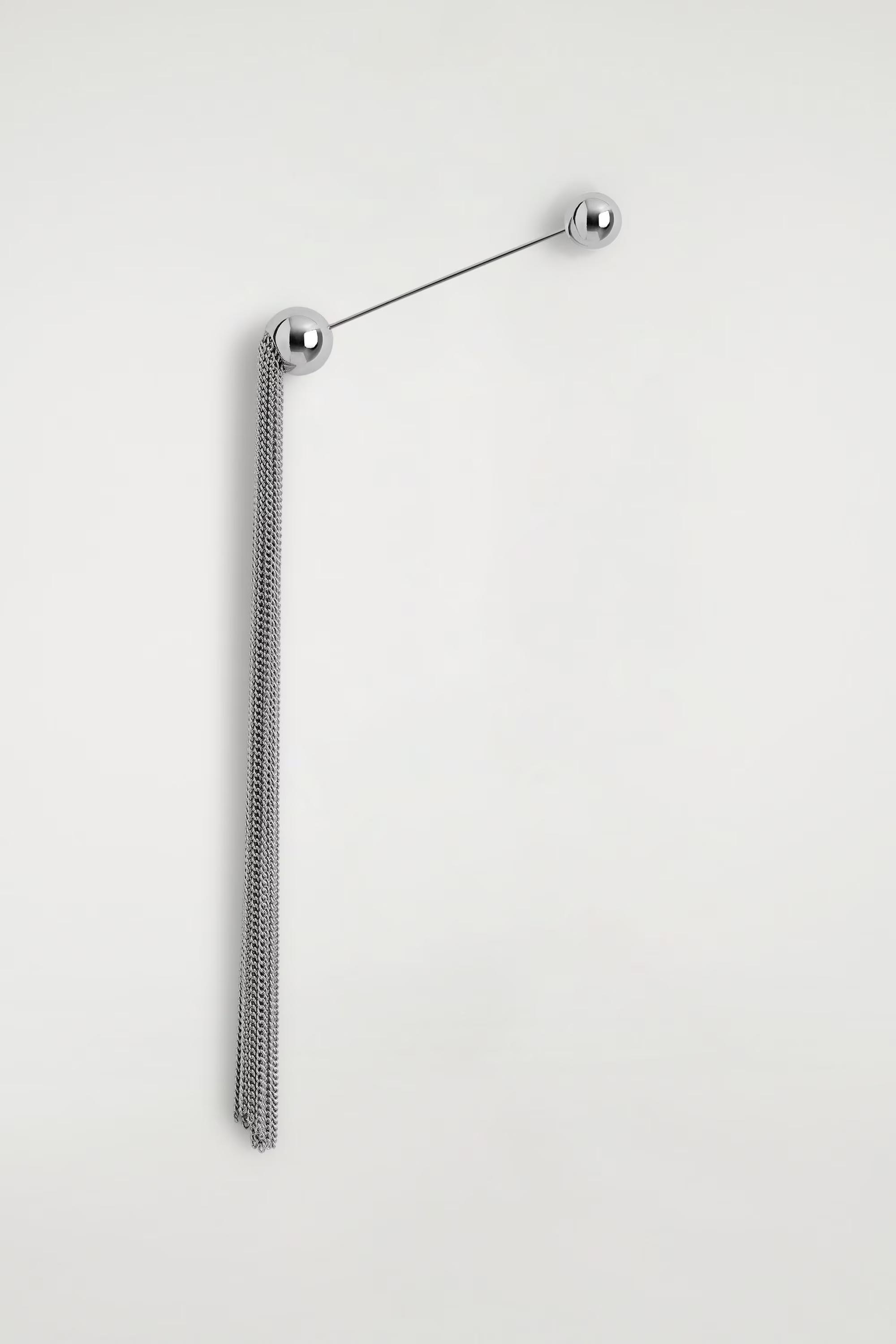 This season, the COS jewellery designers capture the art of simple yet impactful silhouettes. Crafted from silver-tone recycled brass, this striking brooch is detailed with tasselled chains that cascade from a tonal sphere. Pin it to the lapel of a blazer.\u0026nbsp;Pin closureBrass is a versatile material that can be recycled numerous times without losing any of its properties\u0026nbsp;\u0026nbsp;Shell: 98% Post-consumer recycled brass, 2% Post-consumer recycled steel. Excluding trims