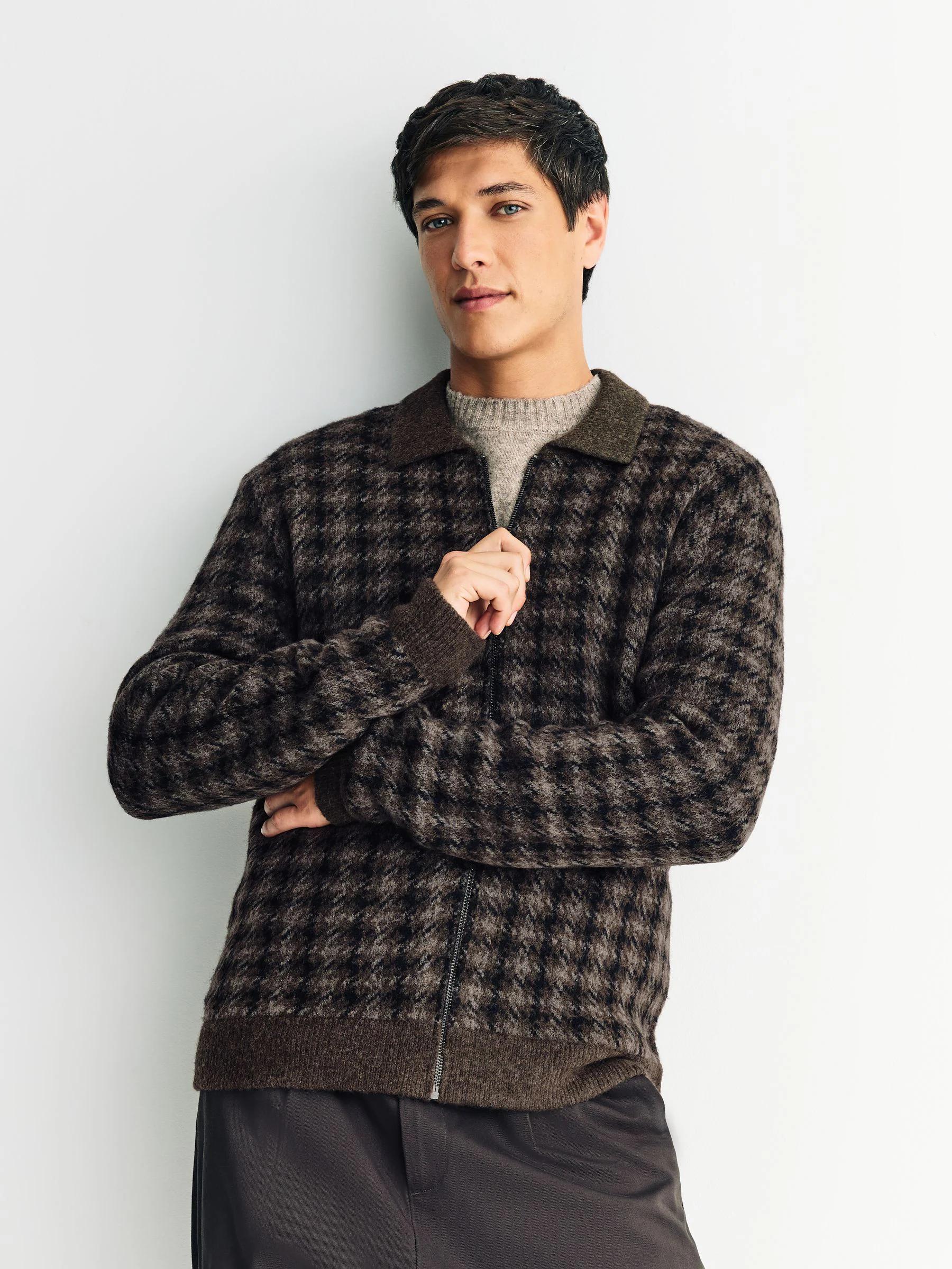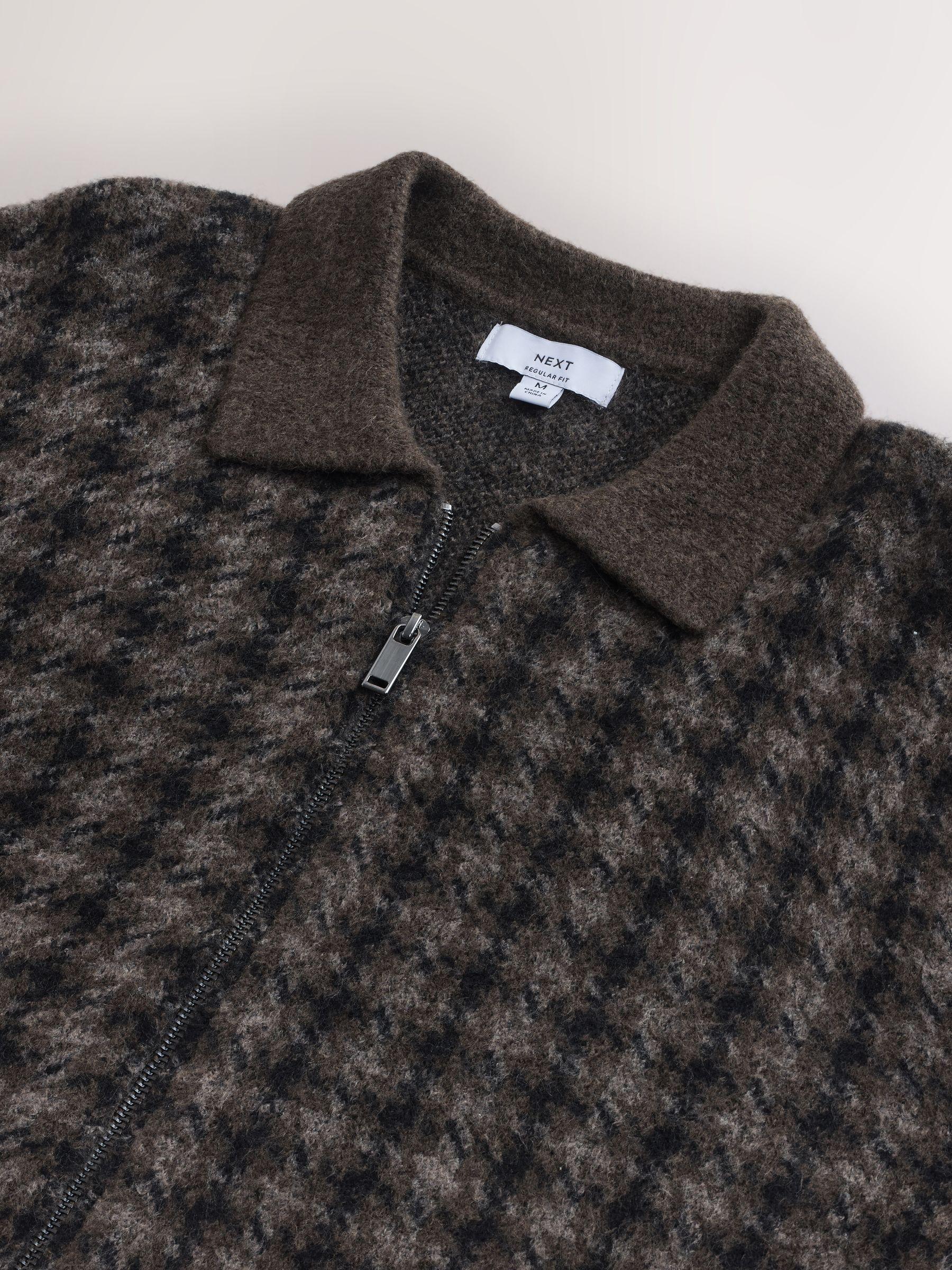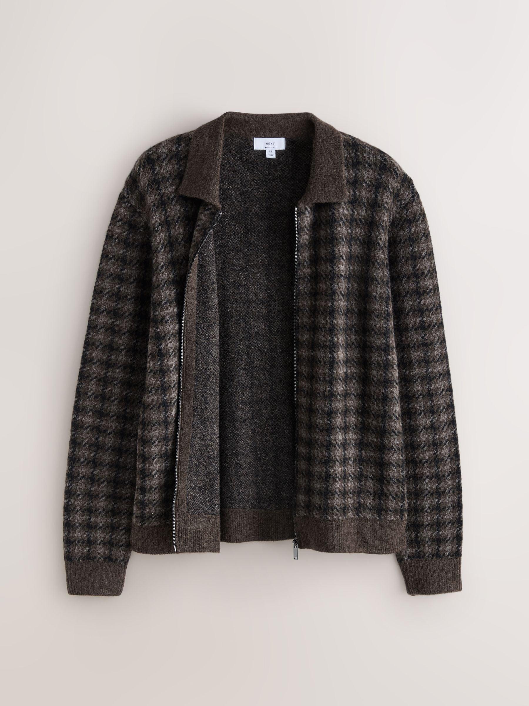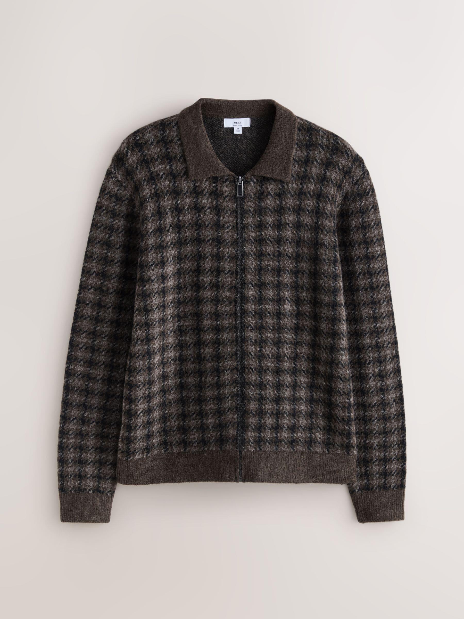 Brown Regular Fit Check Collared Zip-Through Cardigan with Wool