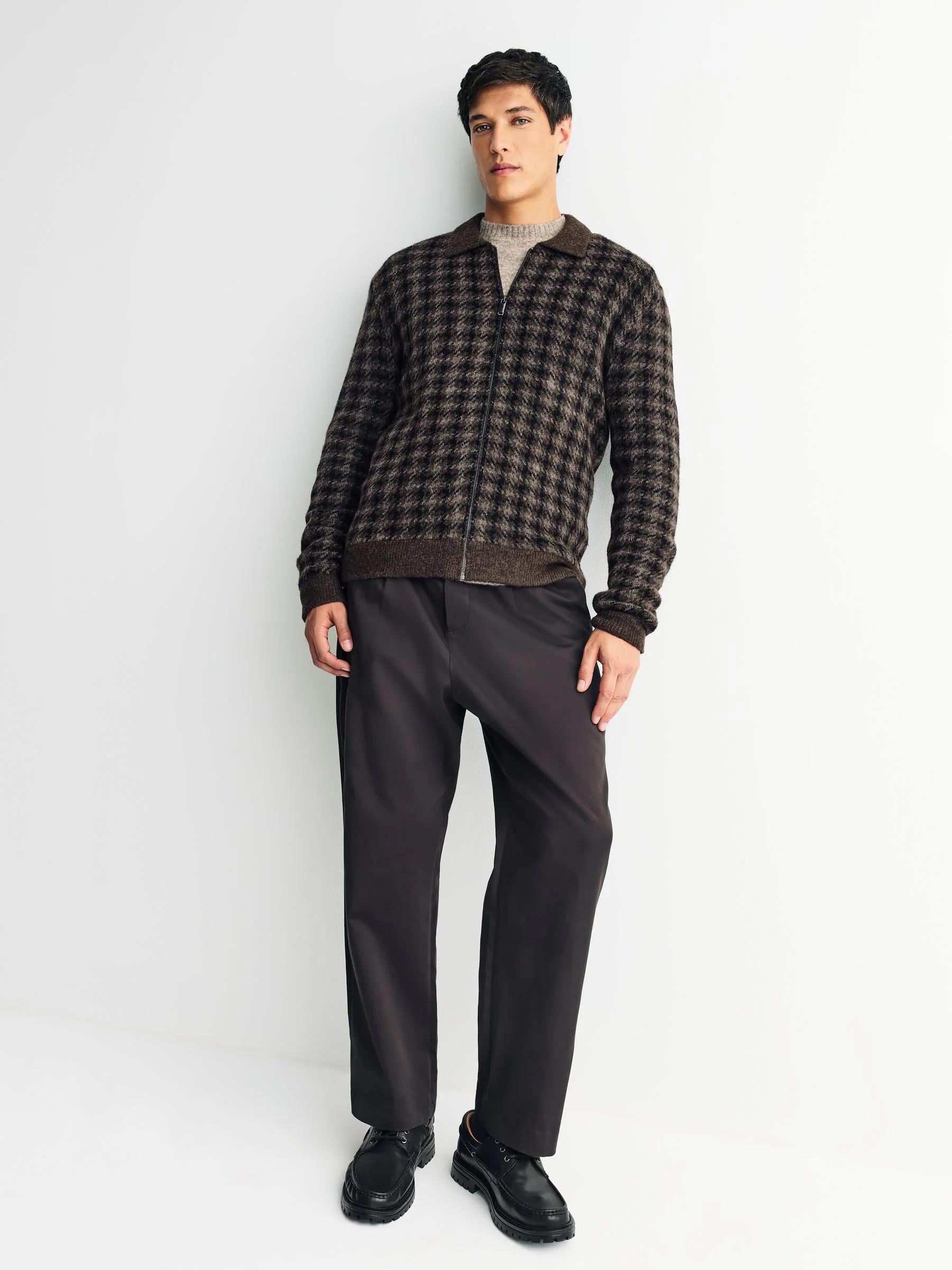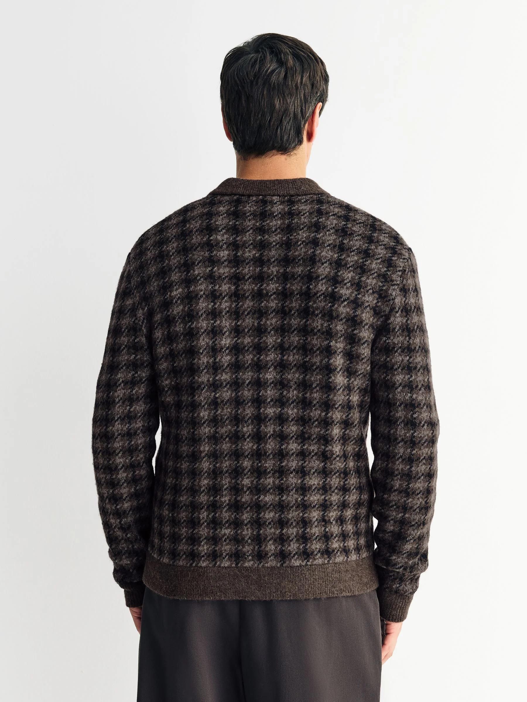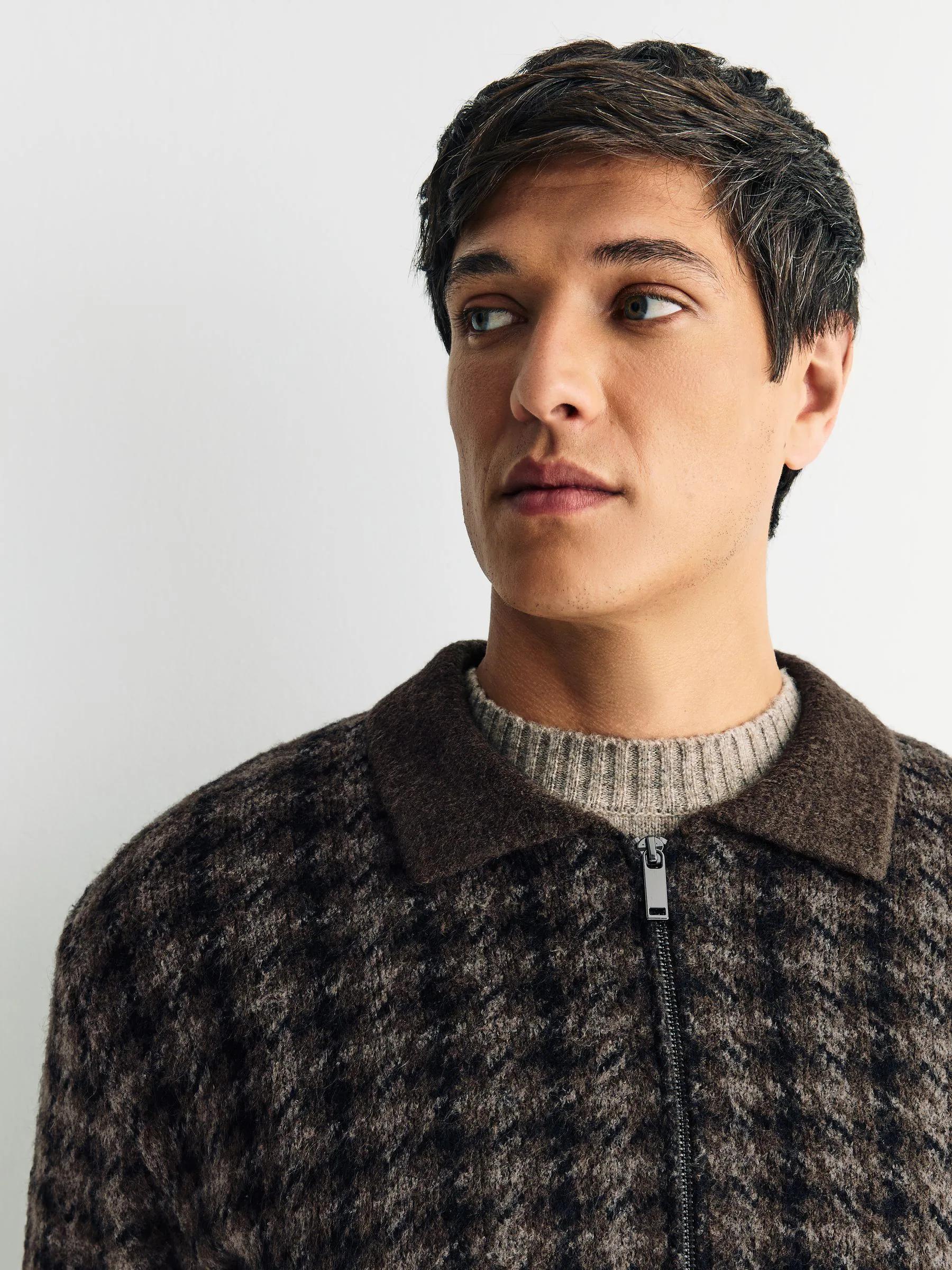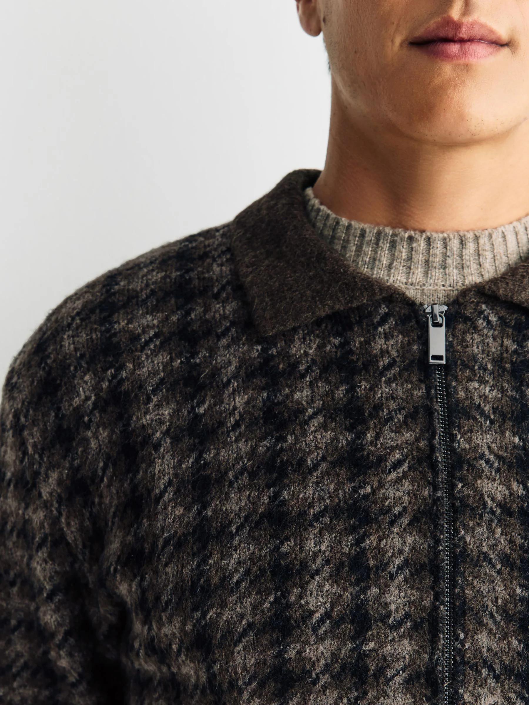 Brown Regular Fit Check Collared Zip-Through Cardigan with Wool